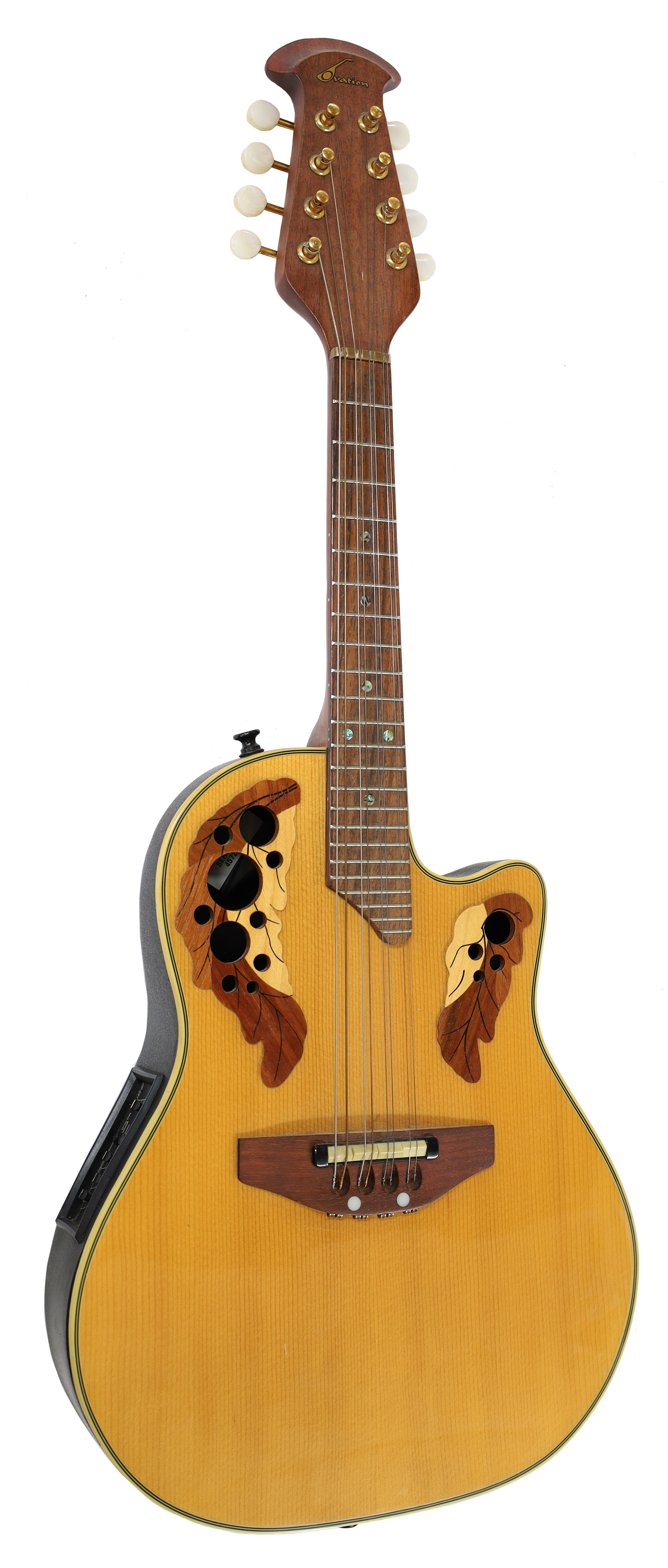 Ovation Celebrity electric mandolin, with shaped body, rounded back, spruce table with two foliate pierced sound holes, the maker's trademark label inscribed Model no. CS 148, ser. no. 4572362