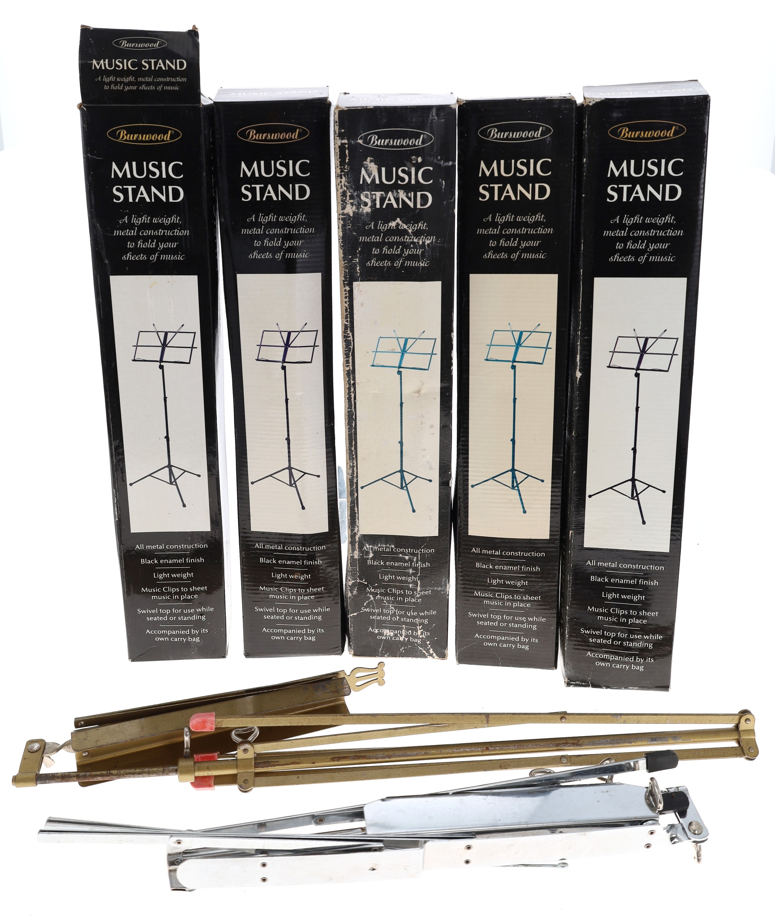 Five cased Burswood lightweight adjustable music stands; also twelve other folding music stands (17)