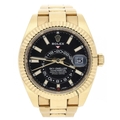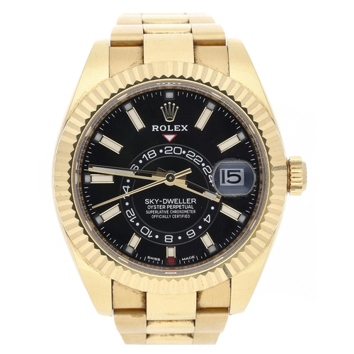 Rolex Oyster Perpetual Sky-Dweller 18ct gentleman's wristwatch, reference no. 326938, serial no. U095xxxx, black dial, gold fluted bi-directional bezel with three adjustment settings for time, quick-set hour and annual calendar, 18ct Oyster bracelet, 42mm