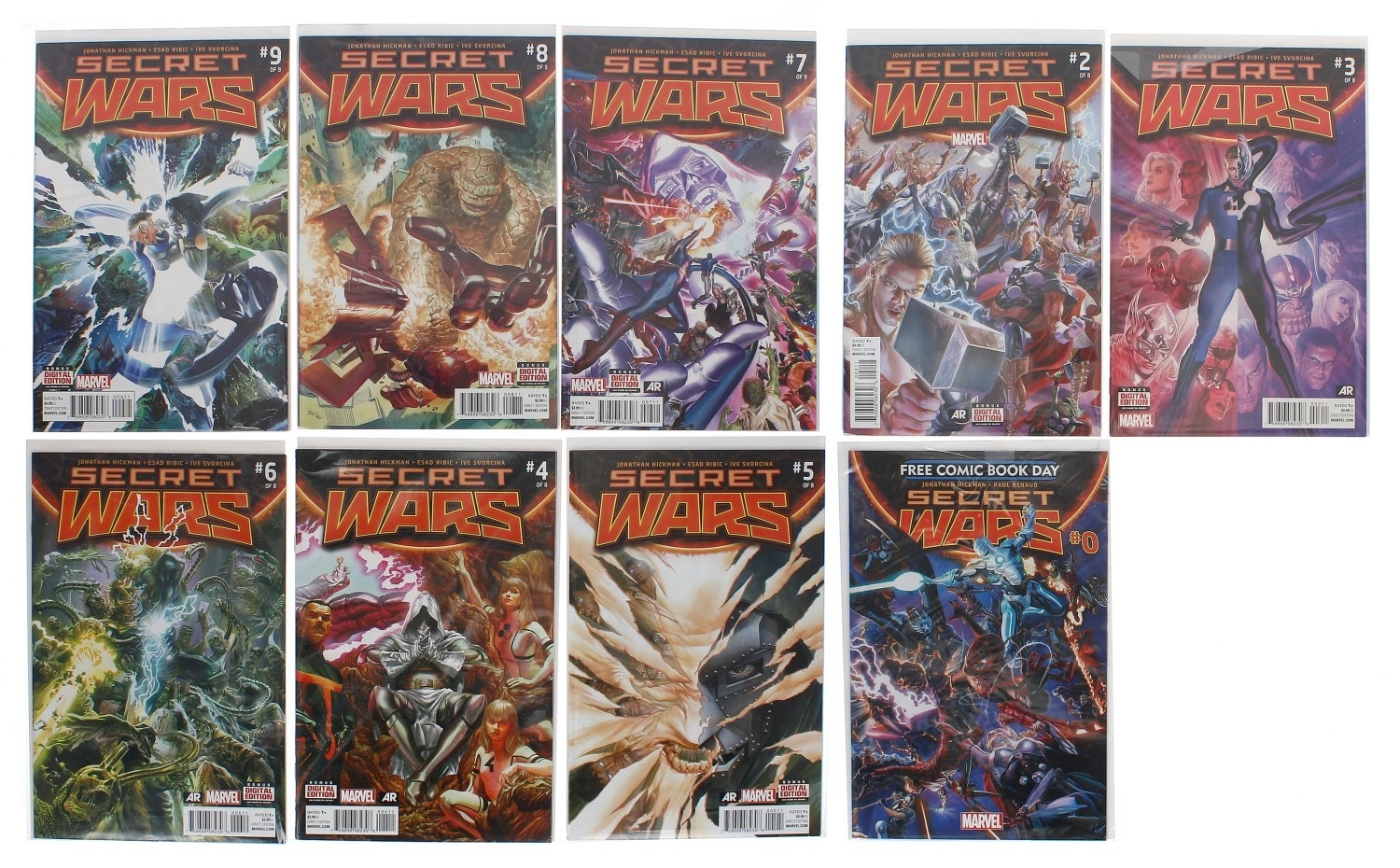 Marvel Comics, Secret Wars, circa 2014-2015, Volumes #0, #2, #3, #4, #5, #6, #7, #8 & #9, story by Jonathan Hickman, art by Esad Ribic & Alex Ross (9)