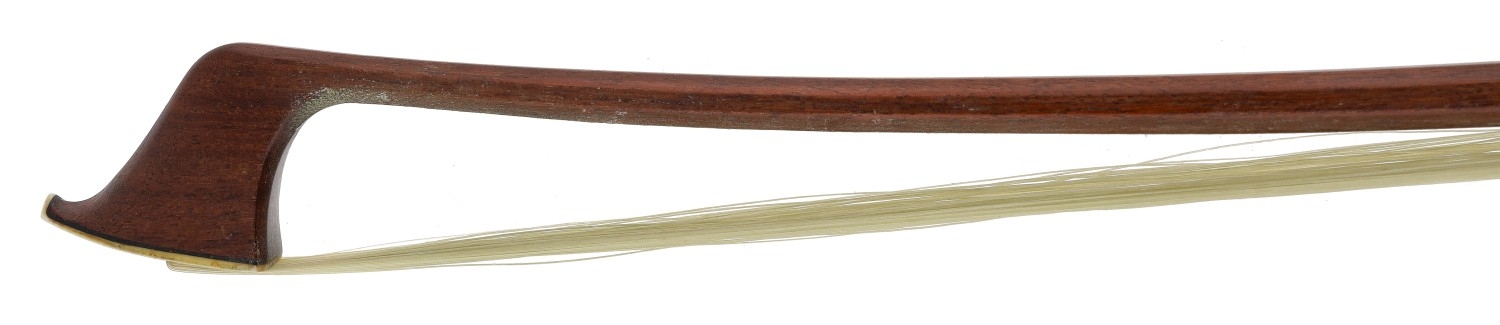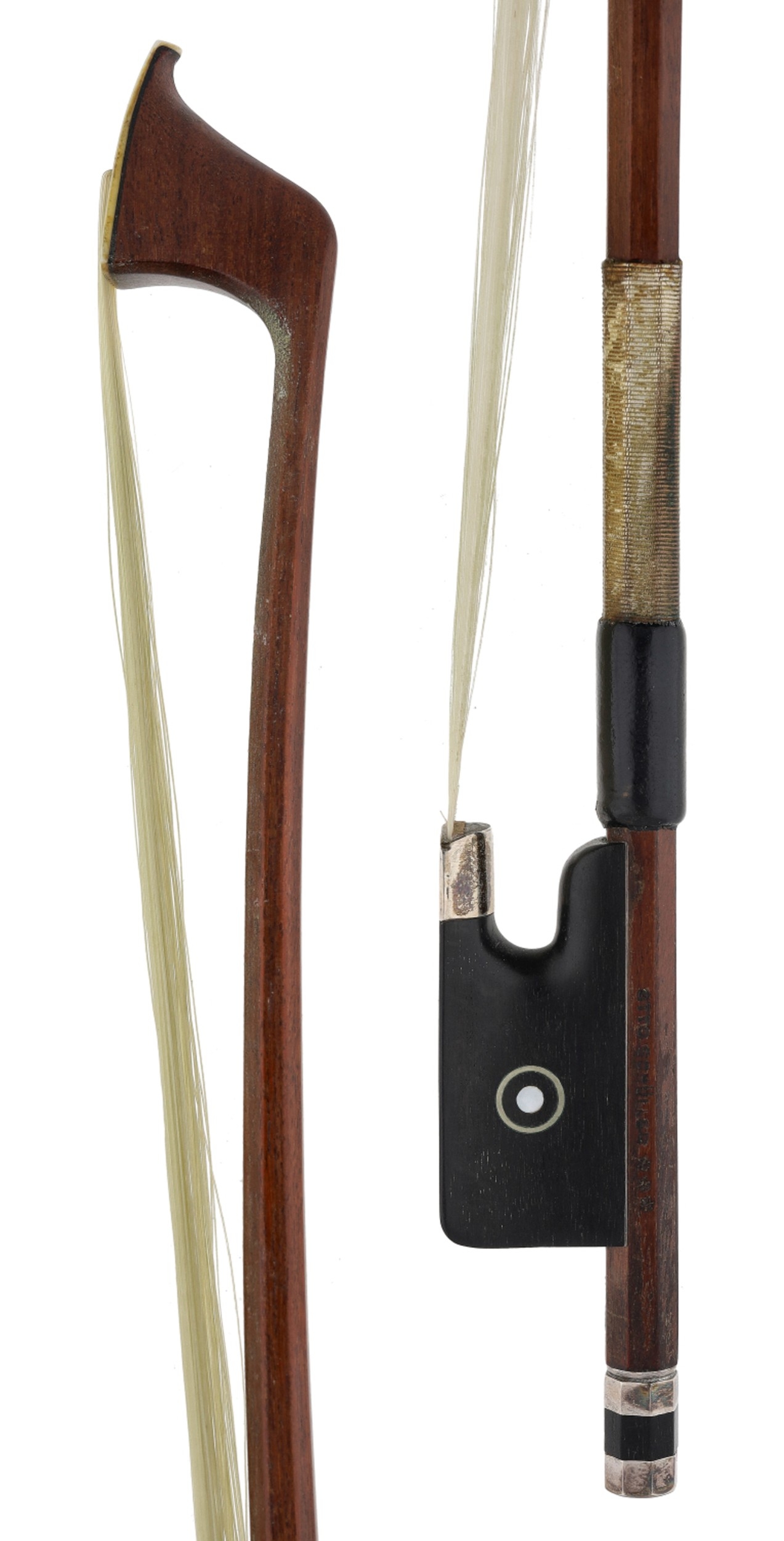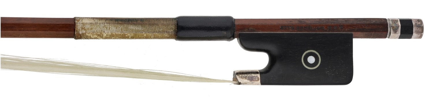 PRIVATE COLLECTION - German silver mounted violoncello bow by and stamped Otto Schuller***, the stick octagonal, the ebony frog inlaid with rings enclosing pearl eyes and the ebony adjuster with two silver bands, 78gm