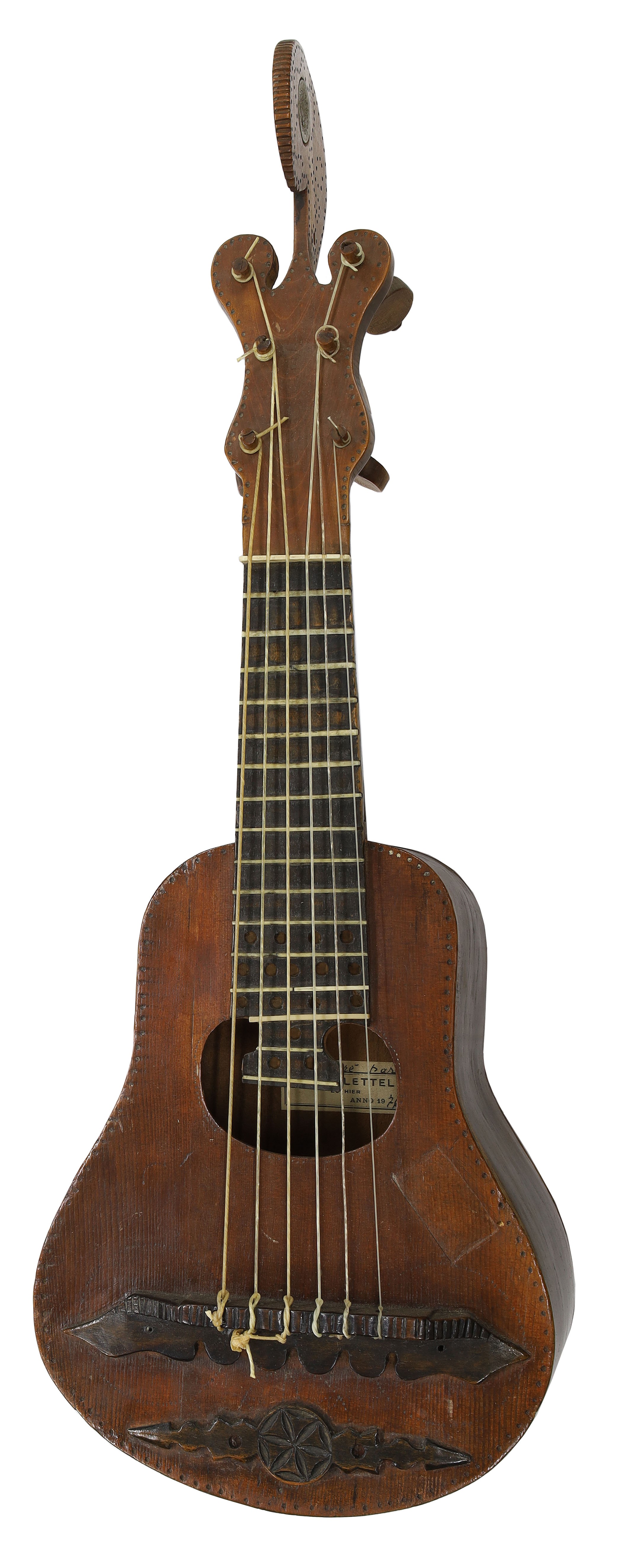 Mexican six string small Jarana type guitar, 19th century, bearing a repair label to the inner back, scale length 29cm