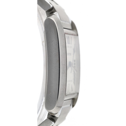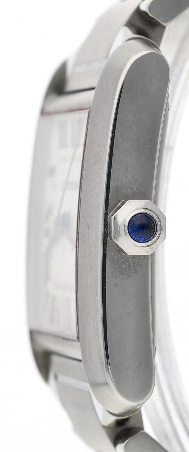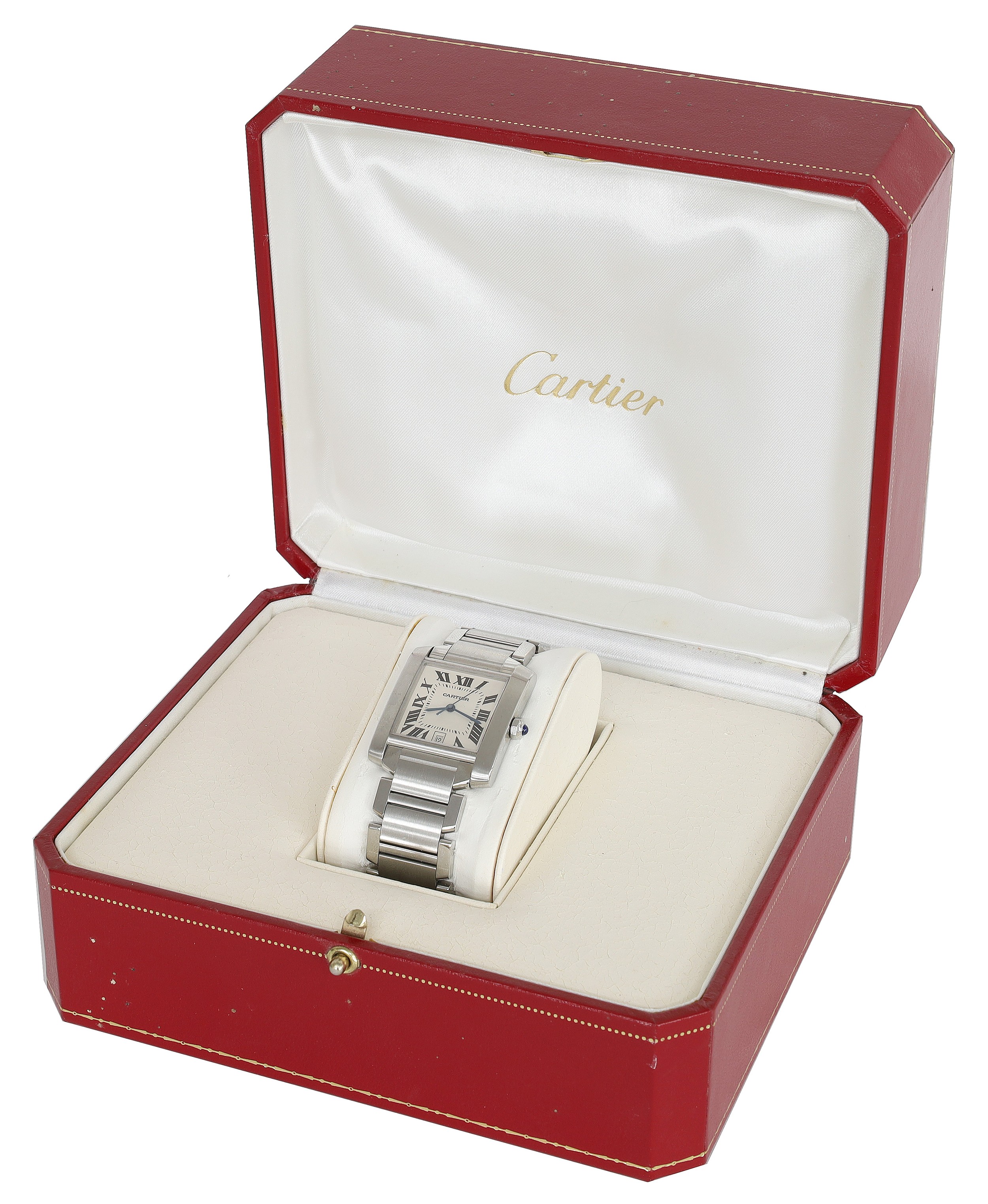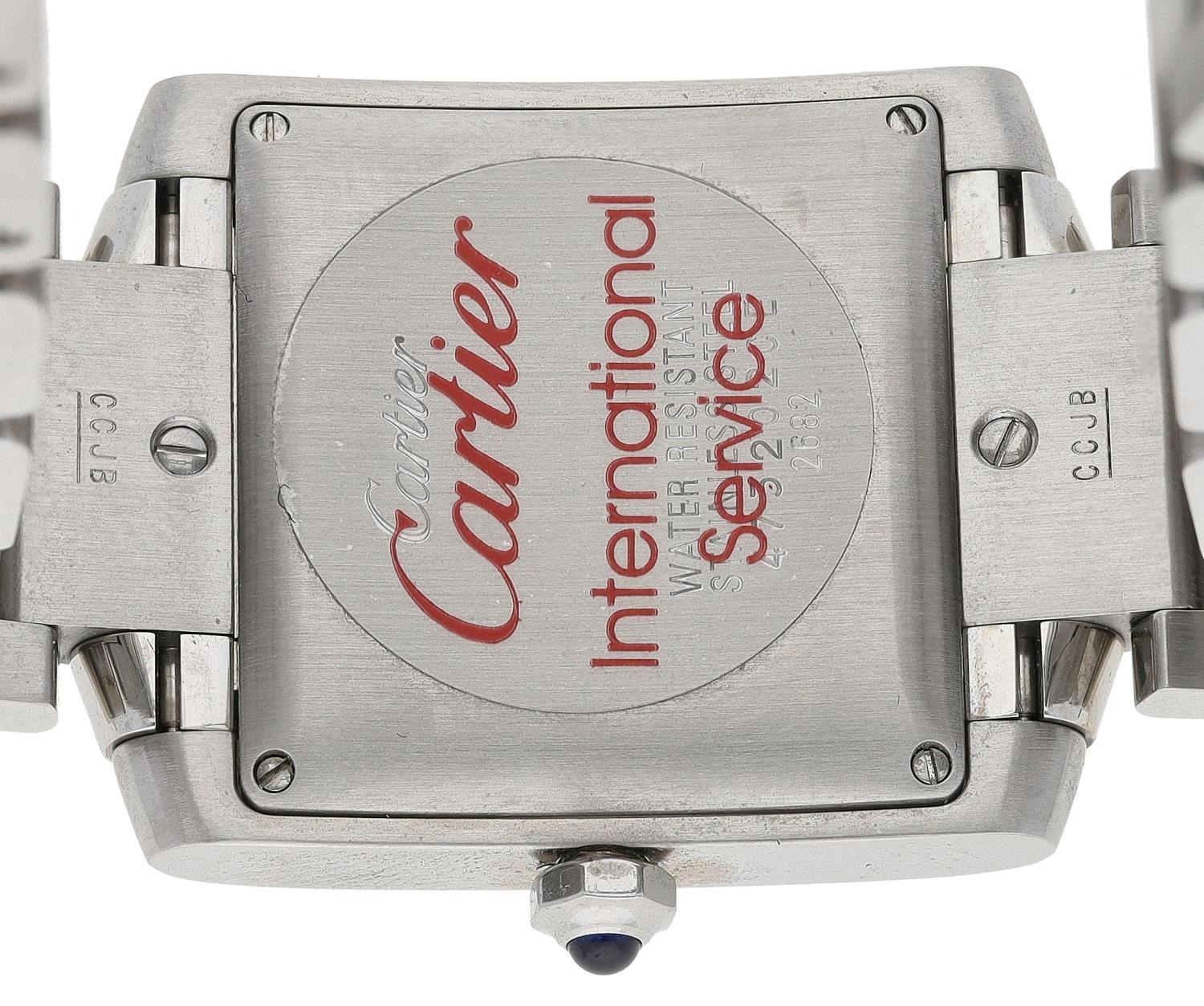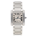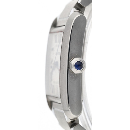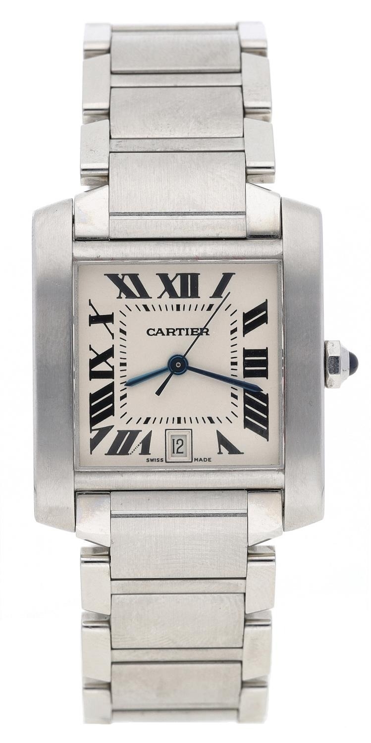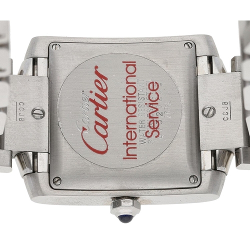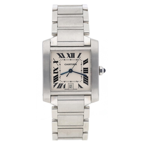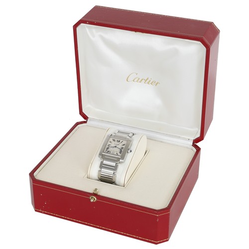 Cartier Tank Francais stainless steel wristwatch, reference no. 2682, serial no. 47320xxx, squared silvered dial with Roman numerals, secret signature at seven, inner minute markers, date aperture at the six position and blued steel hands, cabouchon crown, Cartier bracelet with signed butterfly clasp, quartz, 28mm x 32mm