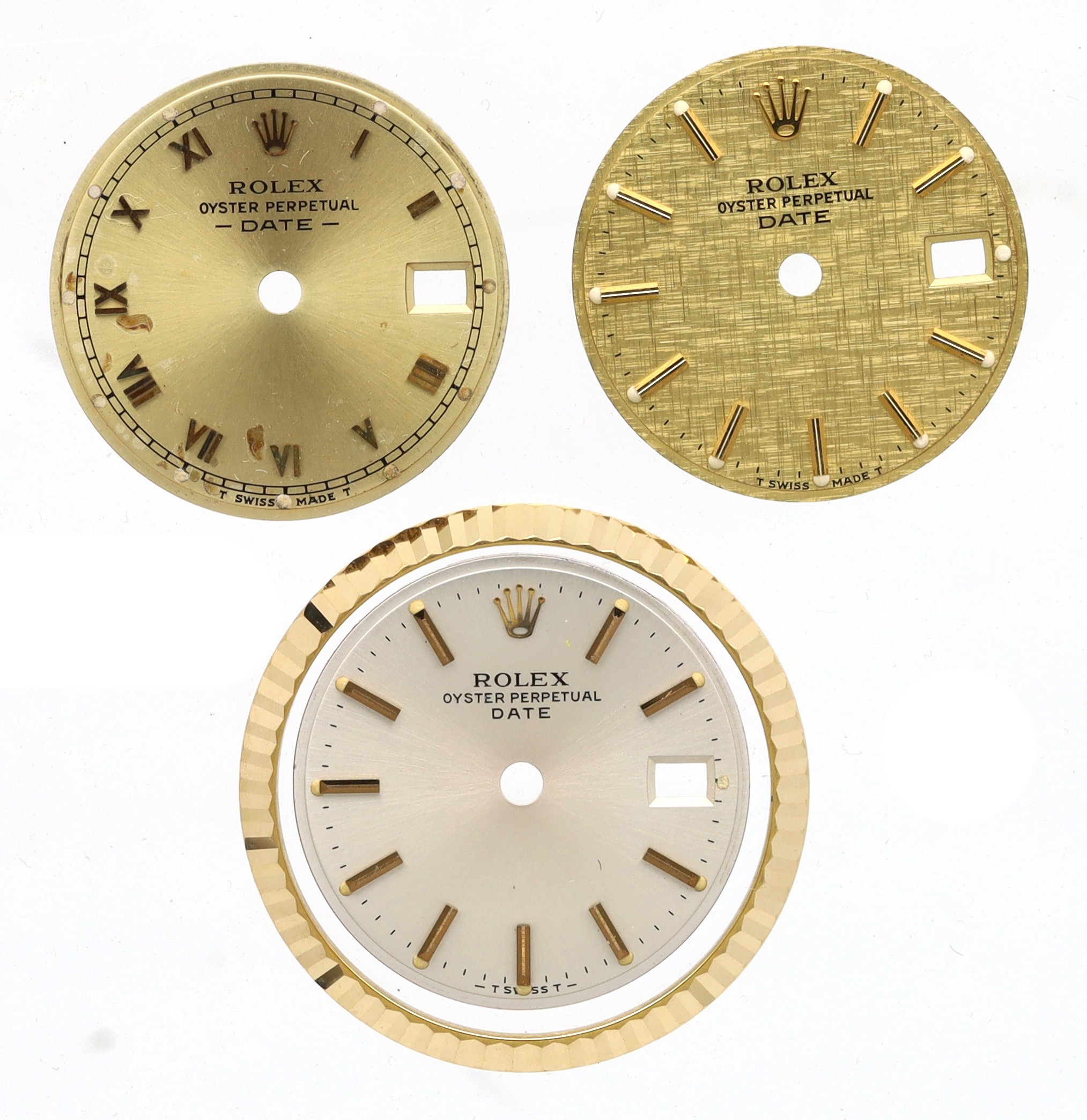 Rolex - Rolex Oyster Perpetual Date lady's wristwatch dial with bezel; together with two Rolex Oyster Perpetual Date ladies wristwatch dials (3)