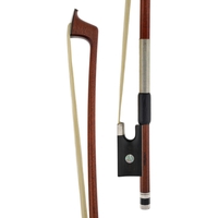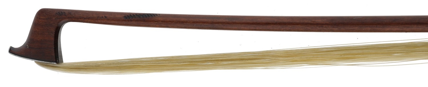 PRIVATE COLLECTION - English silver mounted violin bow by W.E. Hill & Sons, unstamped, the stick round, the ebony frog inlaid with pearl eyes and with a silver overlaid ebony adjuster, 60gm