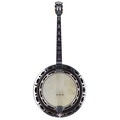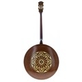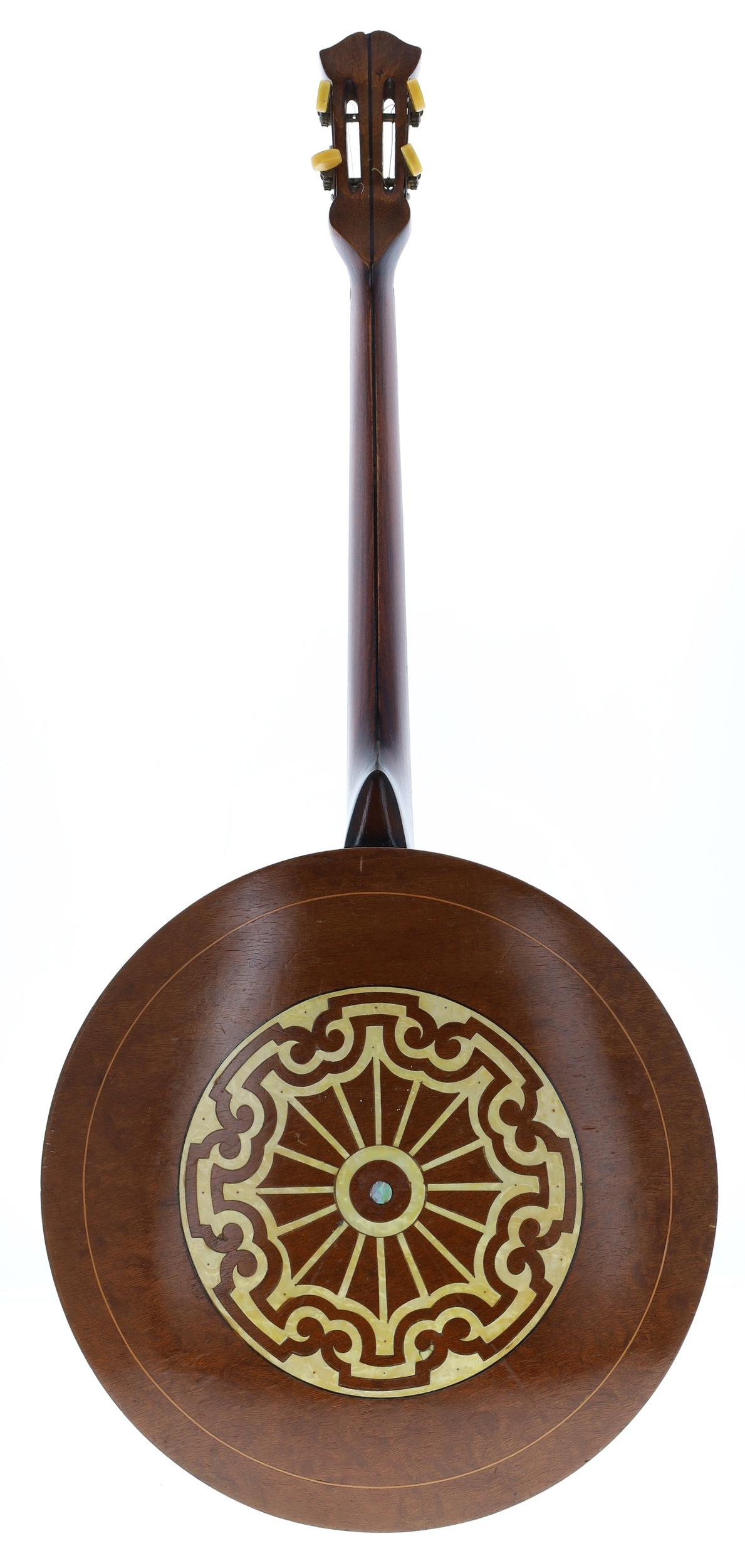 Good and rare Guarnierius Receveur four string tenor banjo circa 1930, the wooden back inlaid with a geometric mother of pearl circular design, with 8.5" skin and geometric mother of pearl inlay to the fretboard and open peg box inscribed Guarnierius Luthier, case