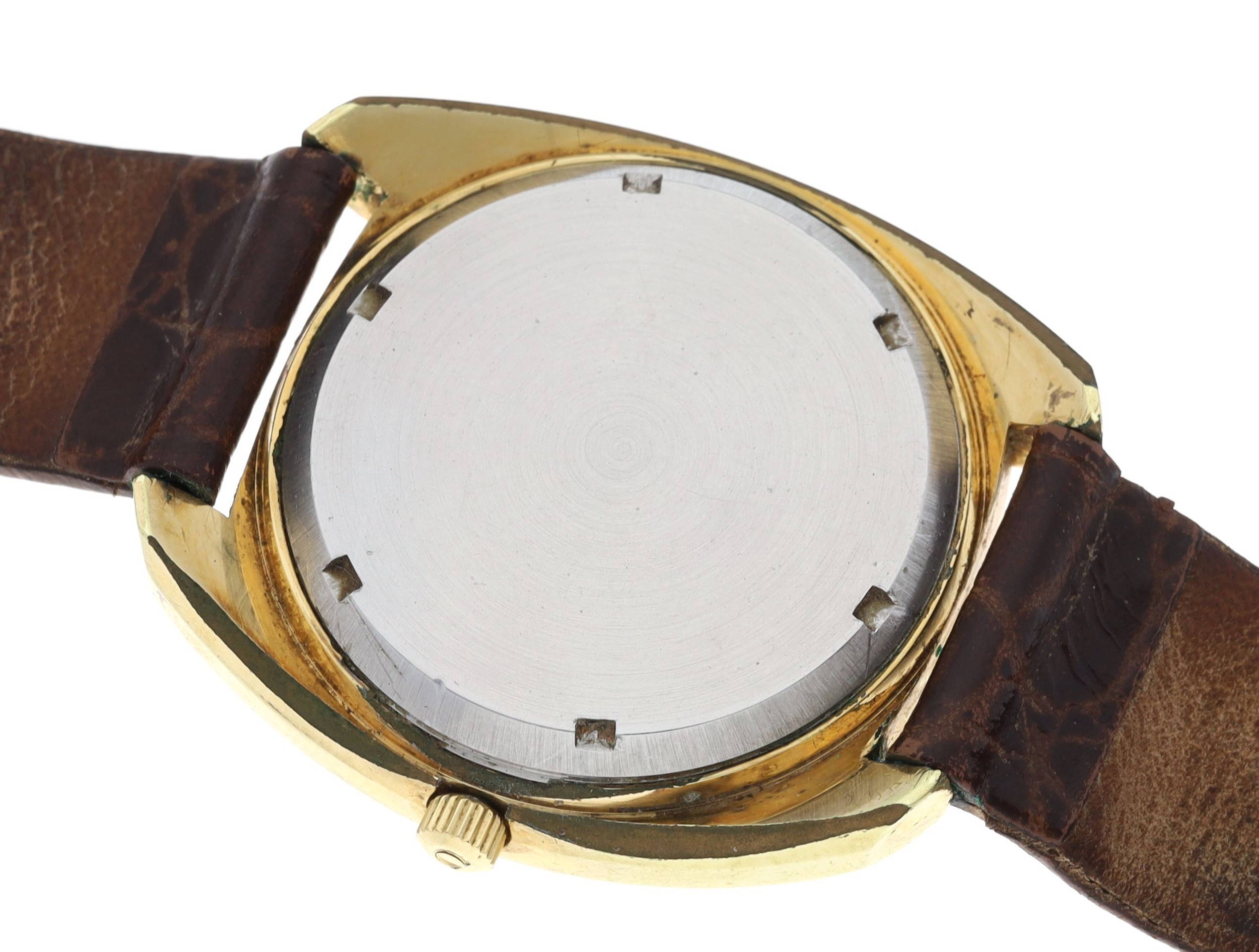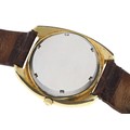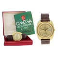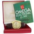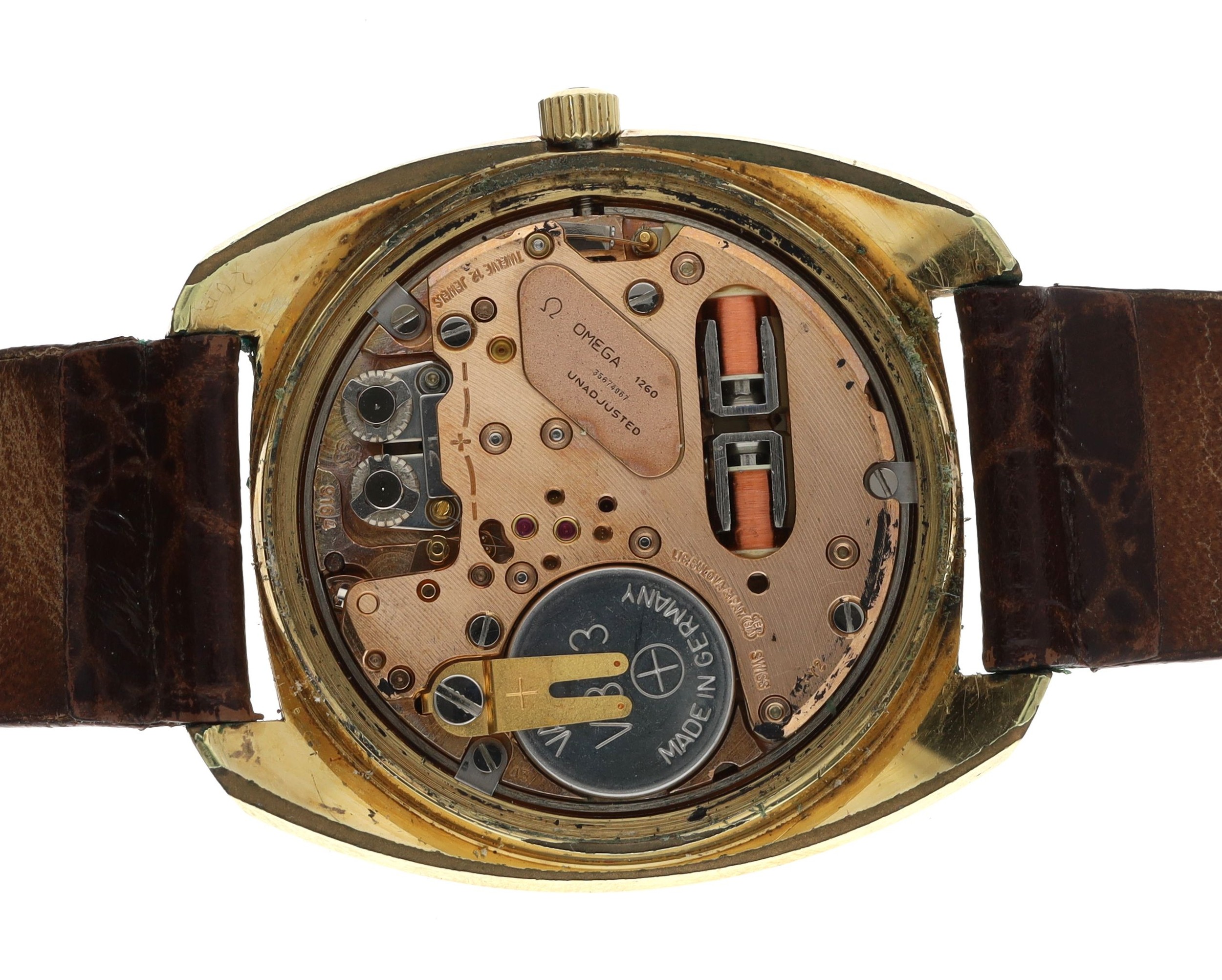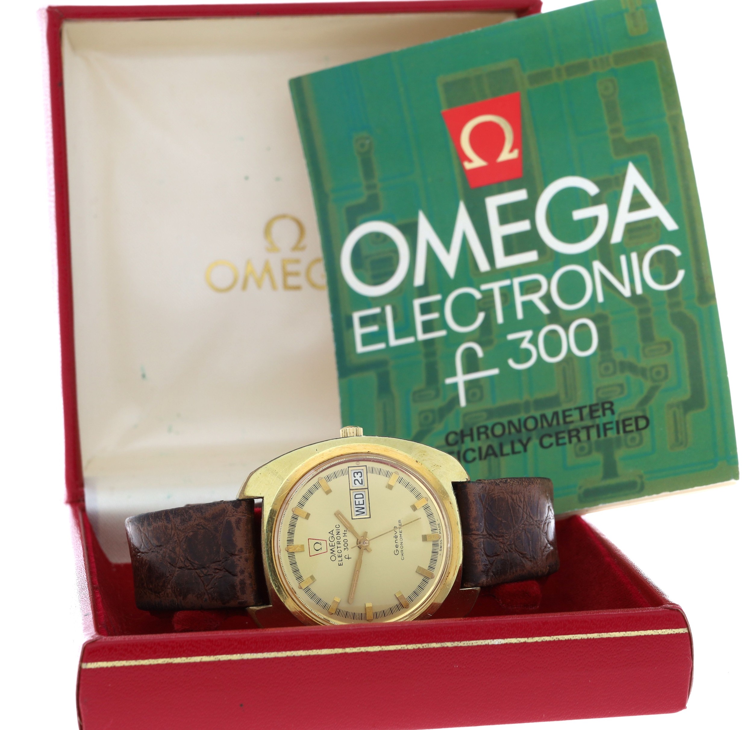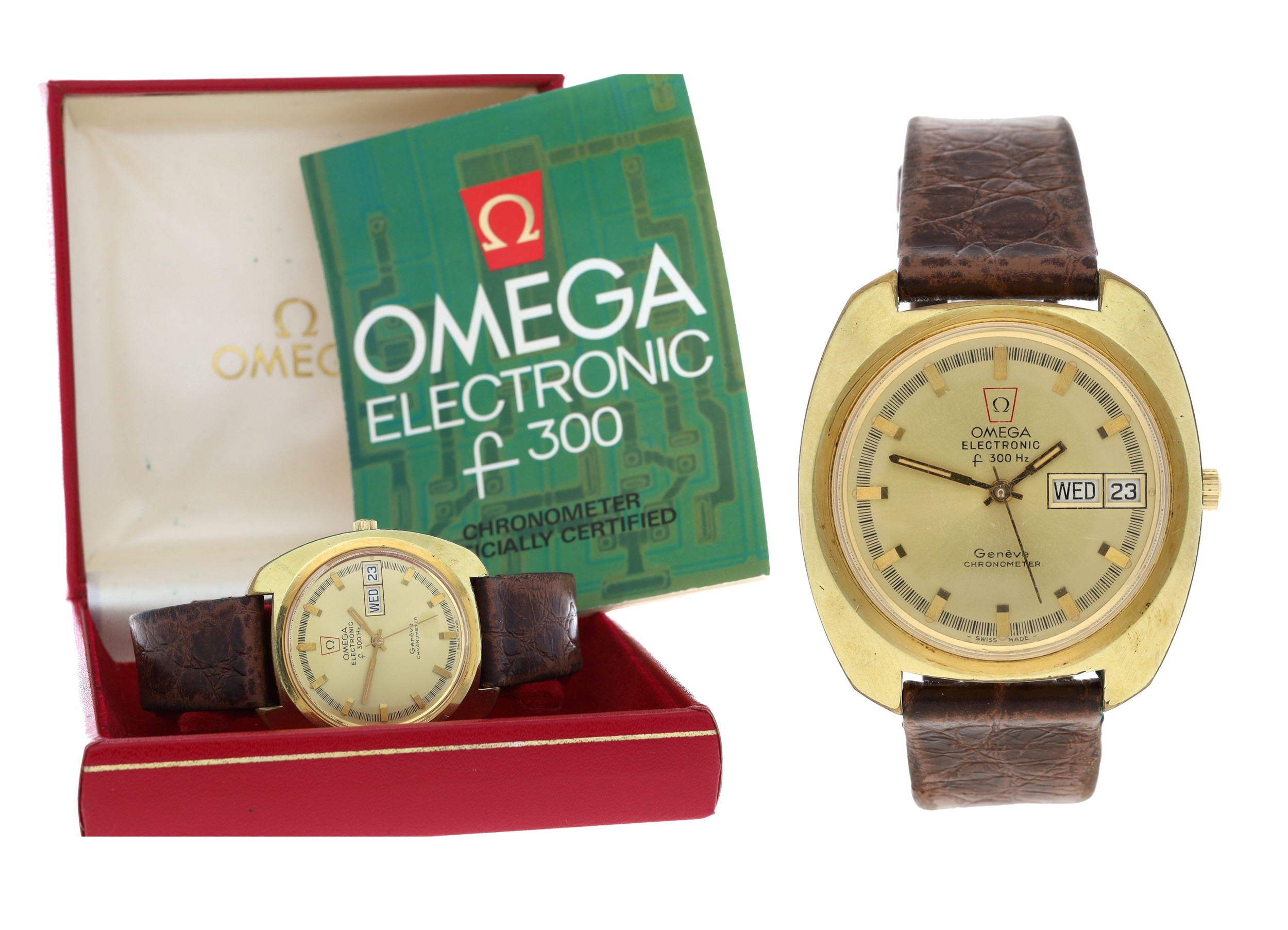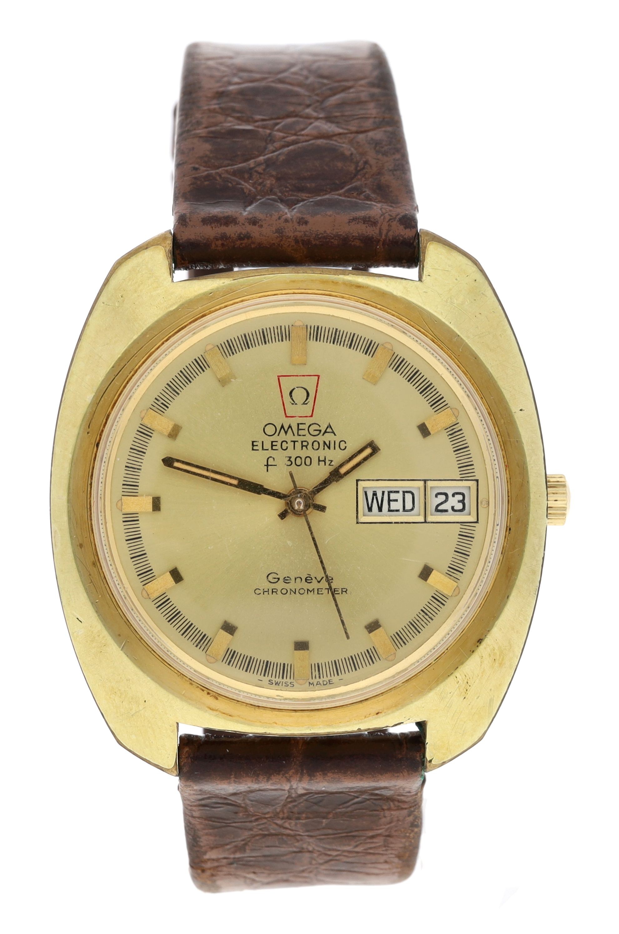 Omega Genéve Chronometer Electronic f300Hz gold plated and stainless steel gentleman's wristwatch, reference no. 198.031, serial no. 35674xxx, circa 1972, champagne dial, Omega crown, cal. 1260 12 jewel 'humming' tuning fork movement, signed case, modern brown leather strap, 38mm
