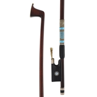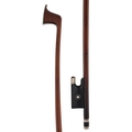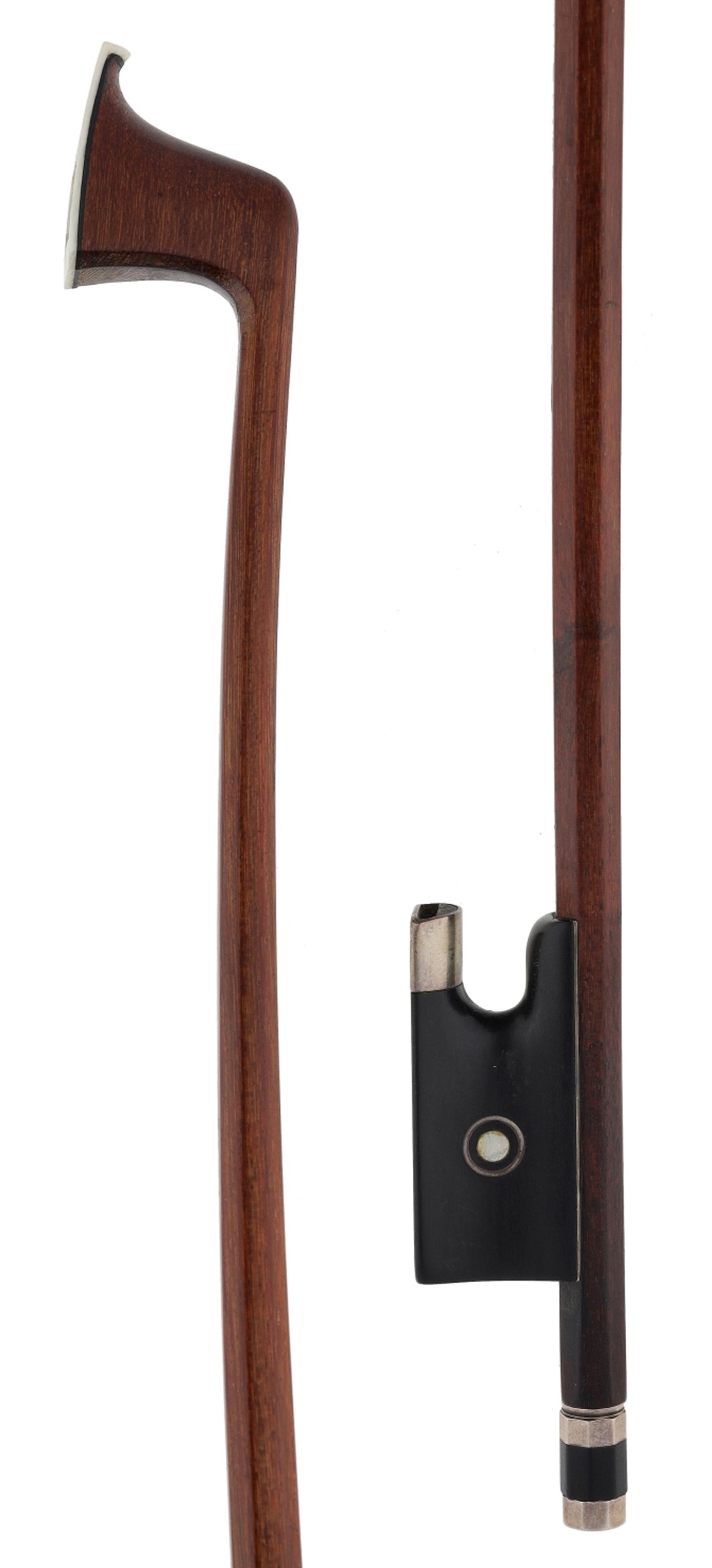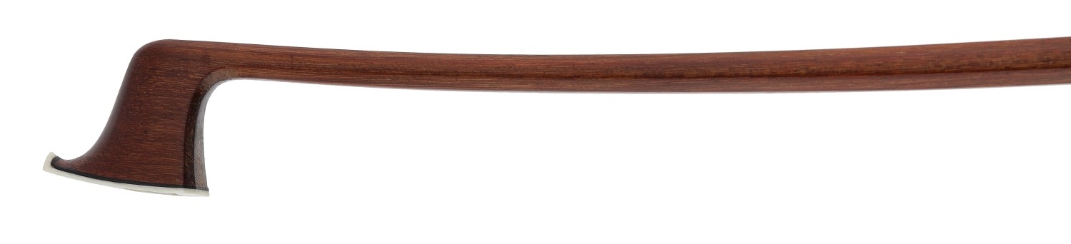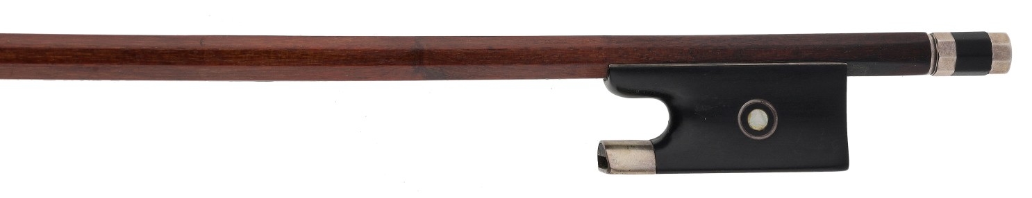 PRIVATE COLLECTION - German silver mounted violin bow by and stamped H.R. Pfretzschner to the audience side and Voirin on the players side, the frog inlaid with silver rings enclosing pearl eyes and the ebony adjuster with two silver bands, 55gm (without hair and lapping)