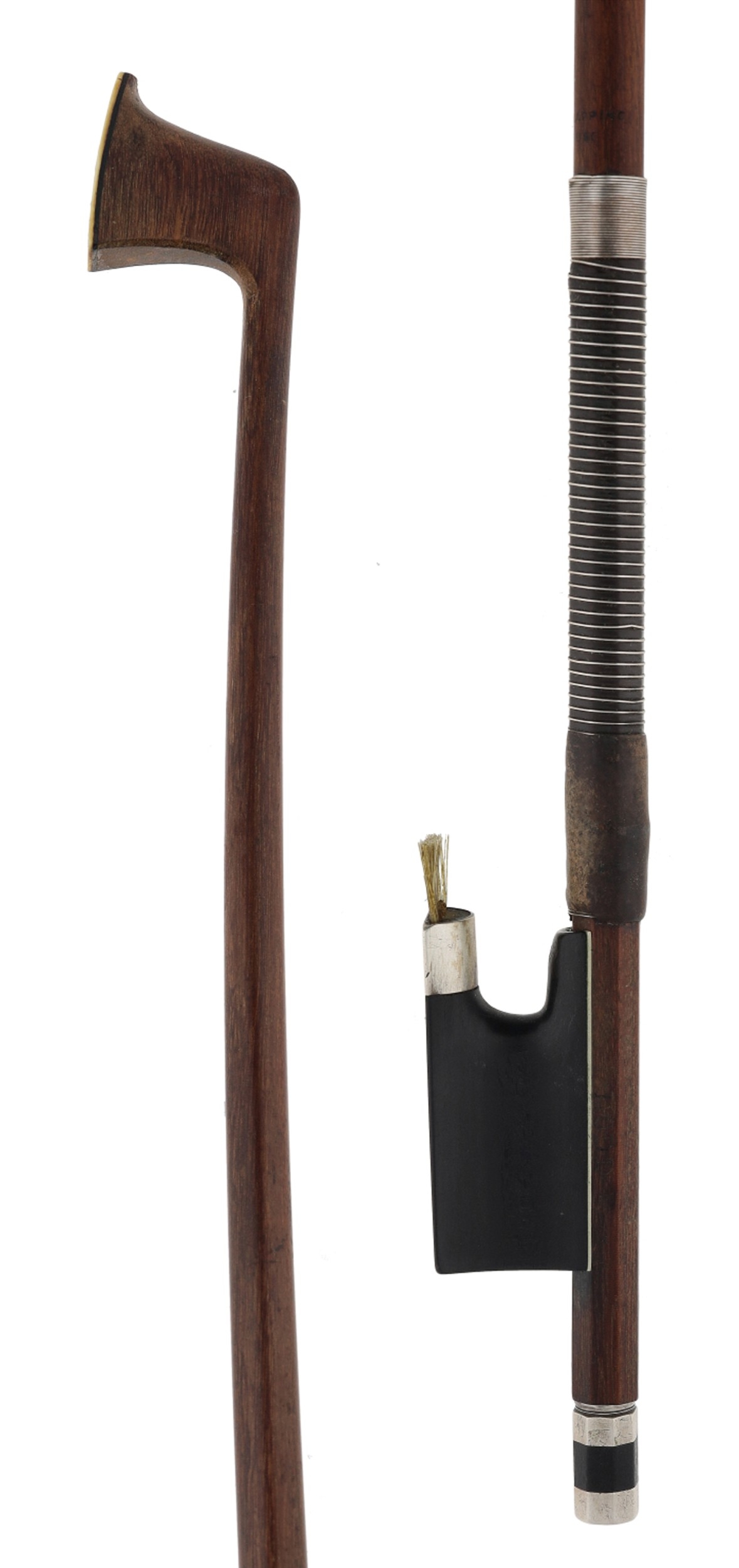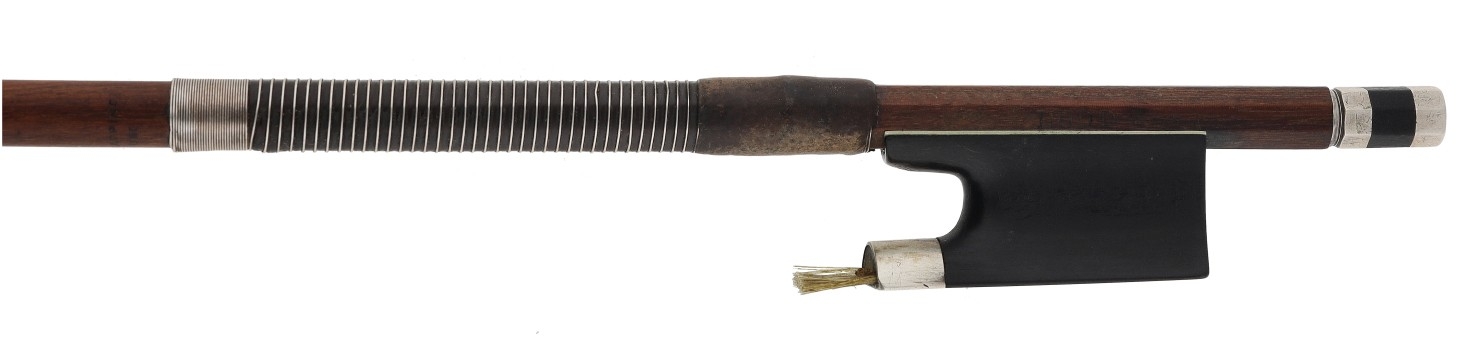 PRIVATE COLLECTION - Silver mounted violin bow stamped Dodd A280271 on the handle and on the plain ebony frog, the ebony adjuster with two silver bands, 53gm (without hair)