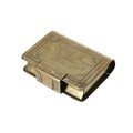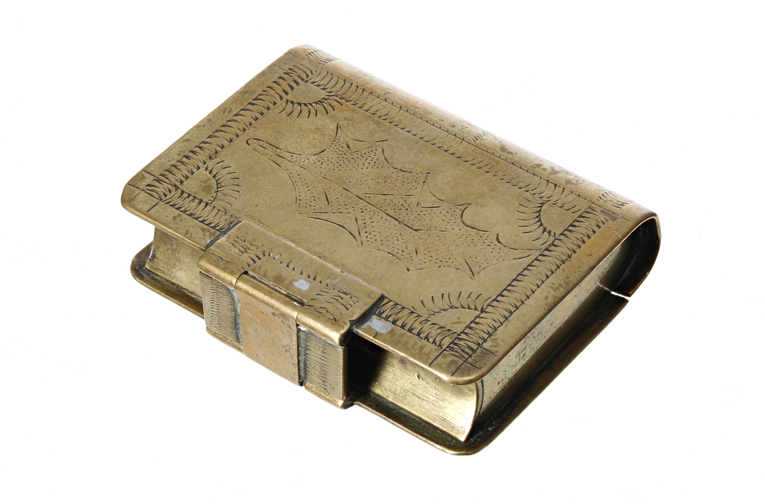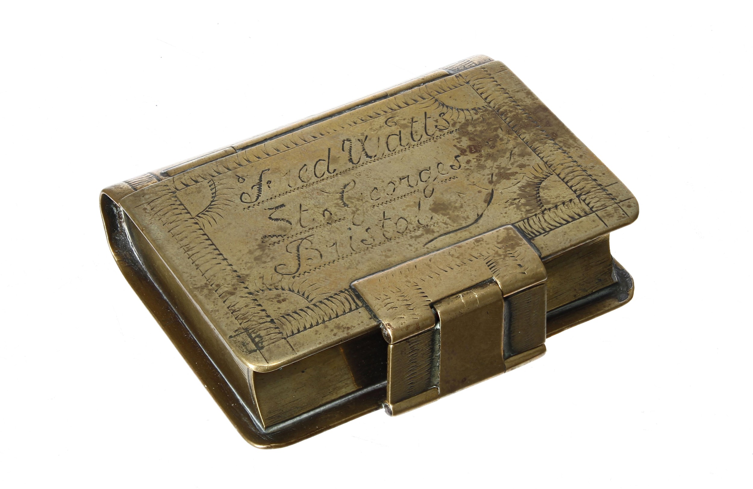 19th century brass snuff box in the form of a book, with engraved borders, inscribed 'Fred Watts, St Georges, Bristol' opposite a leaf, 3" x 2.25"