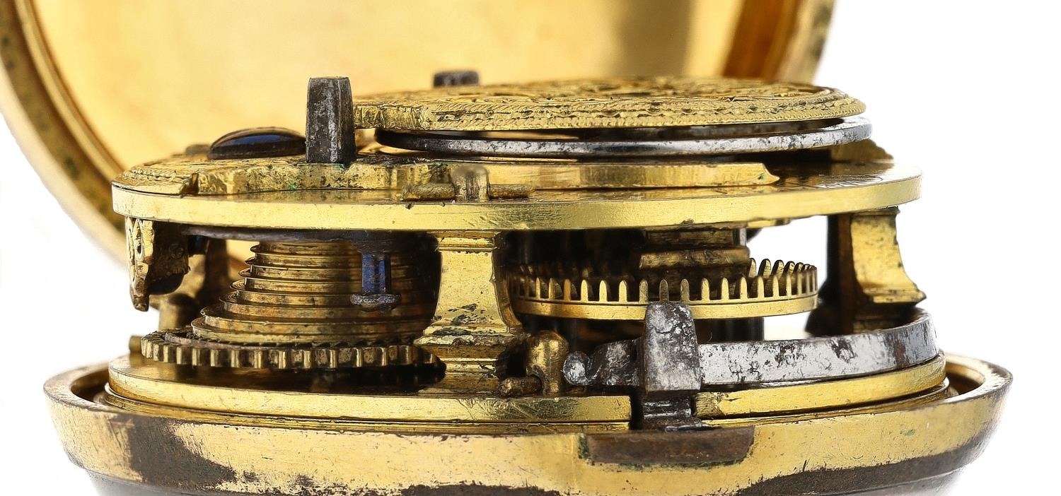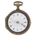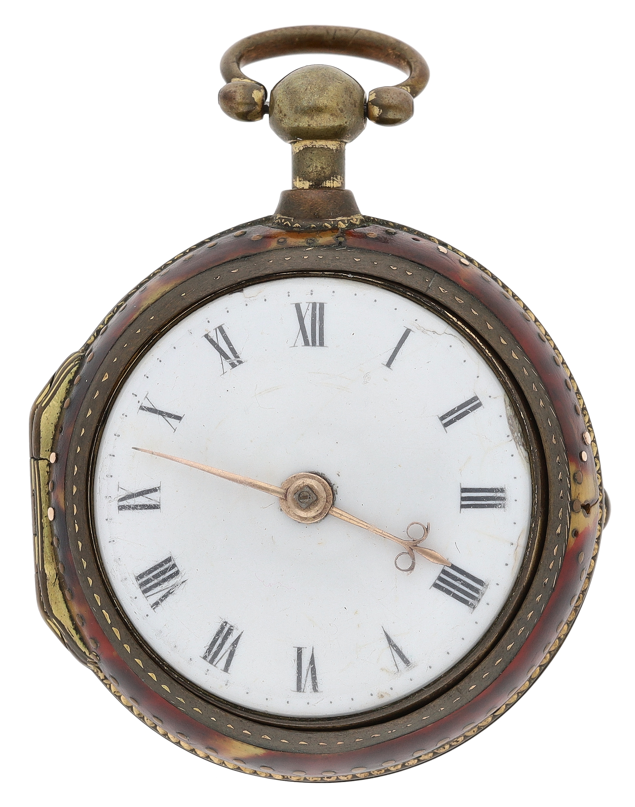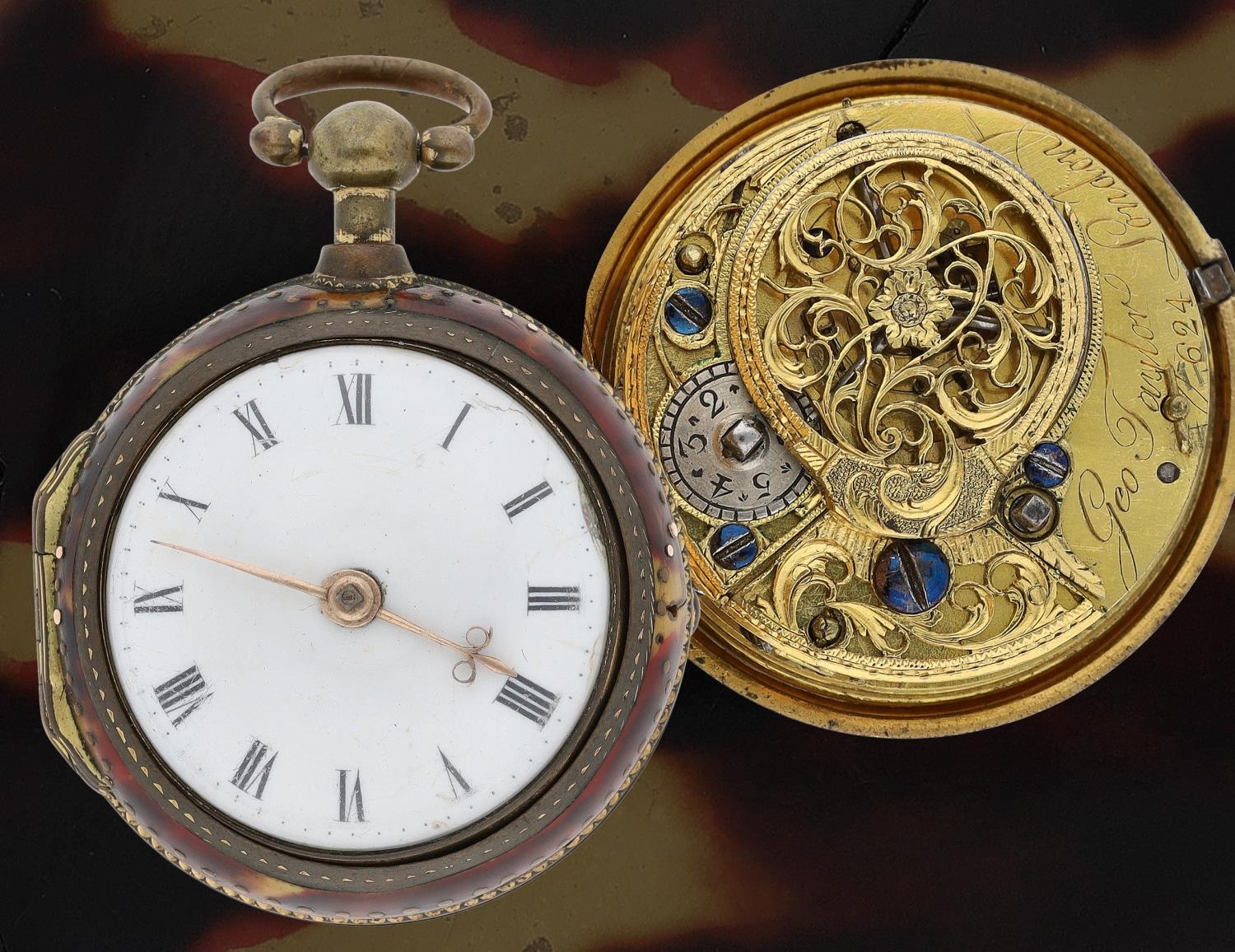 George Taylor, London - English 18th century gilt metal and tortoiseshell verge pocket watch, circa 1770, No. 624, signed fusee movement with three-arm balance, foliate pierced balance cock, silver regulating dial and square baluster pillars, enamel Roman numeral dial with outer minute markers, gold beetle and poker hands, bulls eye glass, tortoiseshell outer case with pin work decoration, with a shagreen outer protective case, case maker 'I.R', 45mm