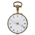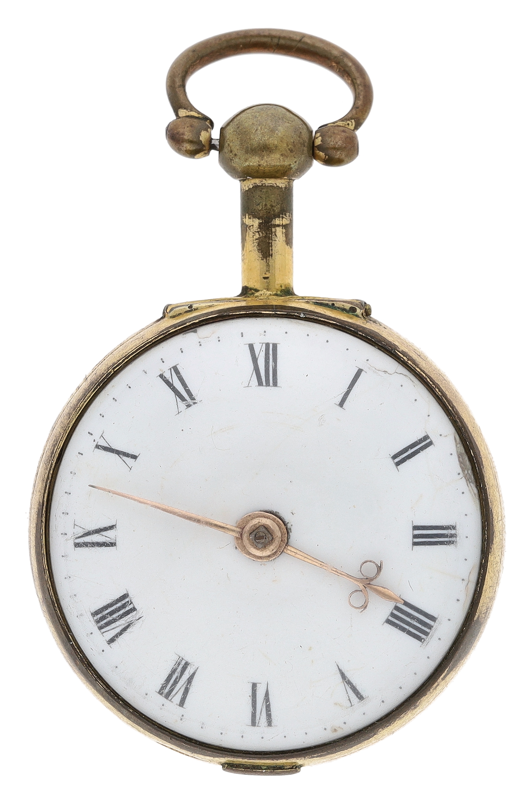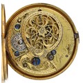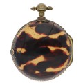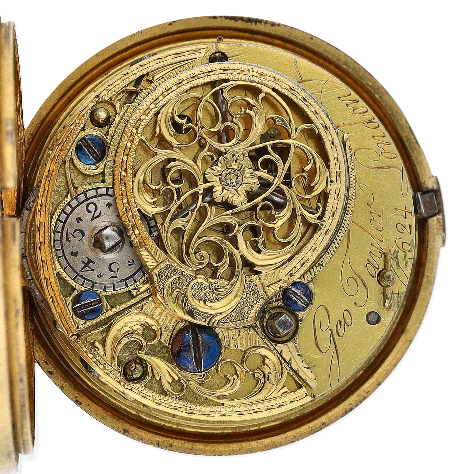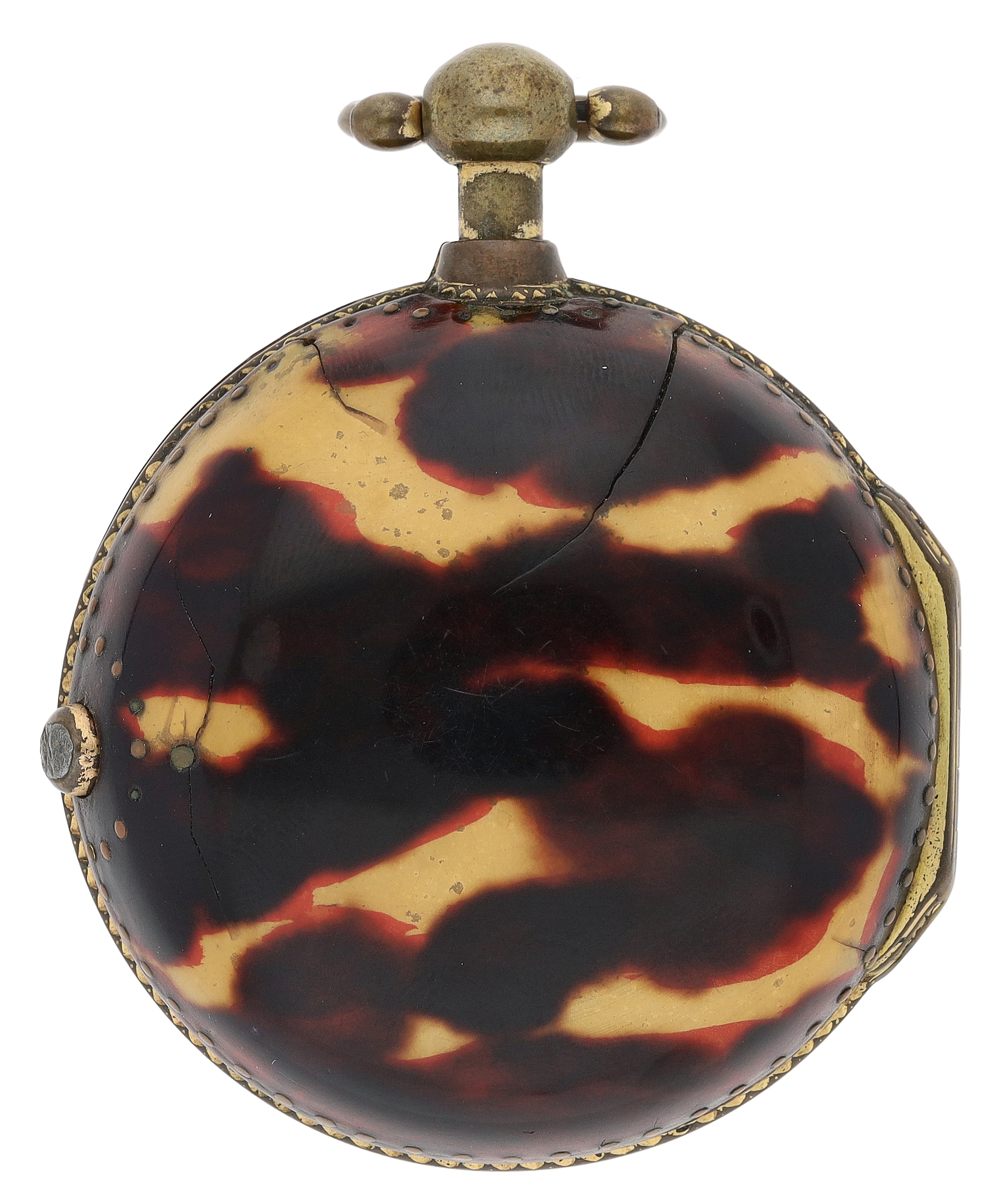 George Taylor, London - English 18th century gilt metal and tortoiseshell verge pocket watch, circa 1770, No. 624, signed fusee movement with three-arm balance, foliate pierced balance cock, silver regulating dial and square baluster pillars, enamel Roman numeral dial with outer minute markers, gold beetle and poker hands, bulls eye glass, tortoiseshell outer case with pin work decoration, with a shagreen outer protective case, case maker 'I.R', 45mm