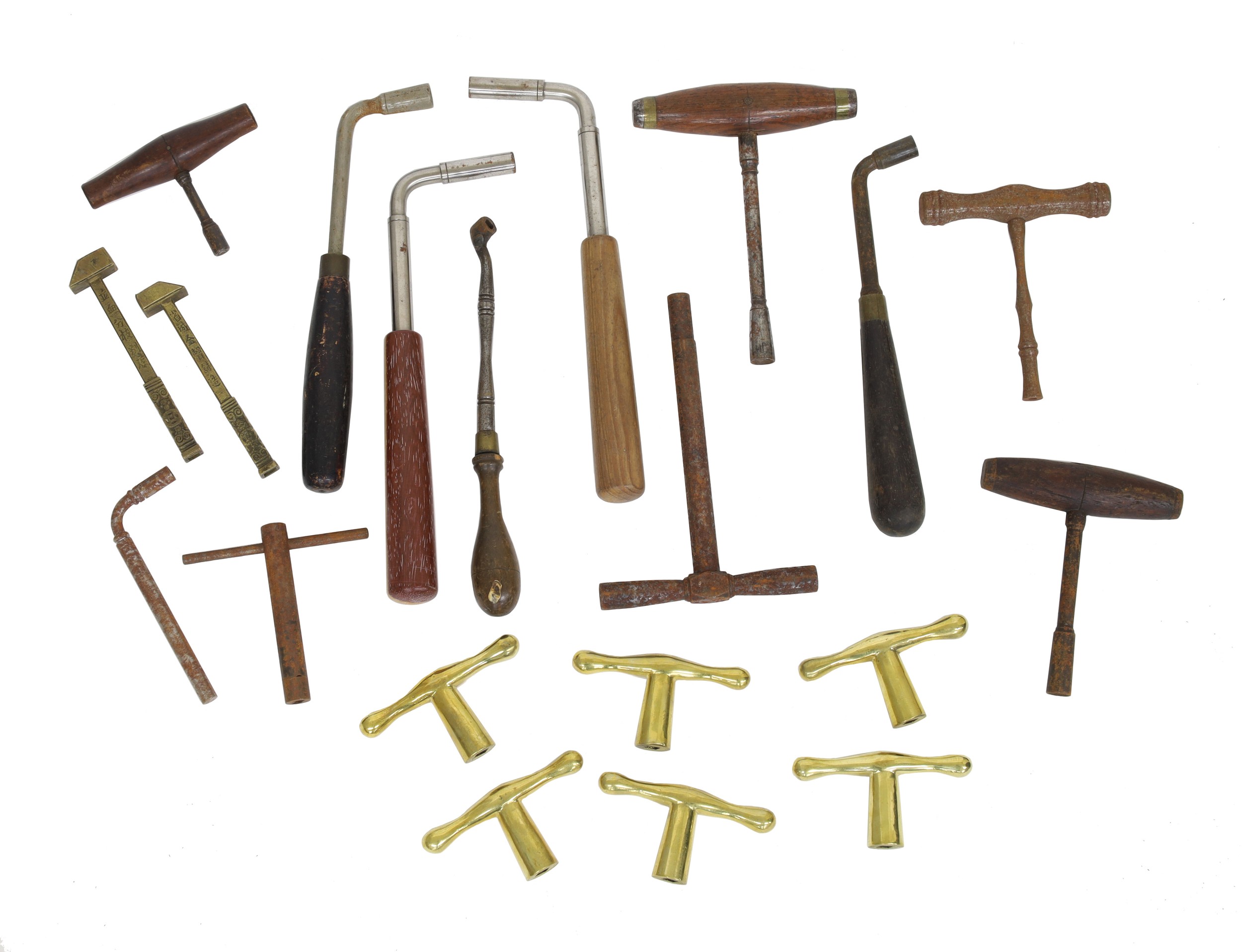 Fourteen various keyboard tuning hammers; also eight timpani tuning keys etc