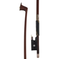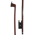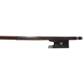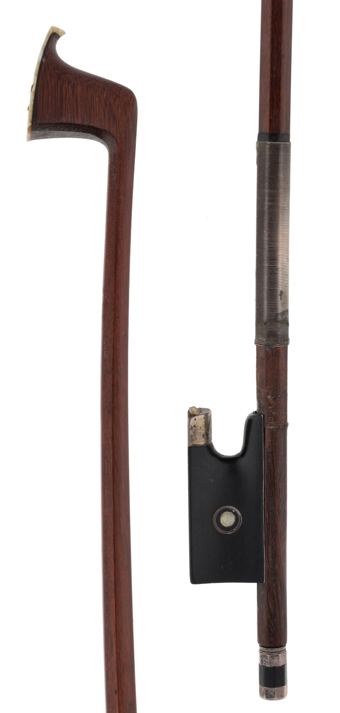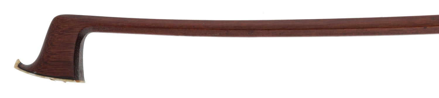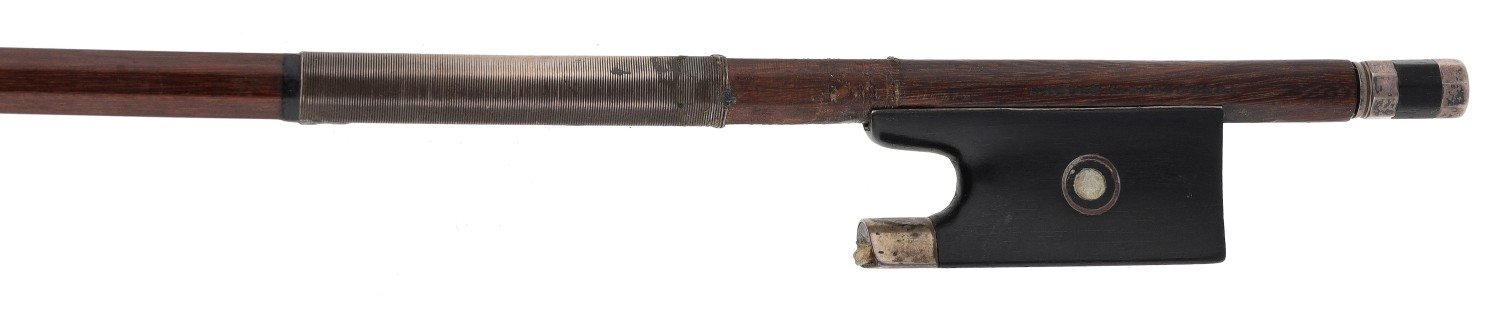 PRIVATE COLLECTION - German silver mounted violin bow by and stamped *Albert C. Schuster*, the stick octagonal, the ebony frog inlaid with silver rings enclosing pearl eyes and the ebony adjuster with two silver bands, 55gm (without hair)