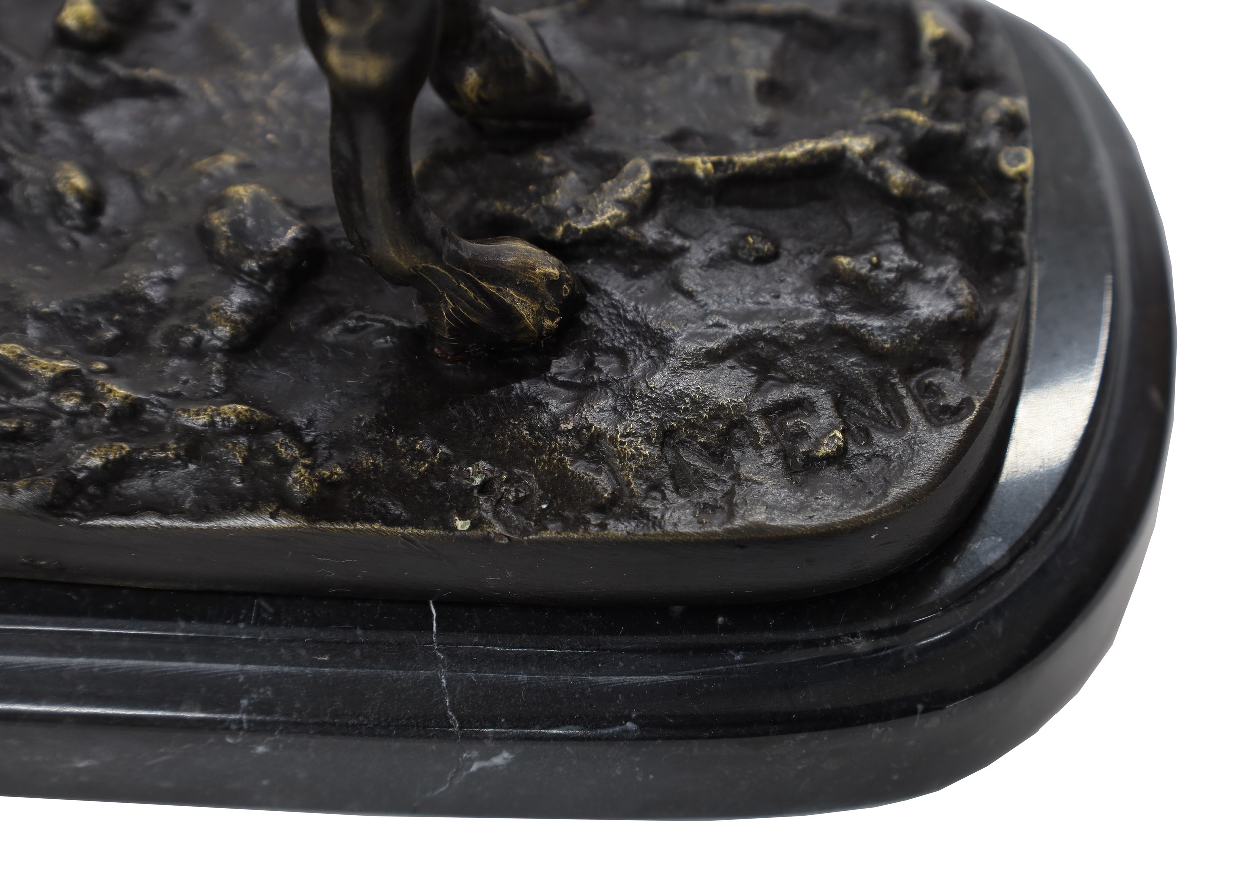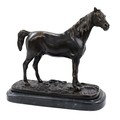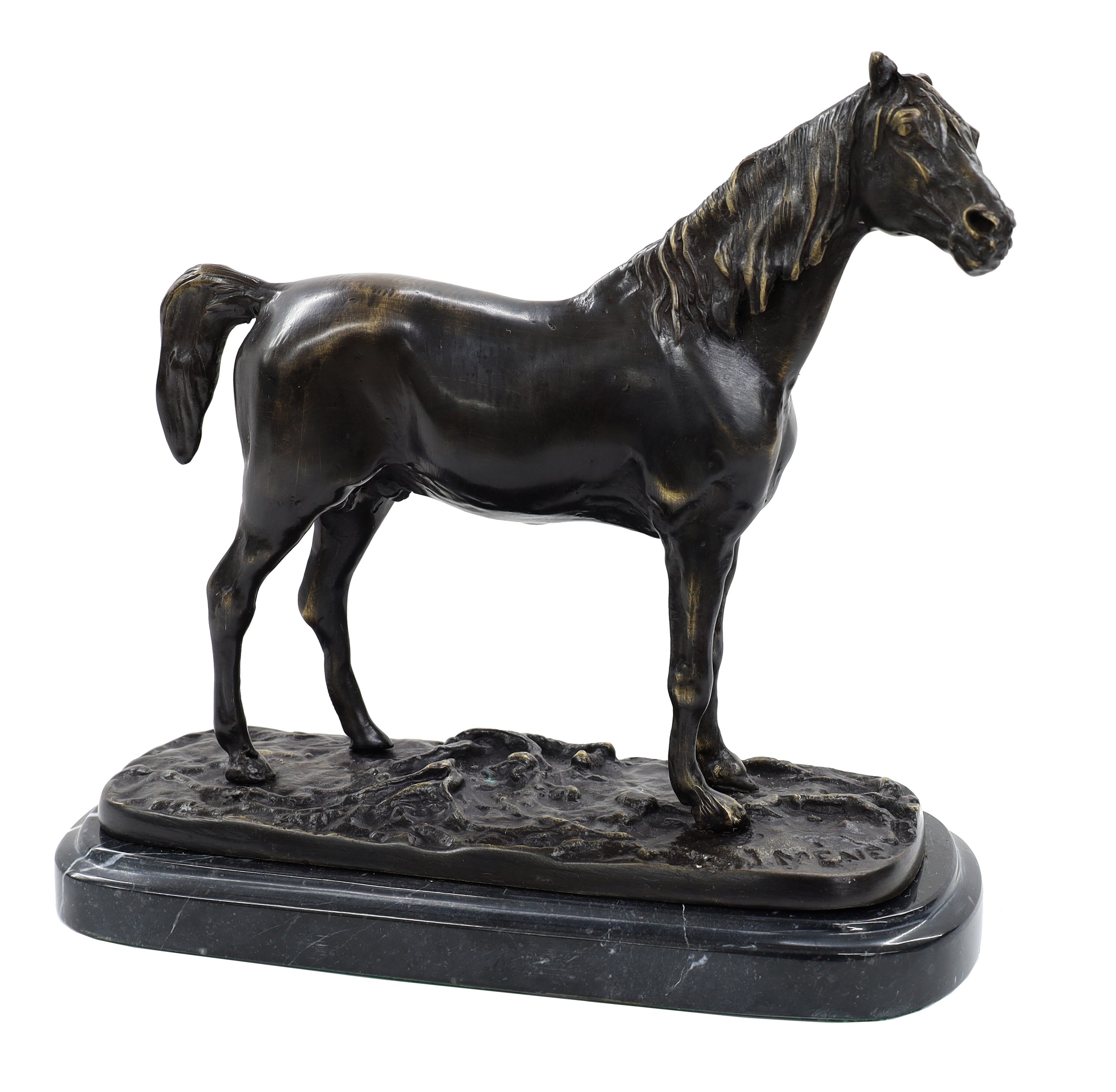 After Pierre Jules Mene (French 1810-1879), a bronze figural study of a horse, signed in the casting of the naturalistic base and mounted on a veined marble plinth, 8" high