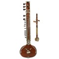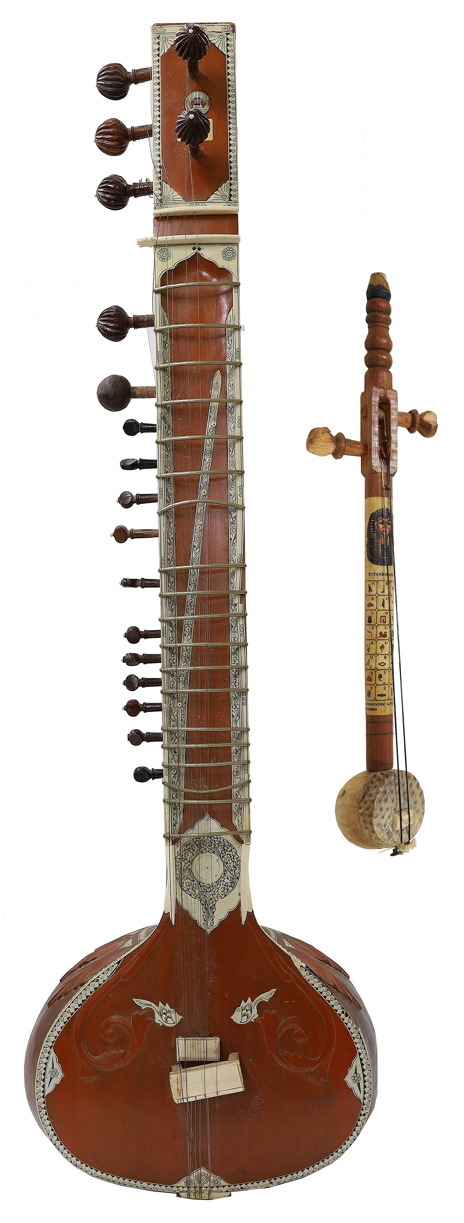 20th century sitar with faux Vizagapatam style mounts, 50.5" long overall; also a two stringed pitch pine ethnic fiddle (2)