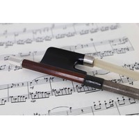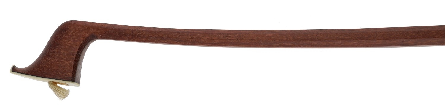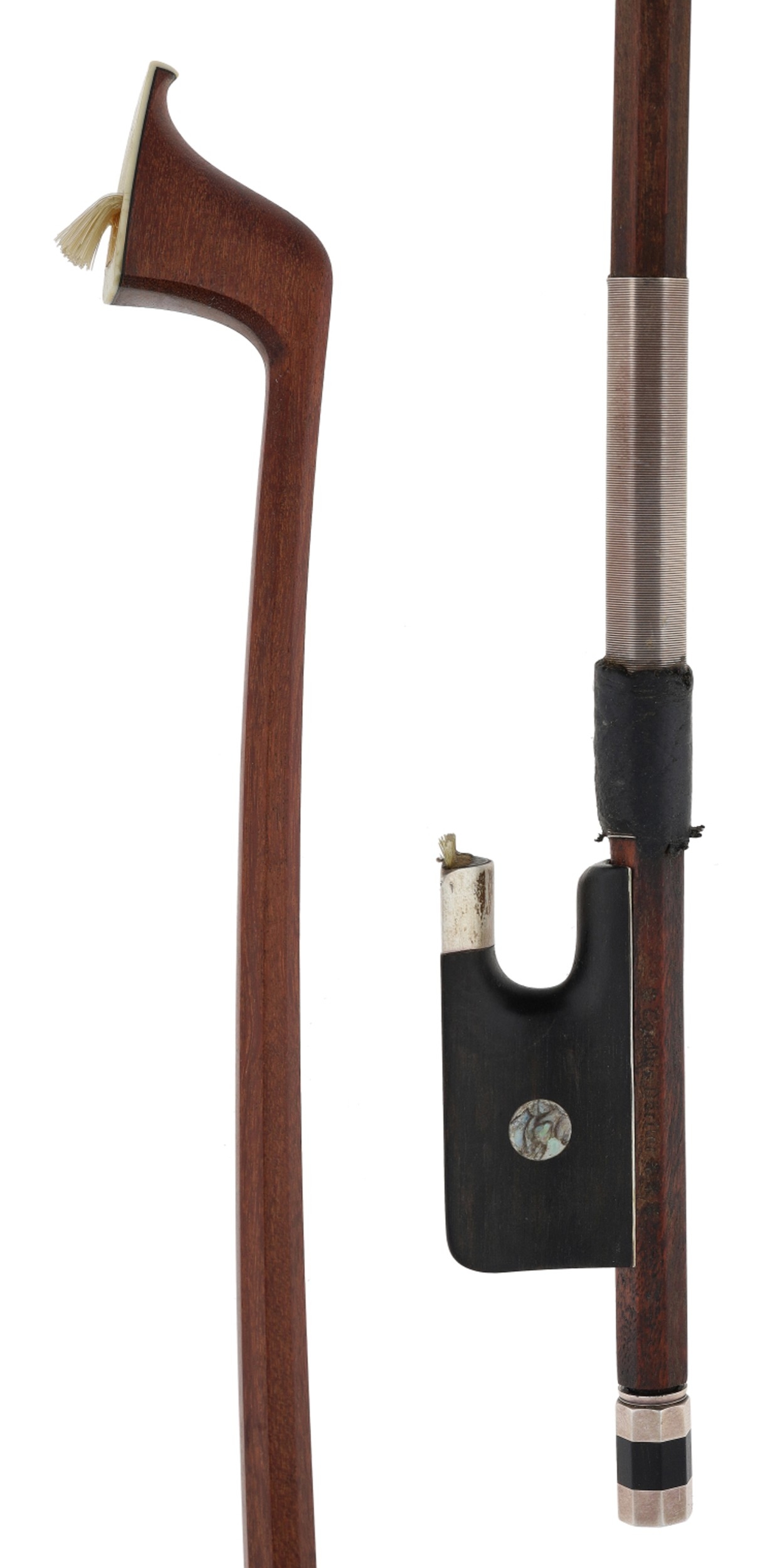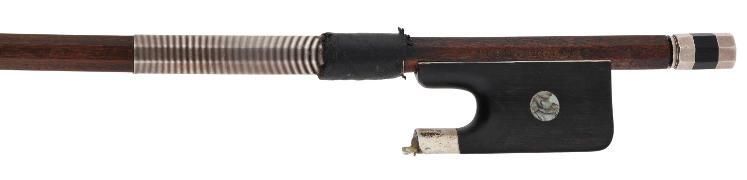 PRIVATE COLLECTION - German silver mounted violoncello bow by and faintly stamped Egidius Dorfler***, the stick octagonal, the ebony frog inlaid with pearl eyes and the ebony adjuster with two silver bands, 75gm (without hair)