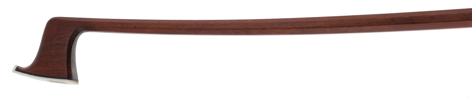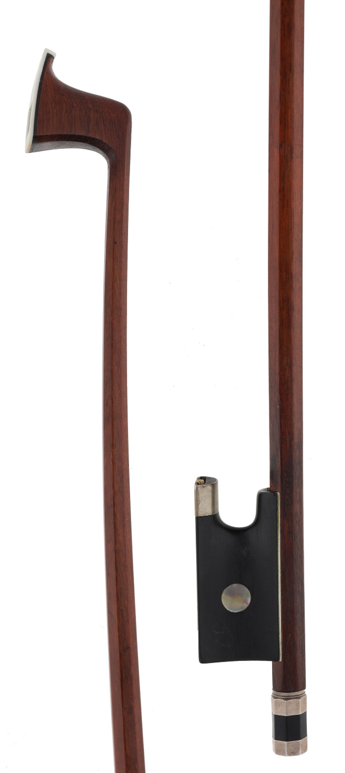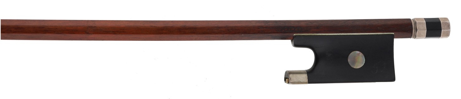 PRIVATE COLLECTION - German silver mounted violin bow stamped Dodd, the stick octagonal, the ebony frog inlaid with pearl eyes and also stamped Dodd, the ebony adjuster with two silver bands, 53gm (without hair and lapping)