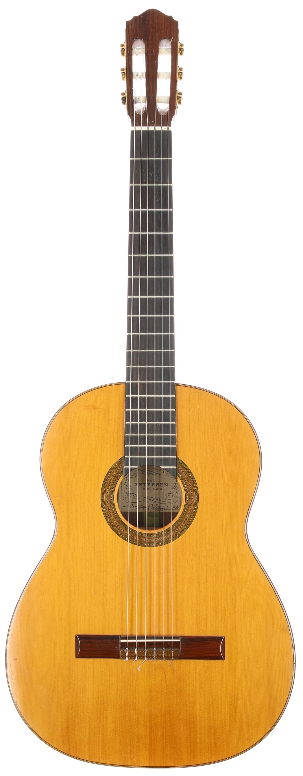 1970 Harald Peterson Model B classical guitar, made in England; Back and sides: Brazilian rosewood, stable hairline to back-treble side towards waist, further minor dings; Top: natural cedar, light checking and minor dings; Neck: cedar, light wear to first position; Fretboard: ebony; Frets: good; Hardware: good; Case: fitted hard case; Scale length: 650mm; Nut width: 52mm; Overall condition: good