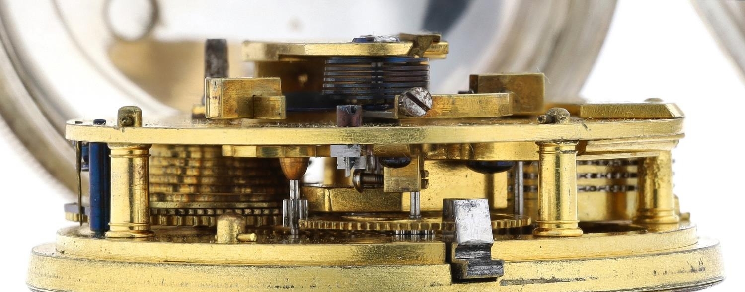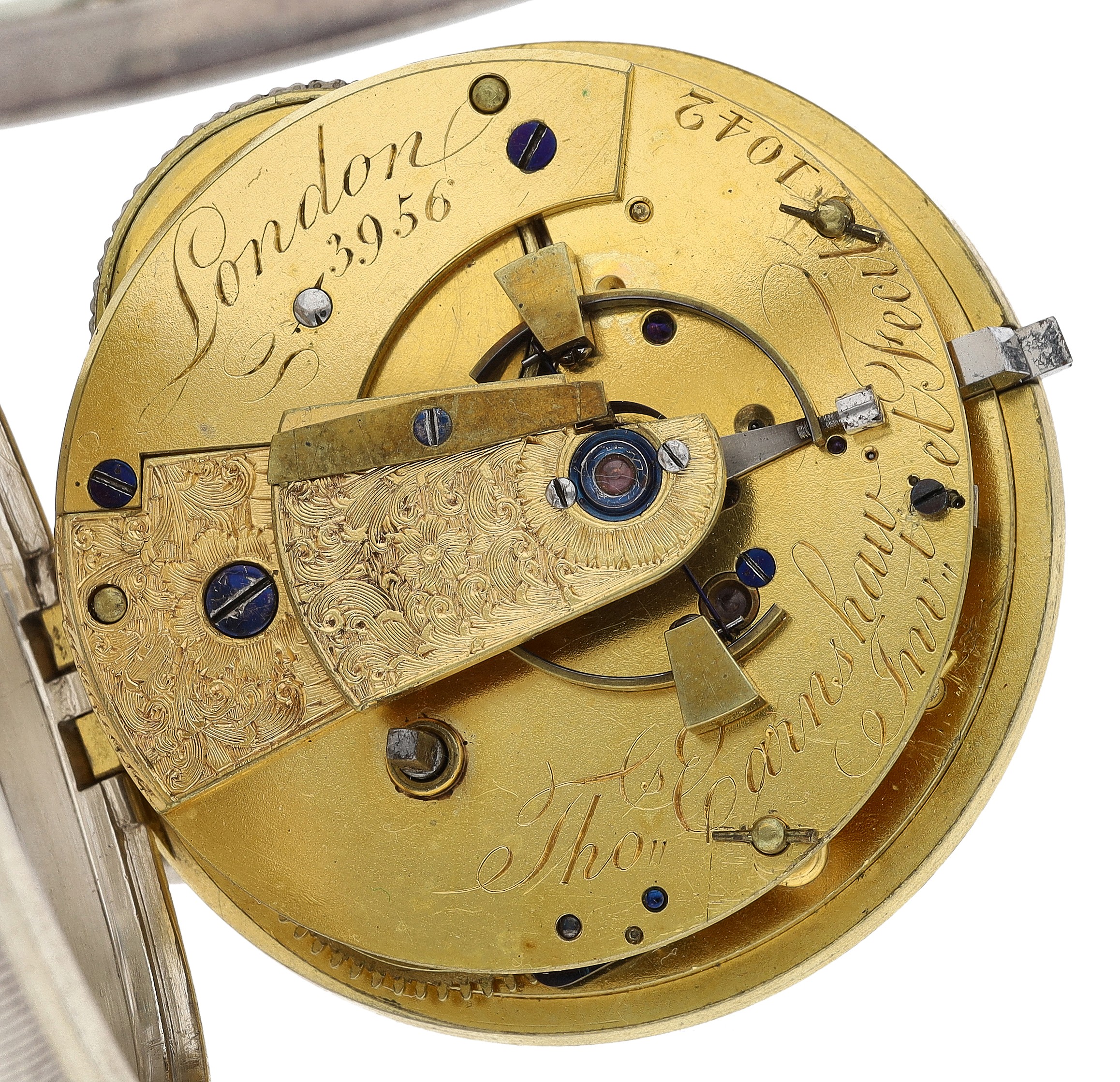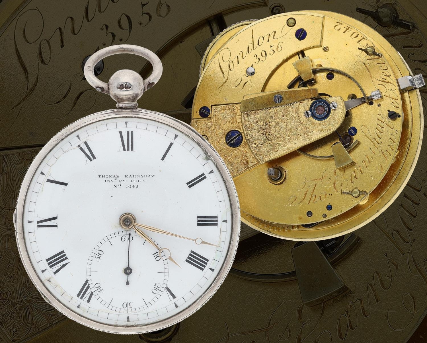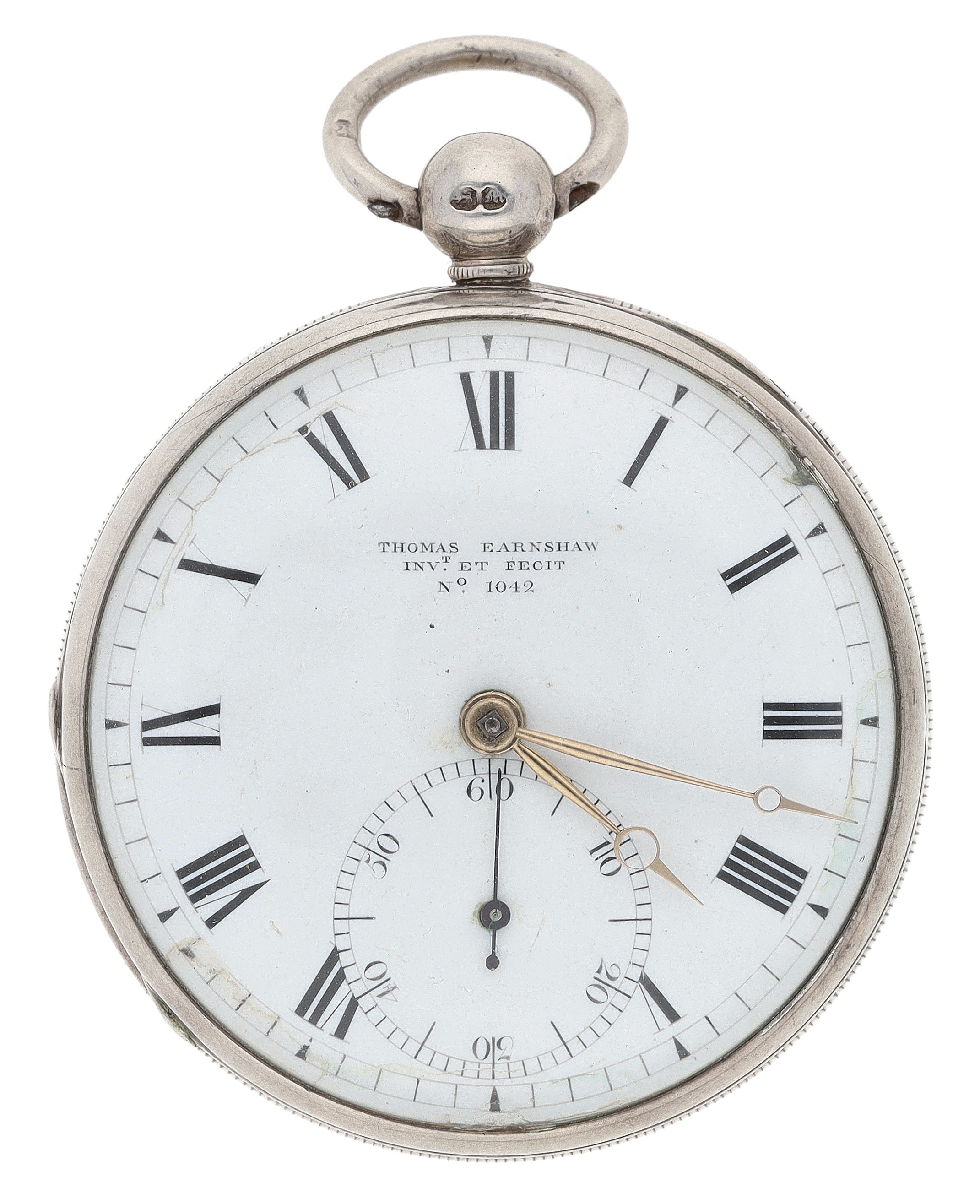 Thomas Earnshaw, London - fine silver cased pocket chronometer watch, No. 1042 and 3956, gilded fusee full plate movement signed 'Thos. Earnshaw Invt. et Fecit 1042 and 3956, London', with spring detent escapement, two arm bi-metallic balance with wedge shaped weights, engraved balance cock, blued steel helical spring and cylinder pillars, signed Roman numeral dial with outer minute track and subsidiary seconds dial, gold 'Breguet' type hands, within a later silver engine turned case hallmarked London 1847, 52.5mm