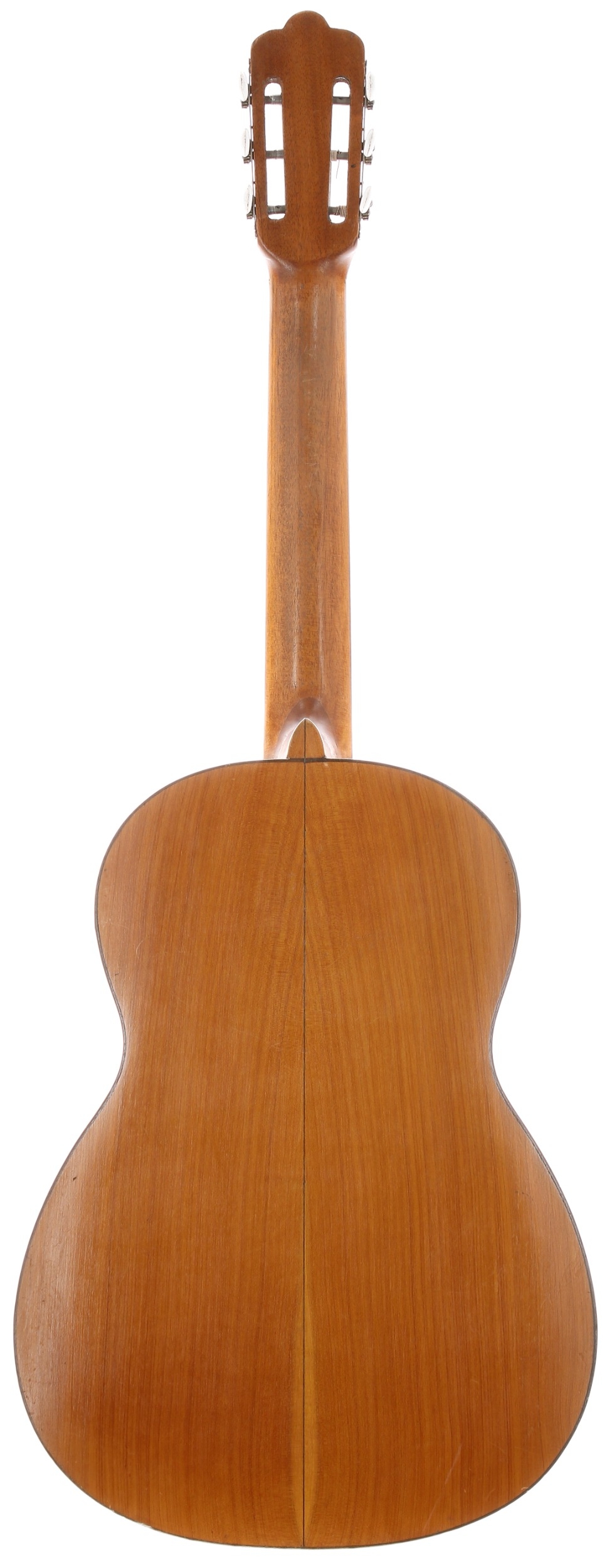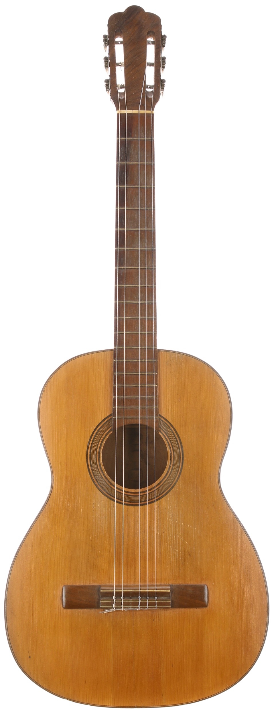 Early 20th century classical guitar; Back and sides: natural cypress, various scratches and marks; Top: natural spruce, one stable hairline to centre lower bout, surface play wear and other marks; Neck: cedar; Fretboard: rosewood; Frets: worn and tarnished; Case: semi-rigid fibreboard case; Scale length: 650mm; Nut width: 52mm; Overall condition: fair