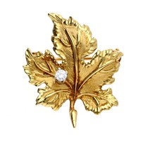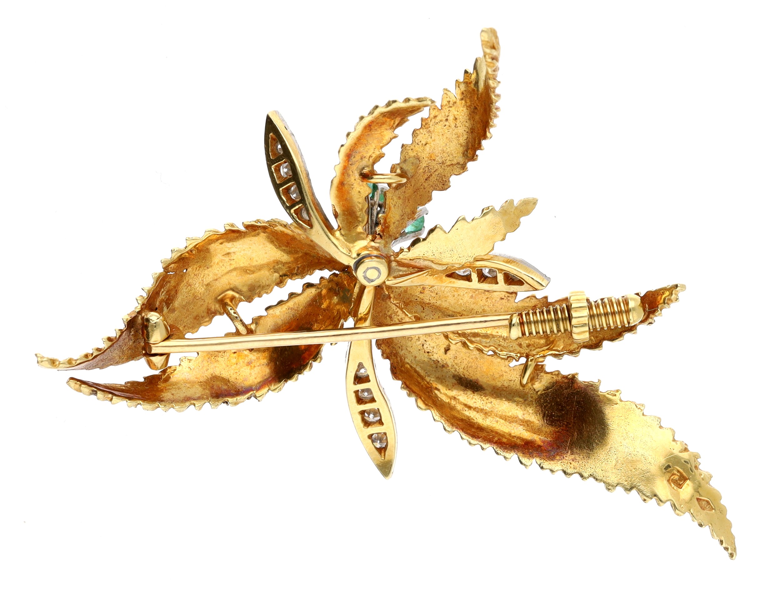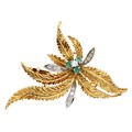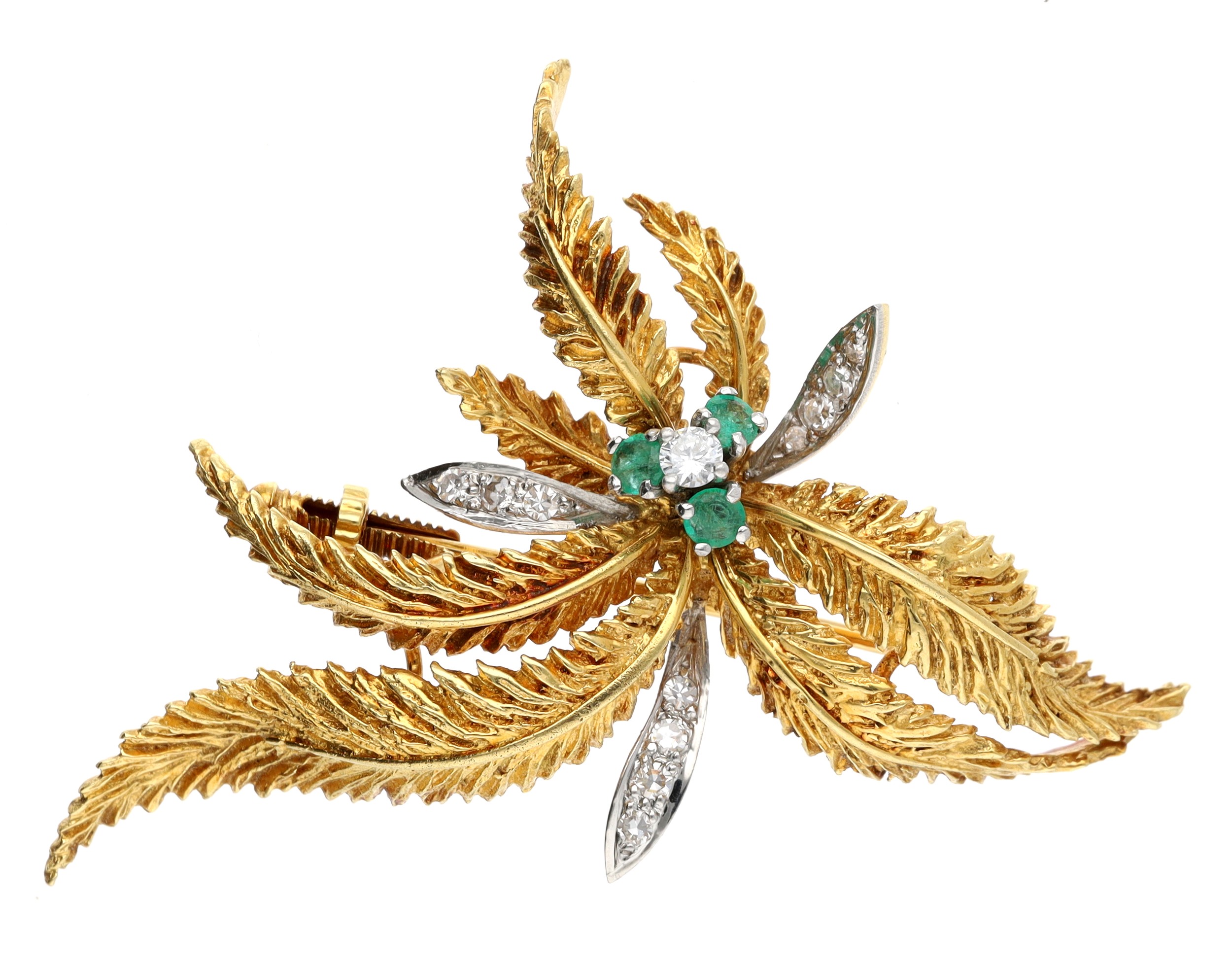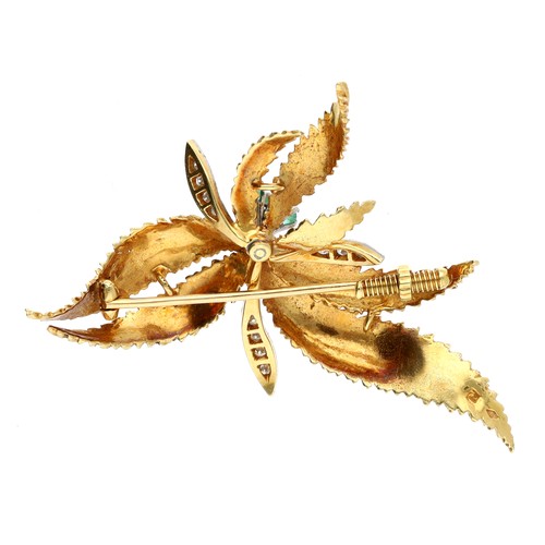 18ct bicolour emerald and diamond leaf design brooch, 10gm, 48mm x 38mm