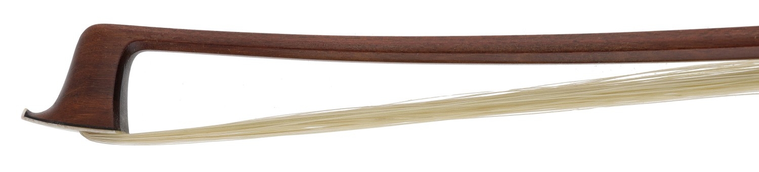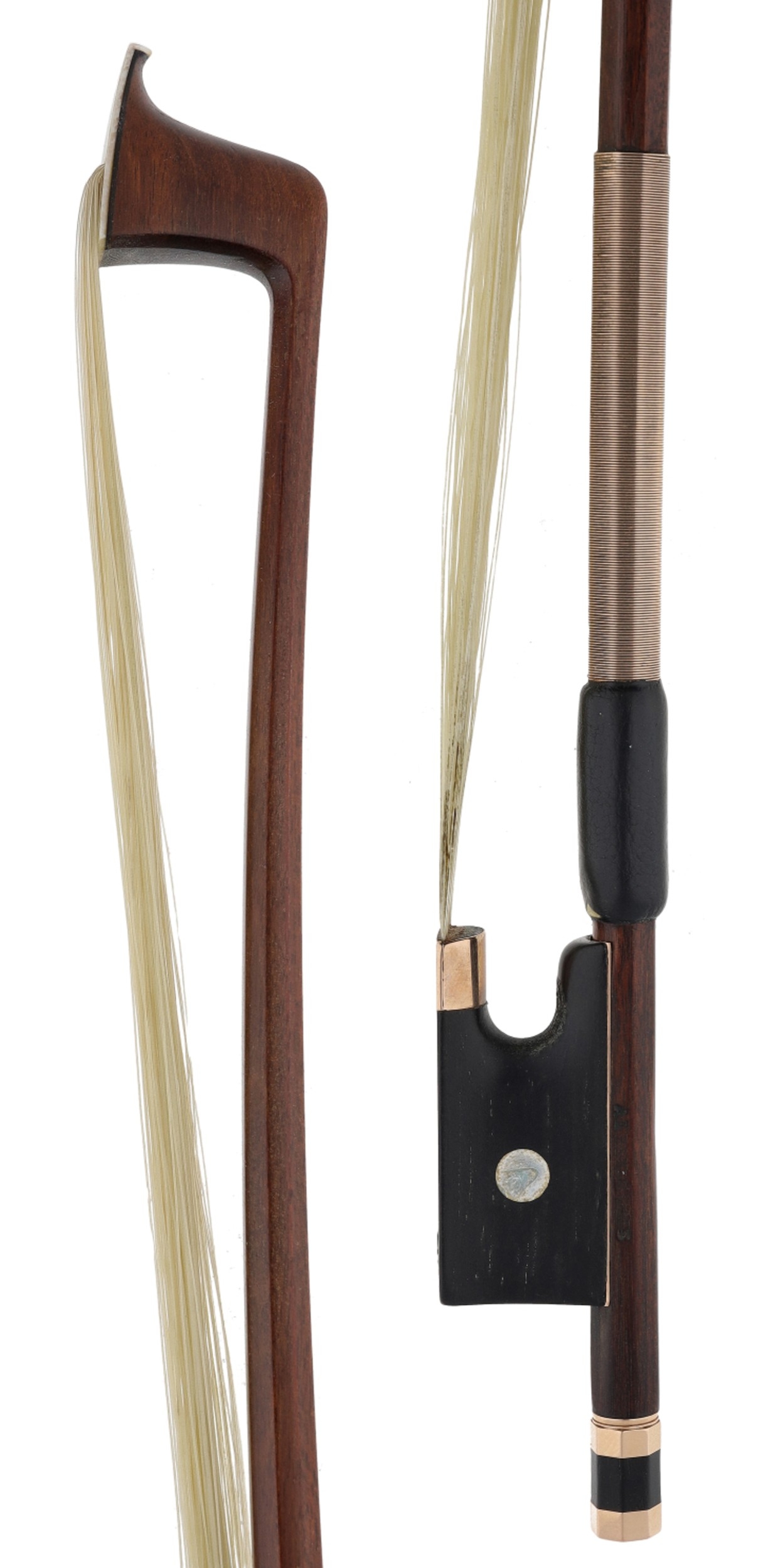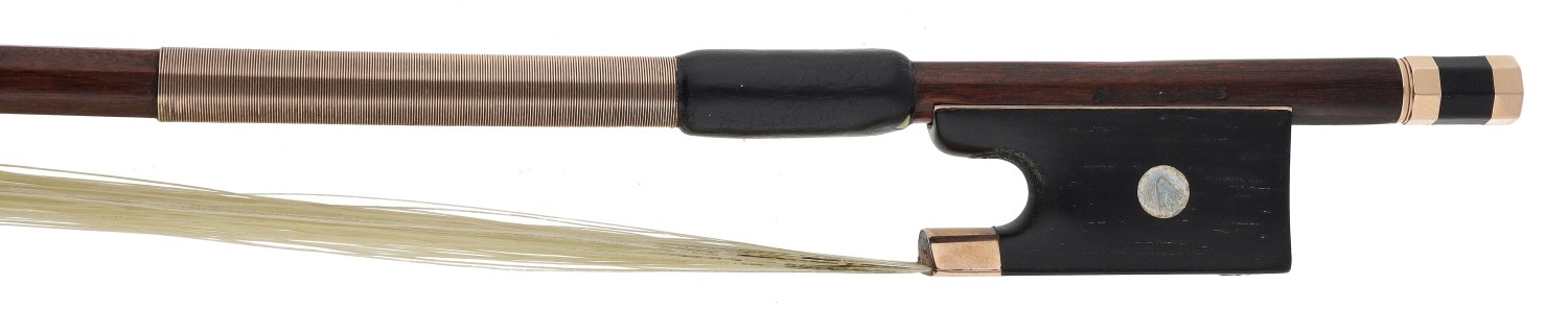PRIVATE COLLECTION - German gold mounted violin bow by and faintly stamped Albin Hums, the stick octagonal, the ebony frog inlaid with pearl eyes and the ebony adjuster with two gold bands, 62gm