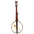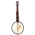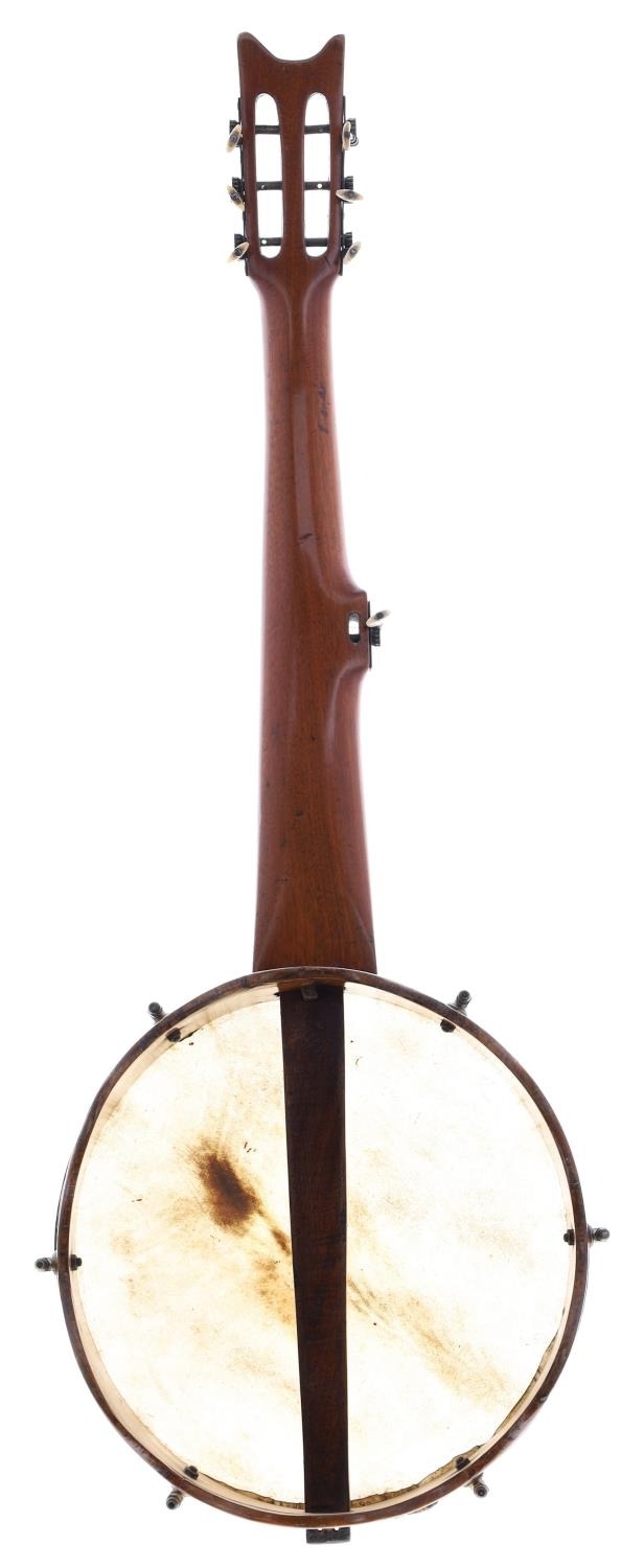 Good and rare Tunbridge Ware seven string fretless open back banjo circa 1880, unnamed, the walnut fretboard inlaid with elaborate Tunbridge Ware patterns and with 11.5" skin, case