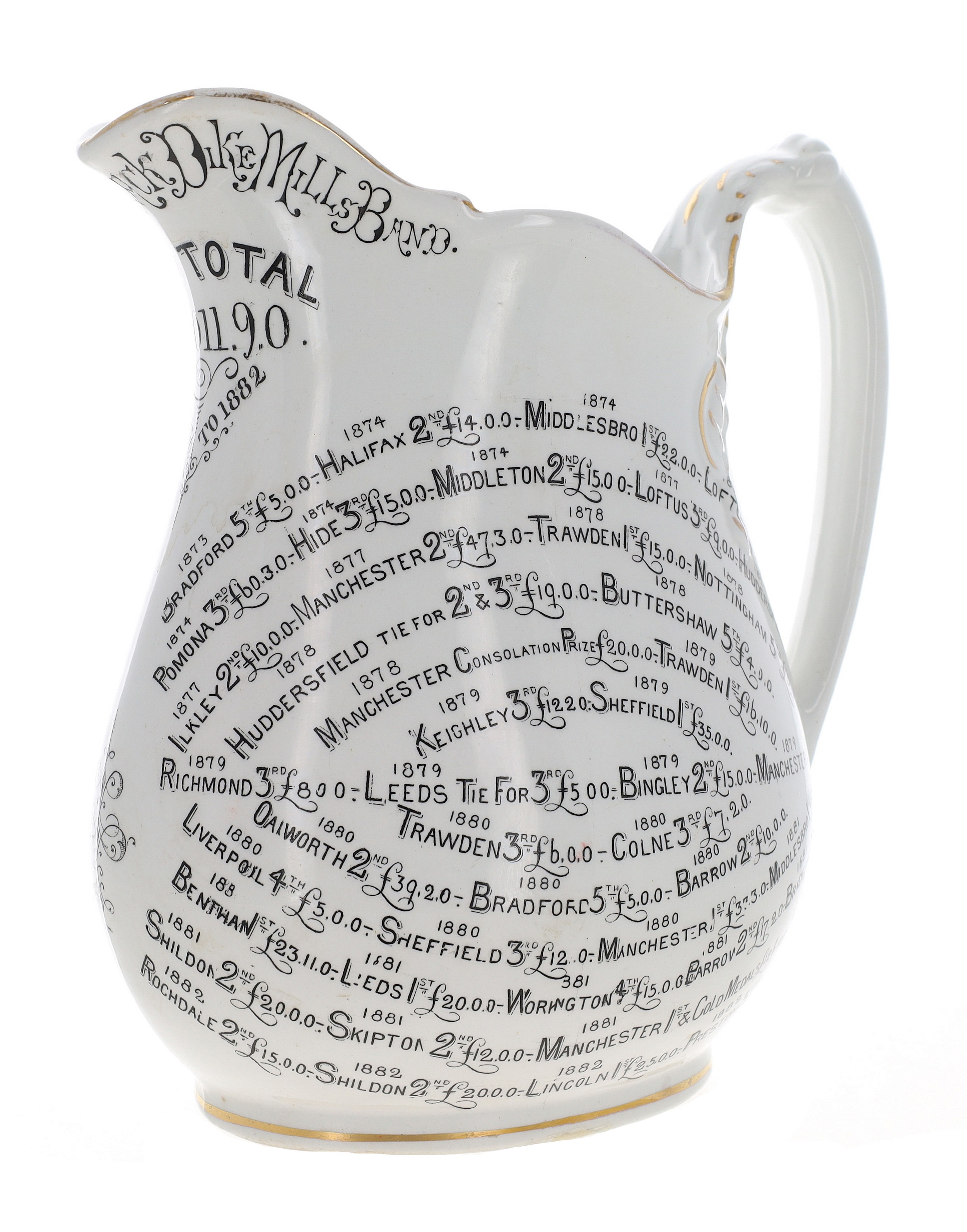 19th century Staffordshire pottery baluster jug, inscribed 'Prizes Won by The Black Dike Mills Band, Grand Total 2011.9.0., from 1856-1882', also inscribed allover with the individual prizes, 24.5cm high