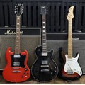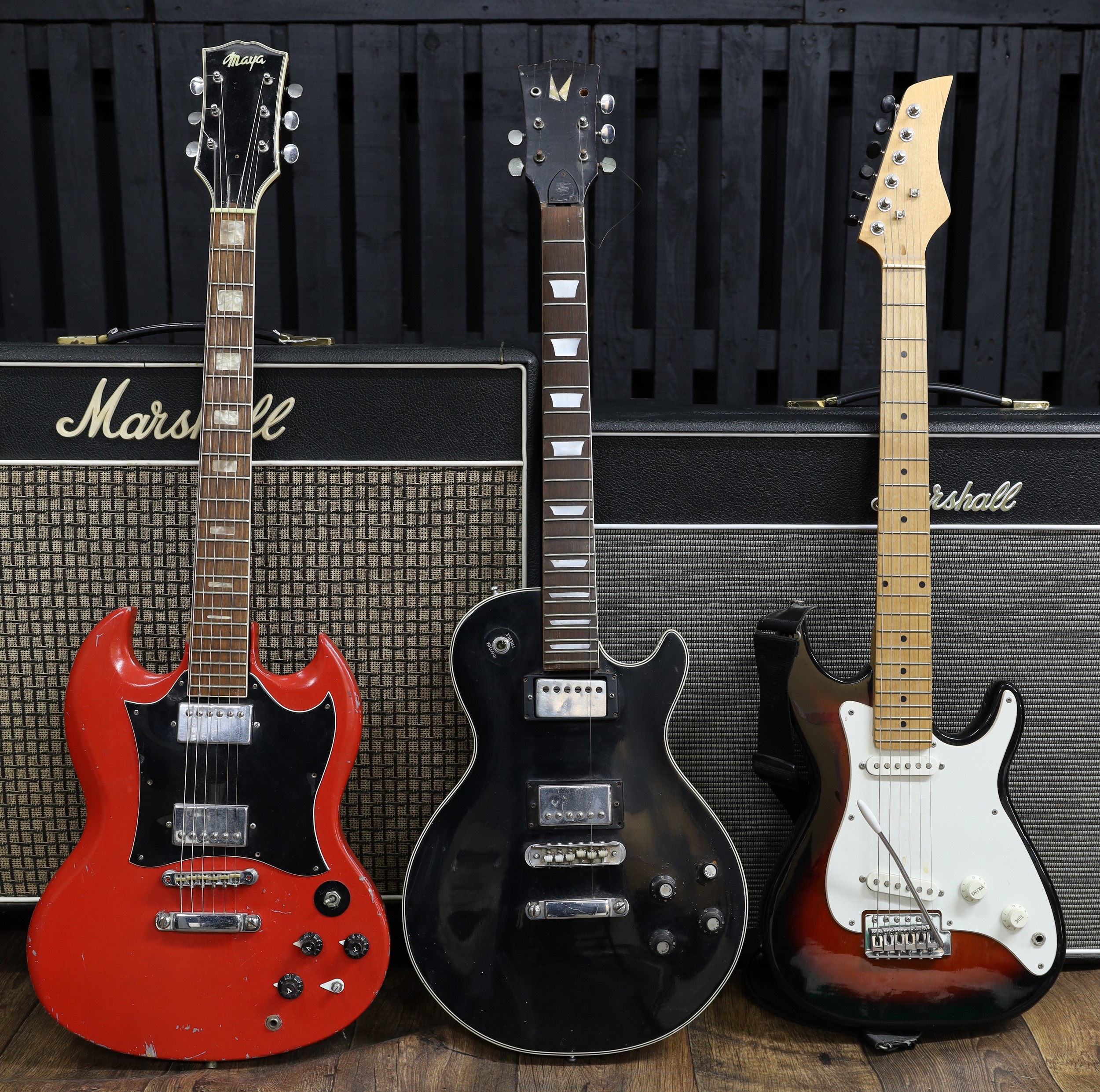 1970s Maya SG electric guitar in need of restoration; together with a Les Paul type electric guitar in need of restoration and a short scale two pickup S-Type electric guitar (3)