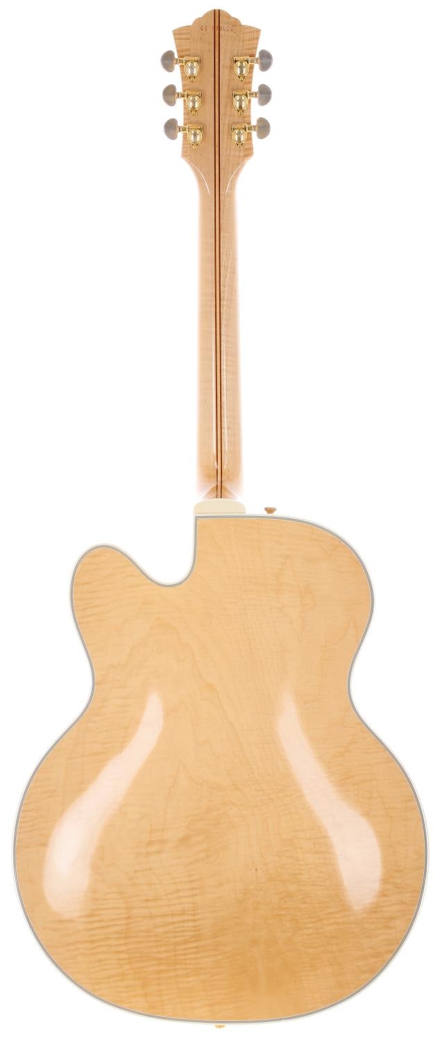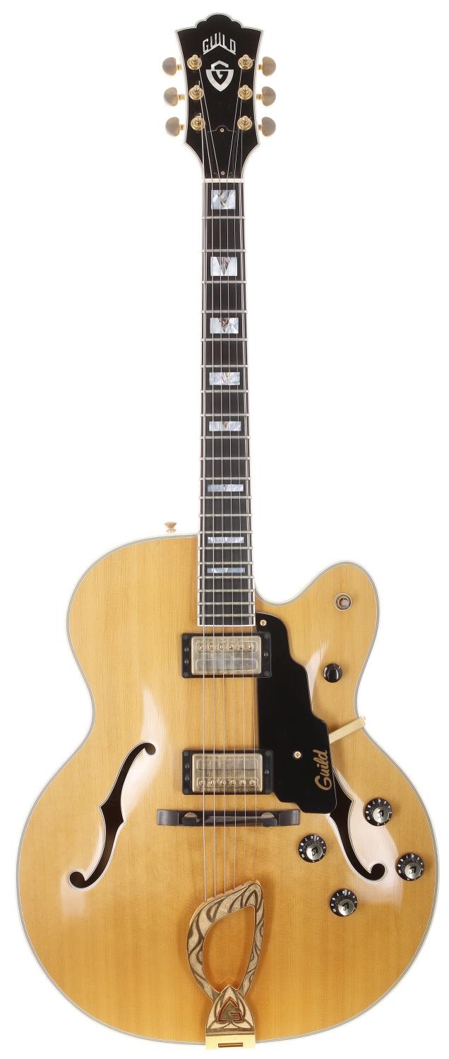 2020 Guild X-500 electric guitar, made in USA; Body: natural finished spruce top and highly figured maple back and sides, light checking to top; Neck: maple; Fretboard: ebony with pearl and abalone block position markers; Electrics: working; Hardware: generally good, some loss to gold plating; Case: original hard case; Overall condition: very good