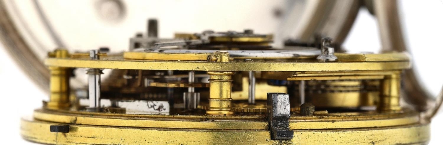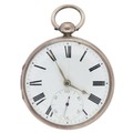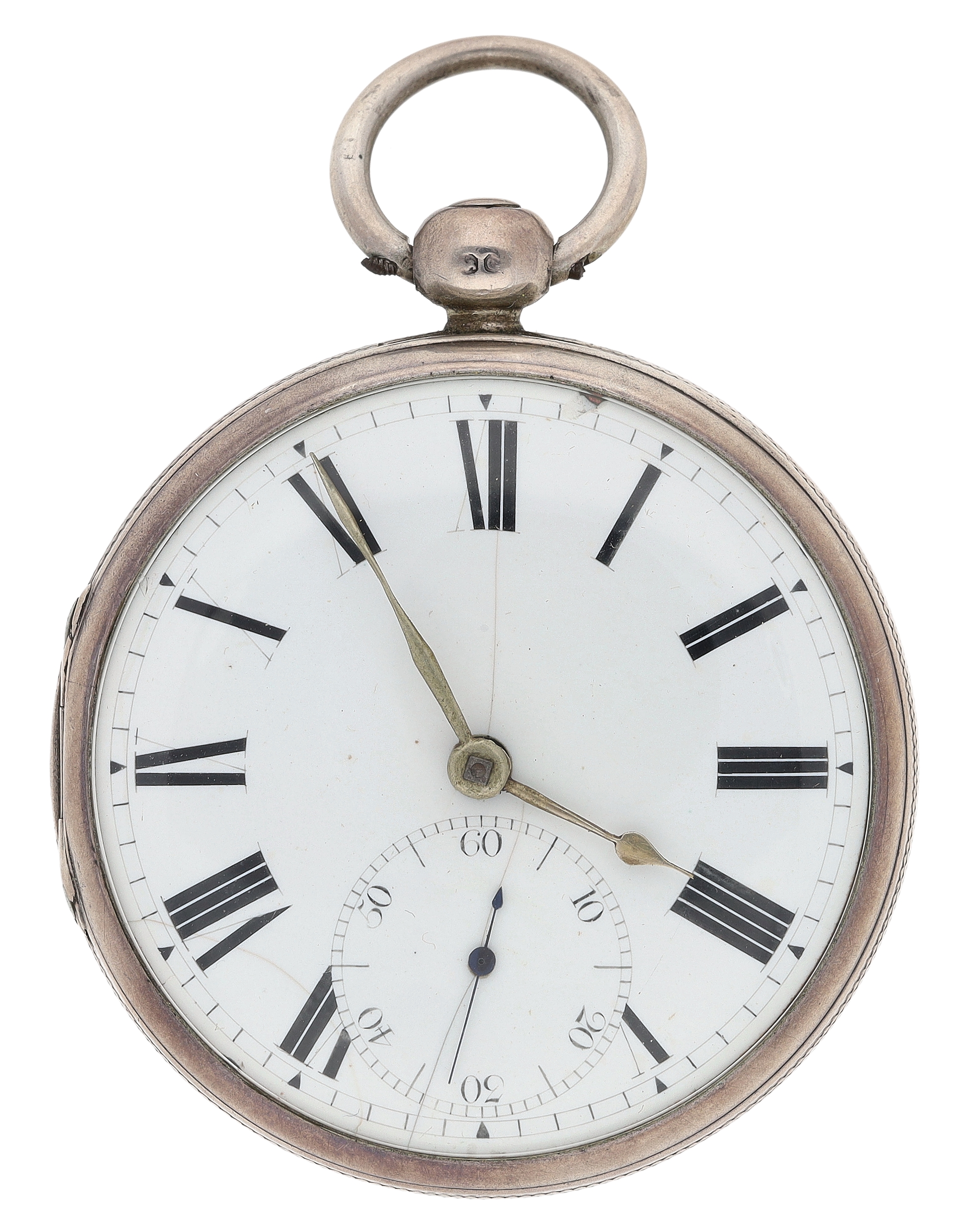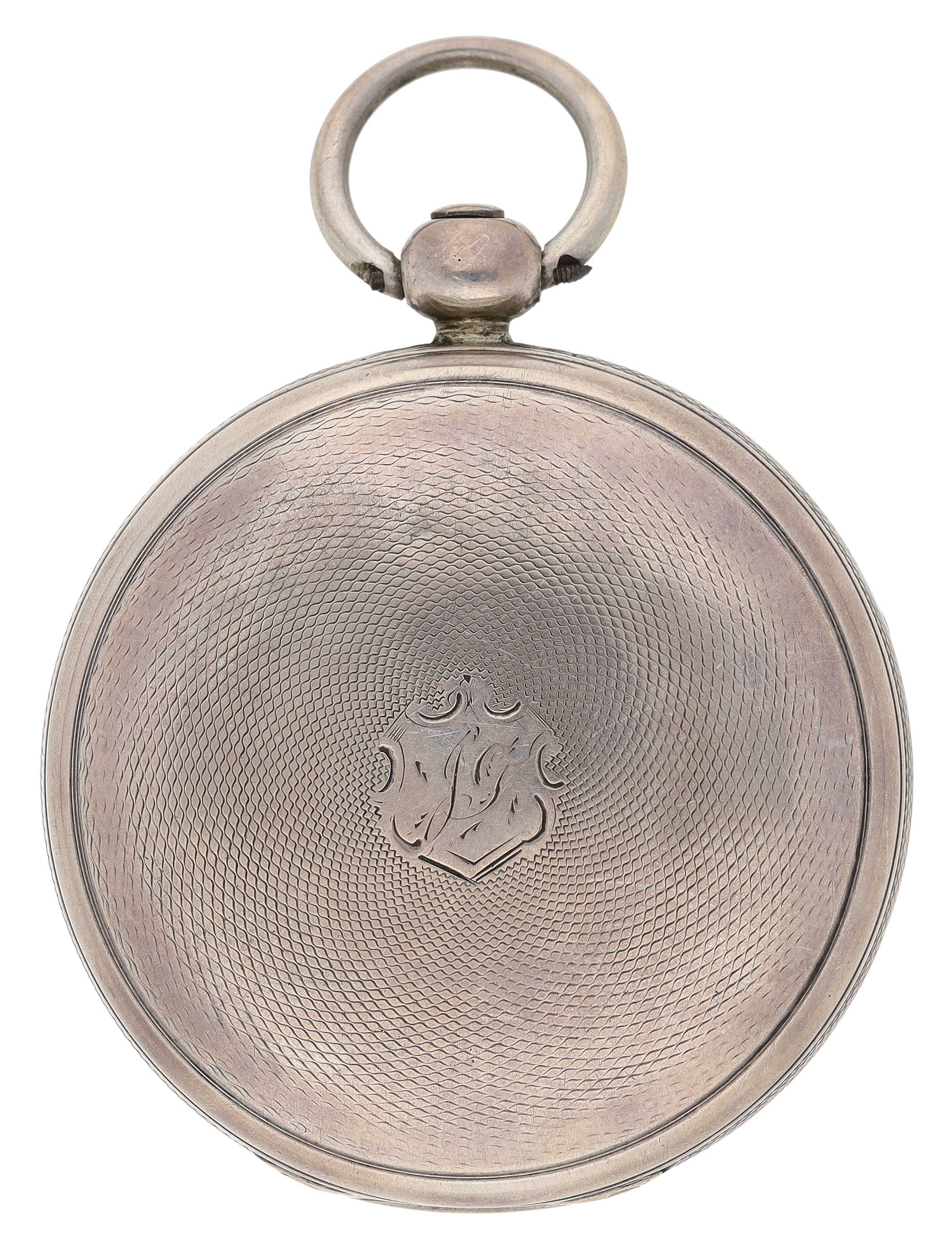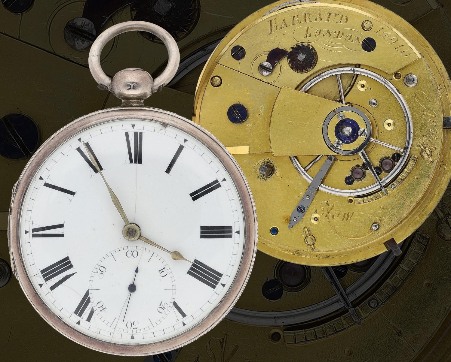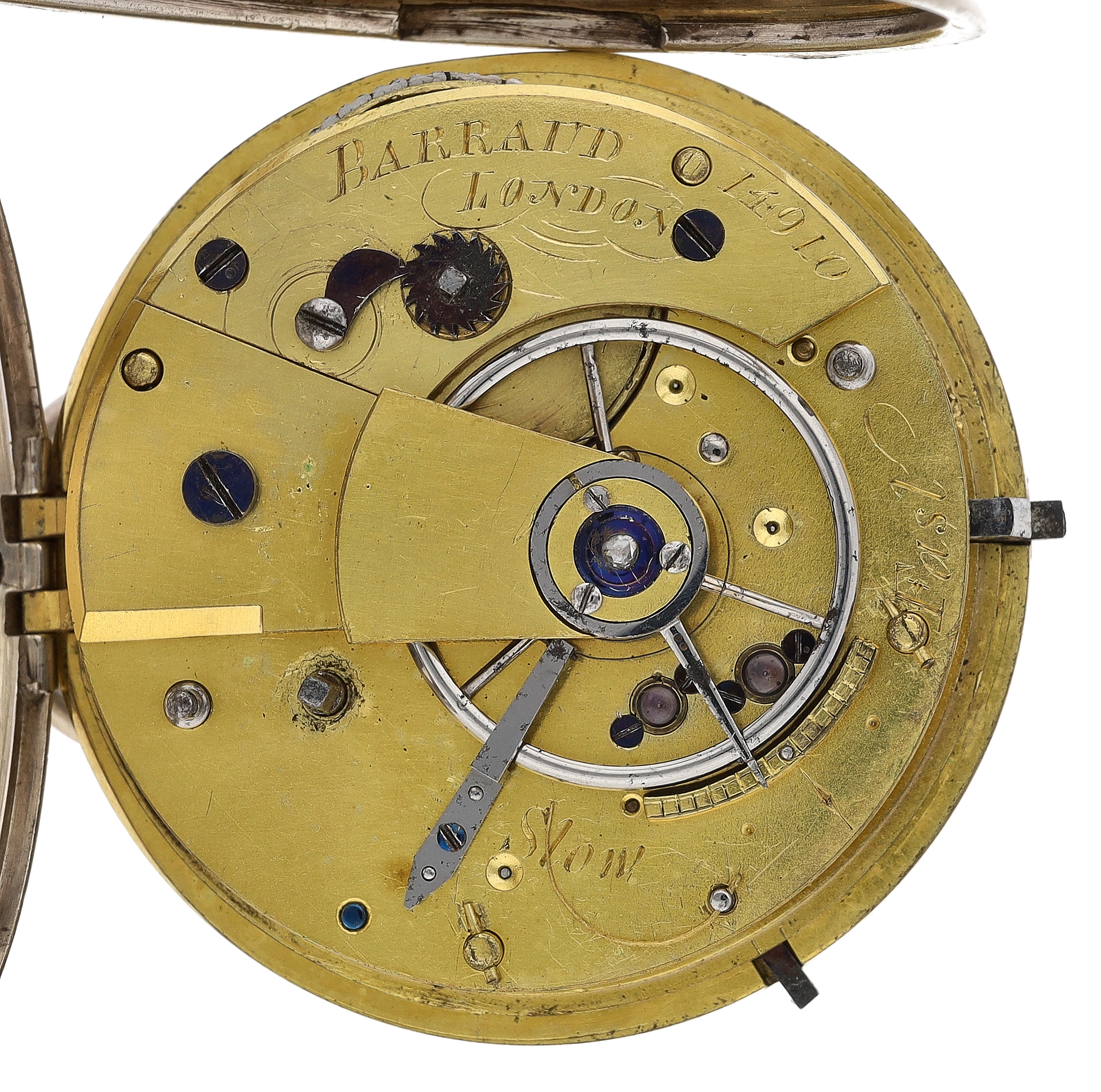 Barraud, London - George IV silver fusee lever pocket watch, London 1829, No. 14910, signed movement with stop work lever, three-arm balance, regulator, plain balance cock and diamond endstone, with movement dust cover, Roman numeral dial with outer minute track, spade hour hand and subsidiary seconds dial engine turned case, case maker 'RN', 52mm