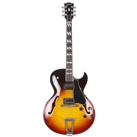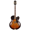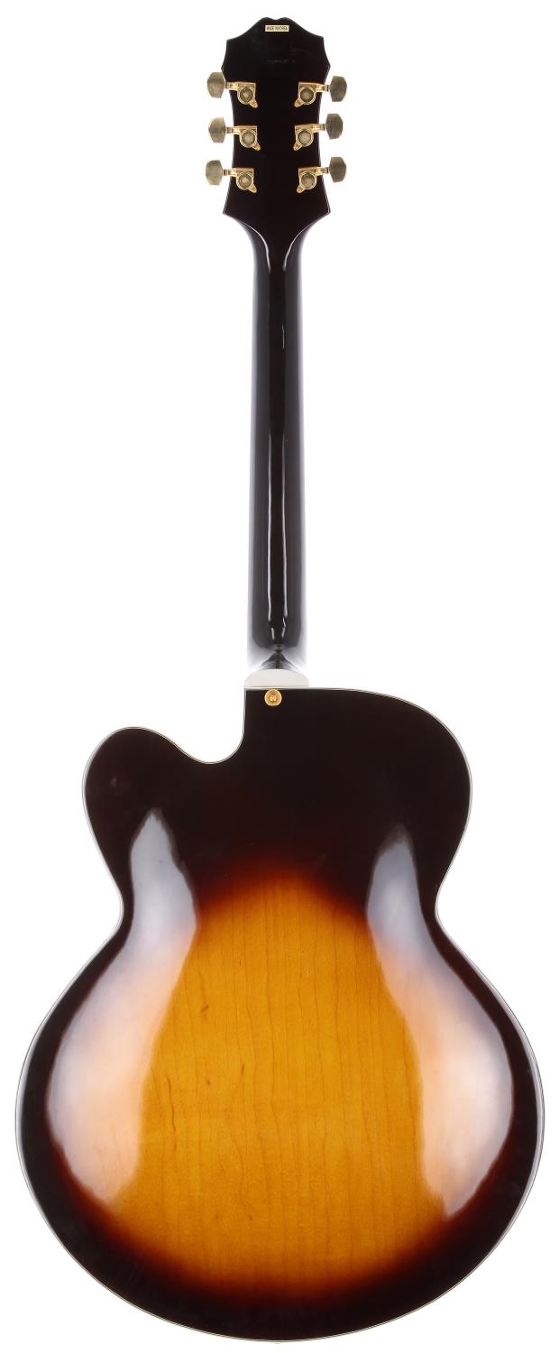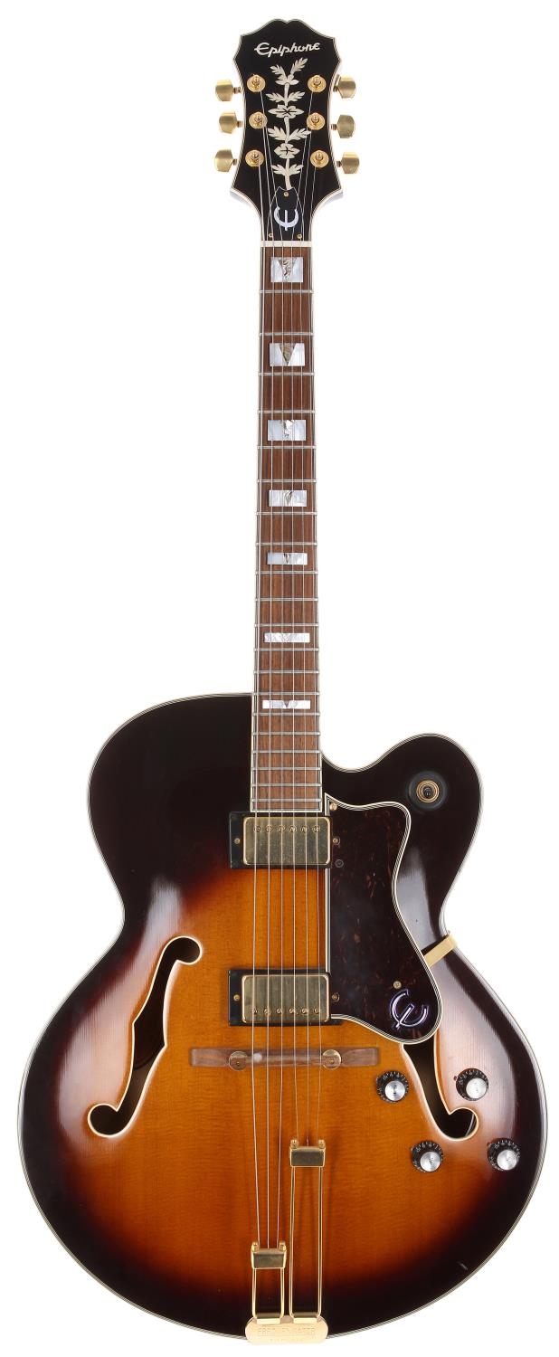 1997 Epiphone Broadway hollow body electric guitar, made in Korea; Body: sunburst finished maple back and sides and spruce top, a few minor dings but generally very good for age; Neck: good; Fretboard: rosewood; Frets: light wear to first position; Electrics: working; Hardware: good; Case: Epiphone hard case; Weight: 3.41kg; Overall condition: very good