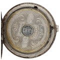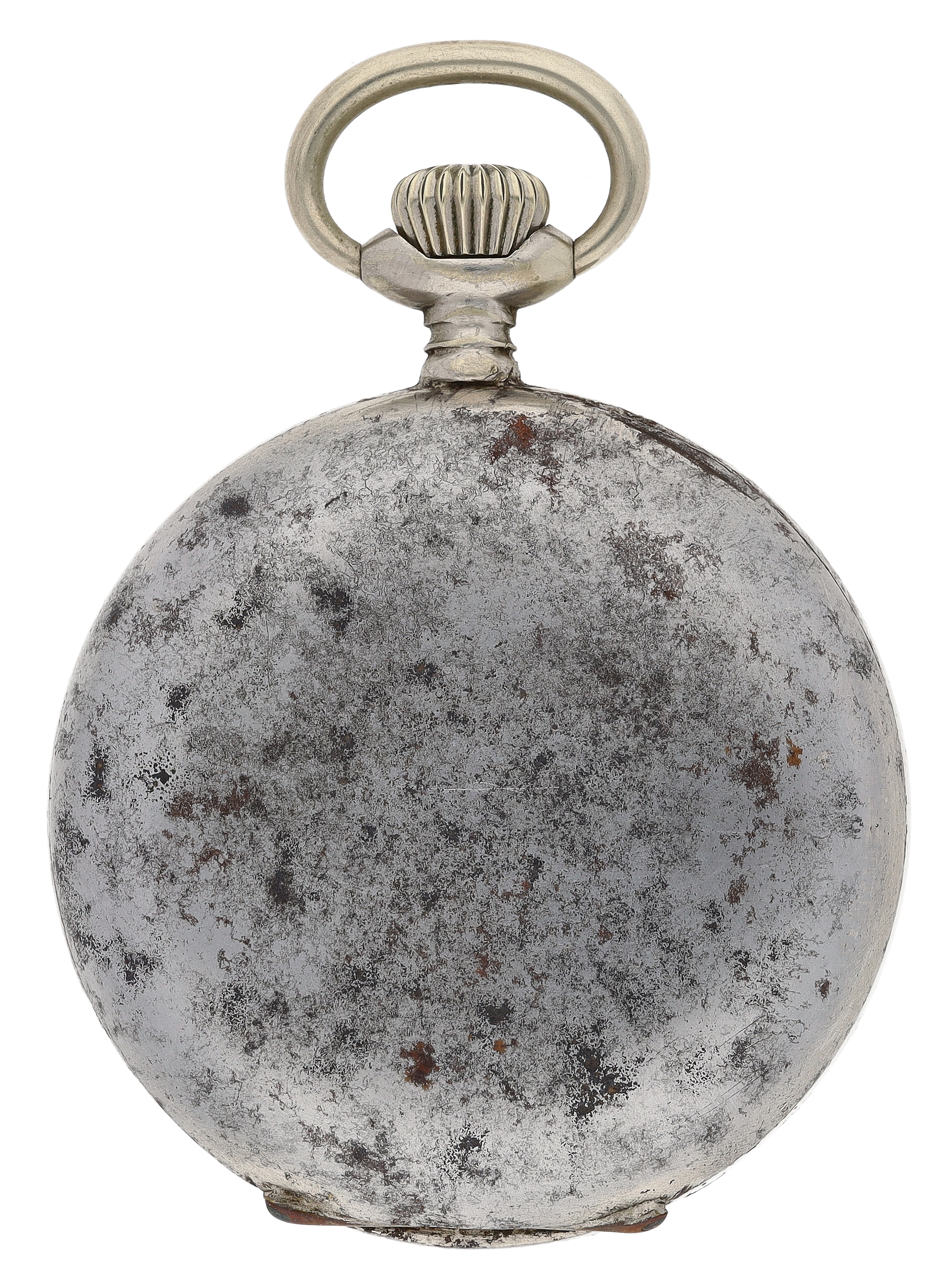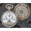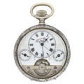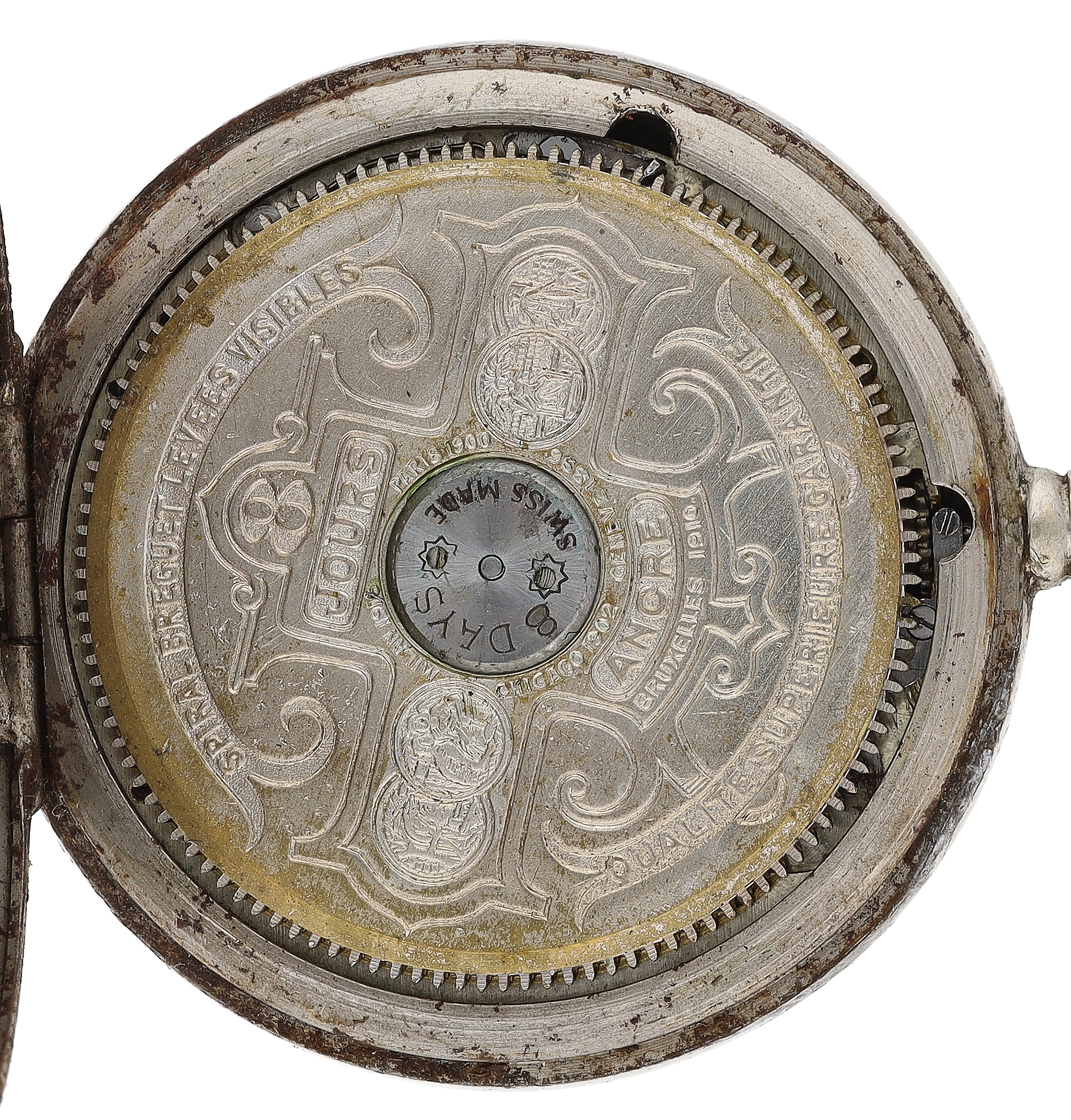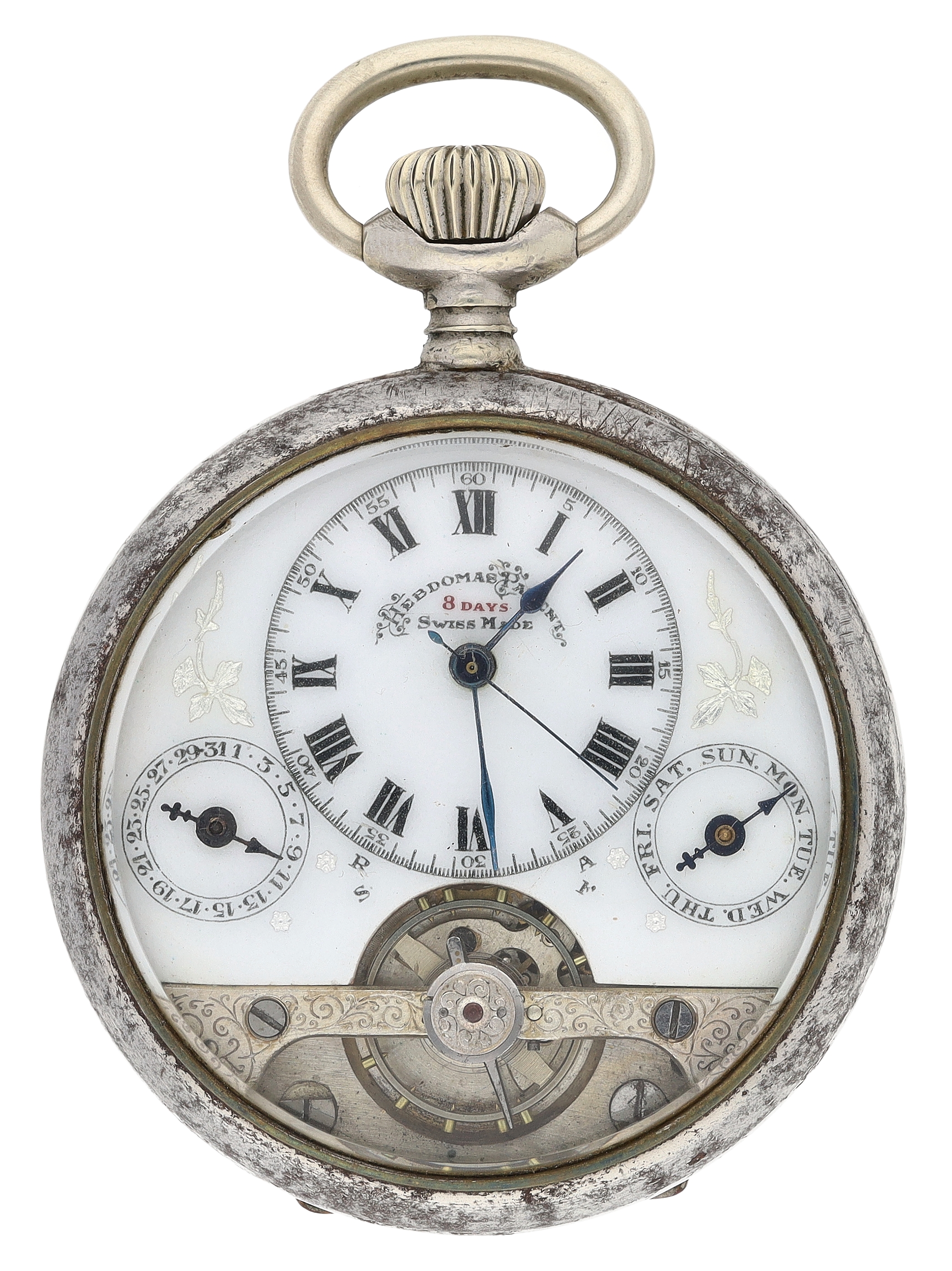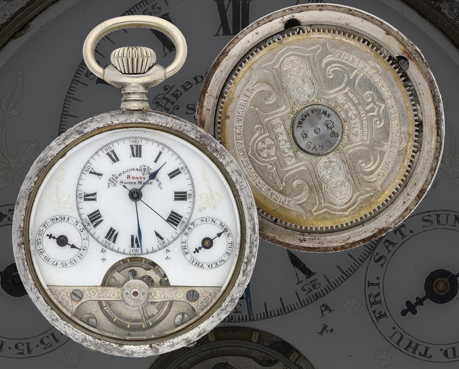 Hebdomas Patent - 8 Days Calendar gunmetal pocket watch with rare sweeping centre seconds, signed white dial with a hour dial with centre seconds, with day and date apertures over the visible balance with regulator, 49mm