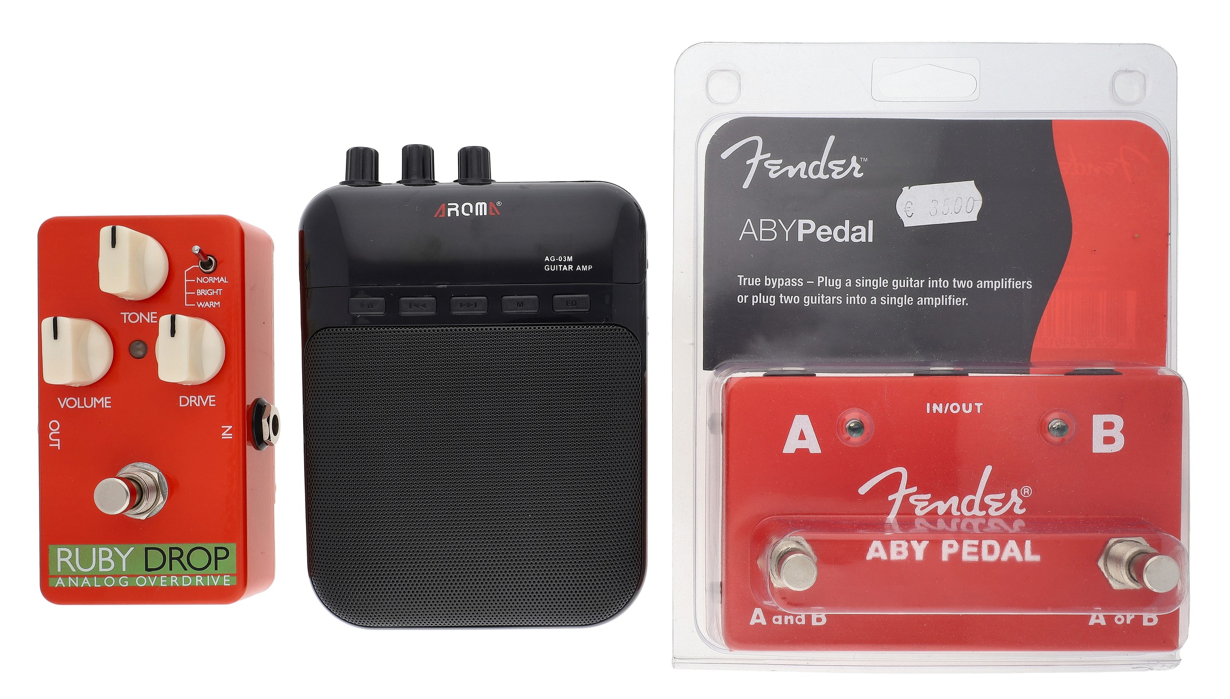 Elypse Ruby Drop guitar pedal, boxed; together with a Fender ABY pedal and an Aroma AG-03M guitar amp (3)