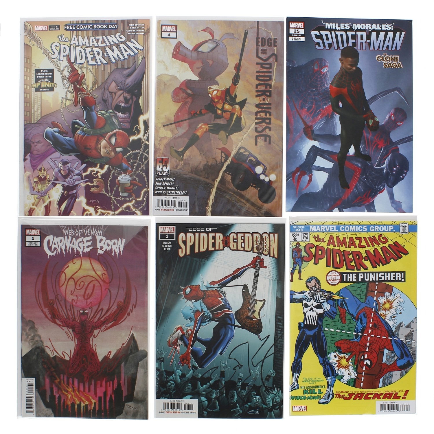 Marvel Comics, The Amazing Spider-Man issue #129 (facsimile), first appearance of the Punisher, together with a further five related Spider-Man comics to include Edge of Spider-Geddon #1, Web of Venom Carnage Born #1, Miles Morales The clone saga #25, Edge of Spider-verse #4, The Amazing Spider-Man by Nick Spencer (6)