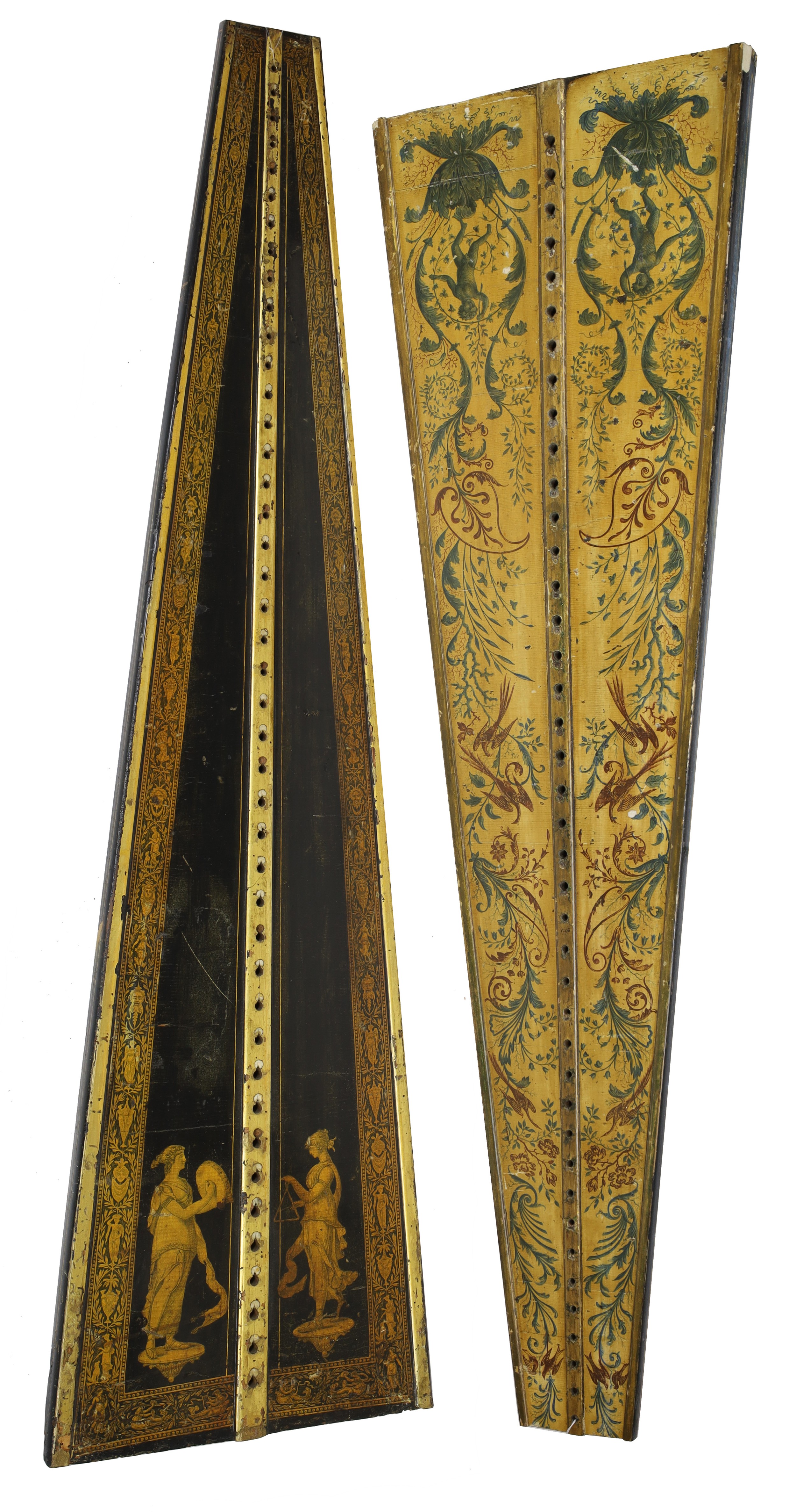 Two early 19th century English finely decorated harp sound boards, 48" and 45.5" long respectively (2)