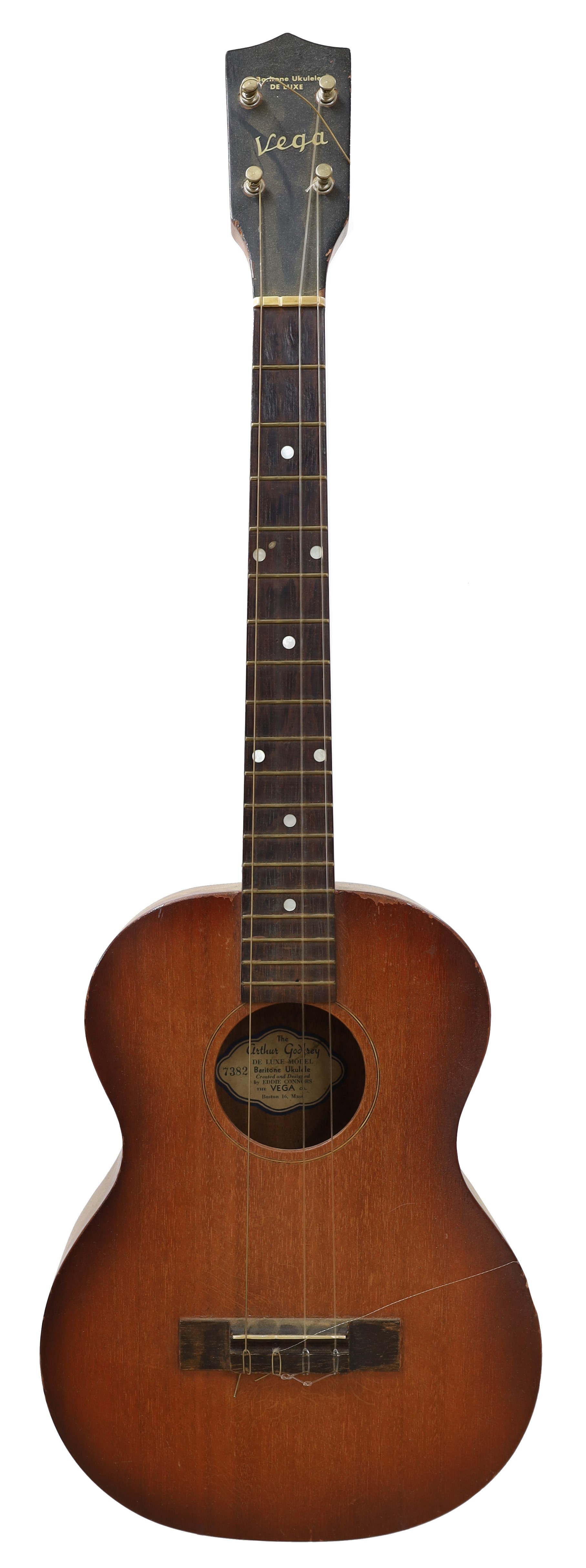 1950s Vega baritone ukulele De Luxe, labelled The Arthur Godfrey Deluxe Model Baritone Ukulele Created and Designed by Eddie Connors...no. 7382, the body with sunburst finish and mother of pearl dot makers to the fretboard, case