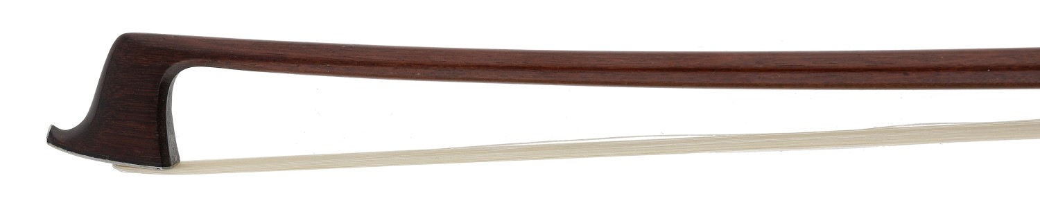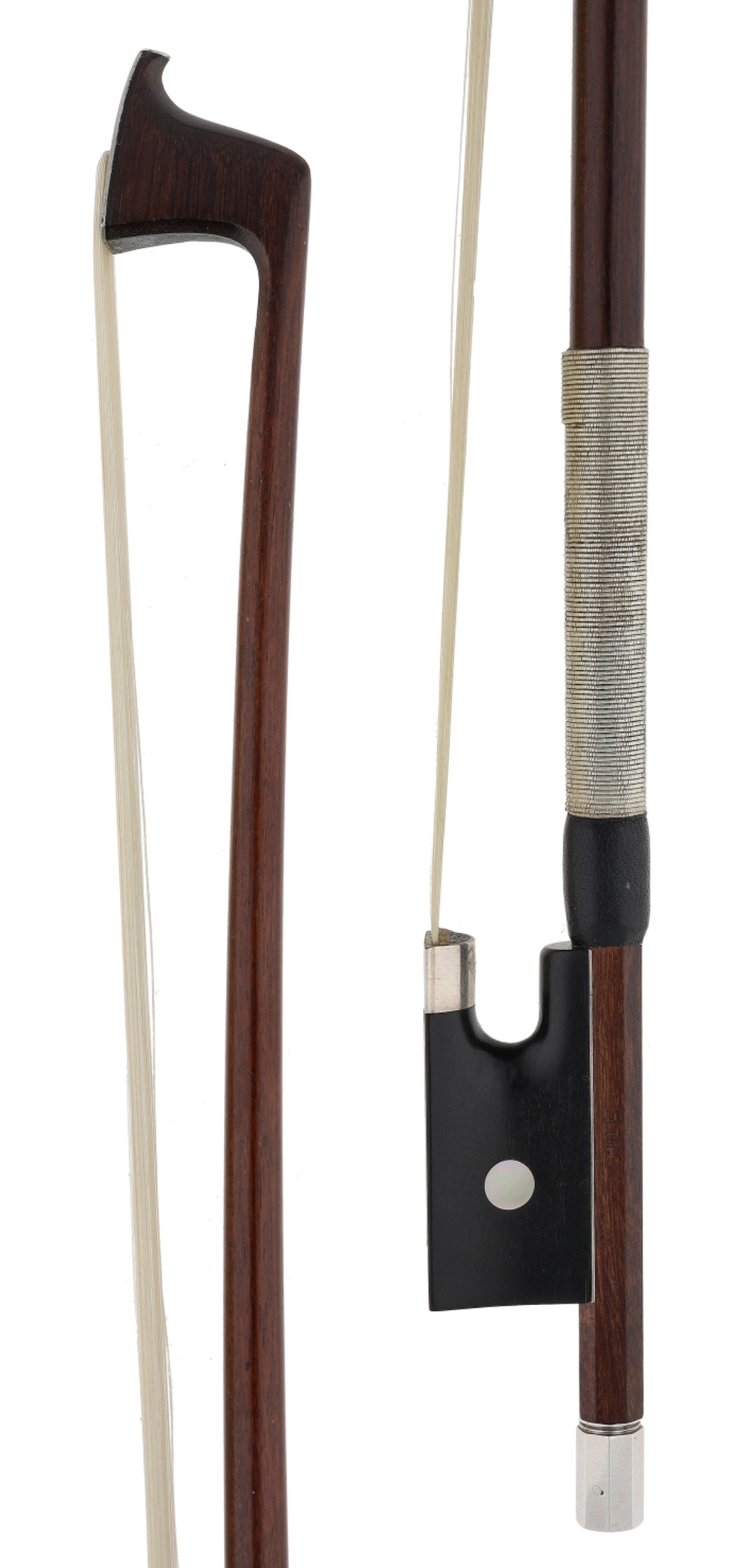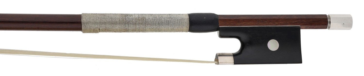 PRIVATE COLLECTION - English silver mounted violin bow by W.E. Hill & Sons stamped Hill (William C. Retford), the stick round, the ebony frog inlaid with pearl eyes and with a silver overlaid ebony adjuster, 57gm