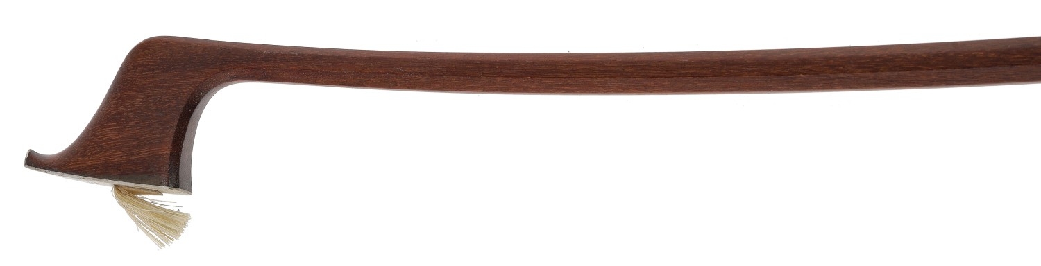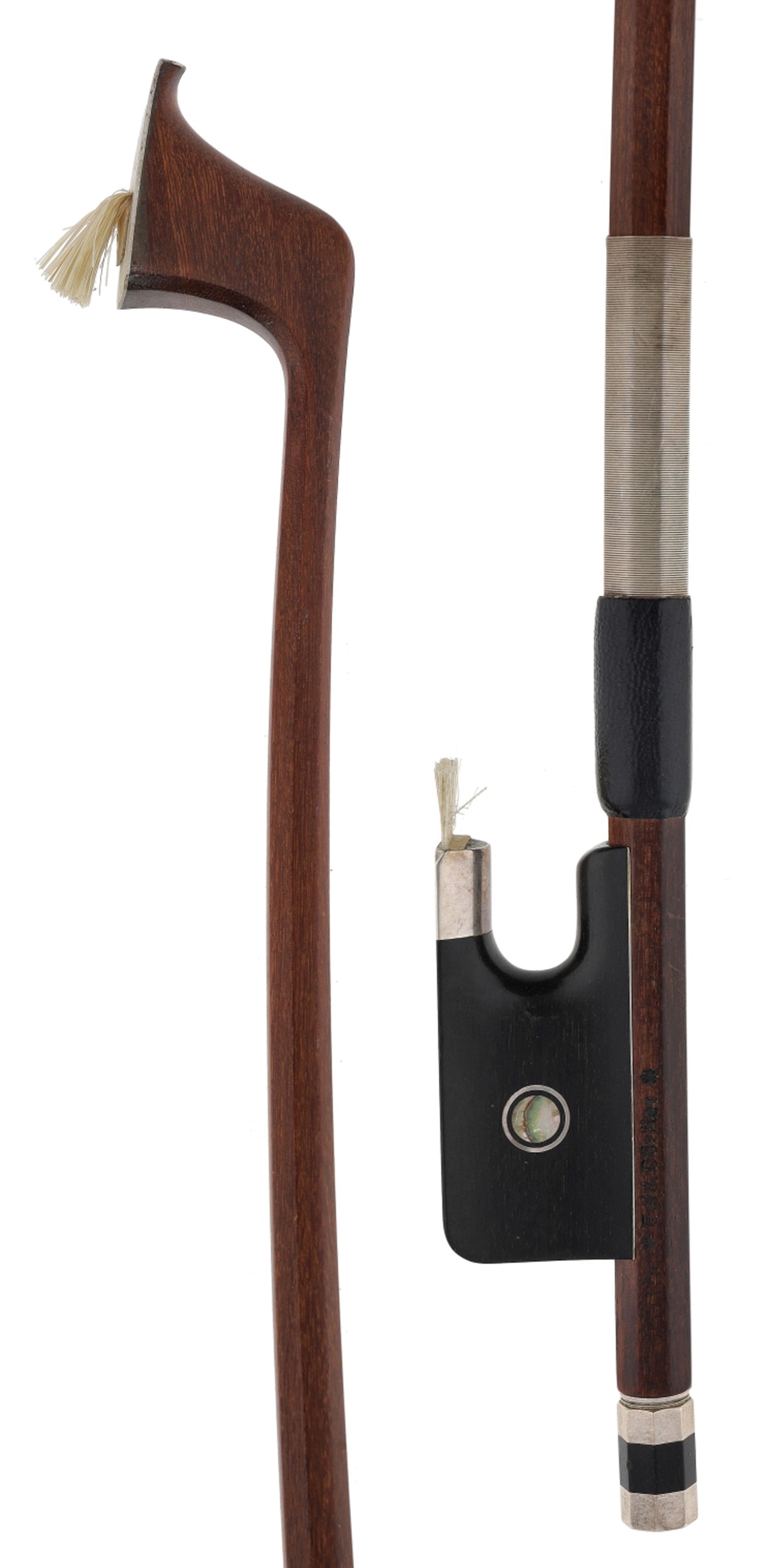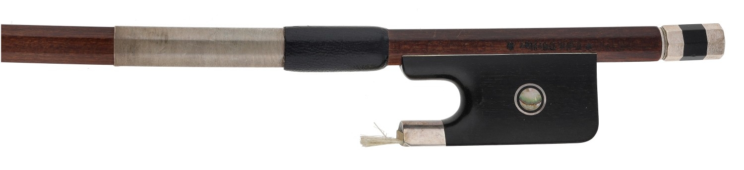 PRIVATE COLLECTION - German silver mounted violoncello bow by and stamped *Egid. Dorfler*, the stick octagonal, the ebony frog inlaid with silver rings enclosing pearl eyes and the ebony adjuster with two silver bands, 77gm (without hair)