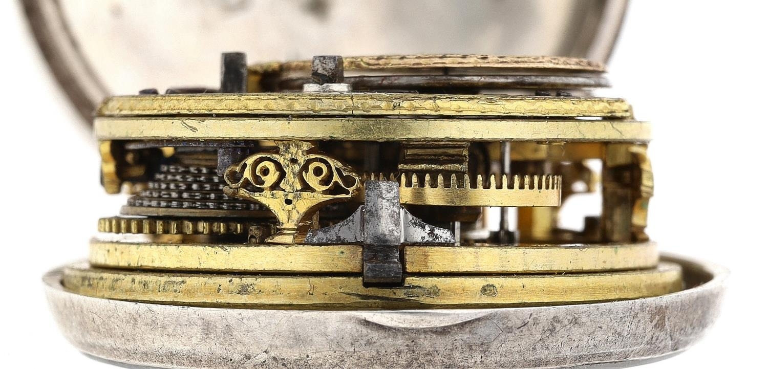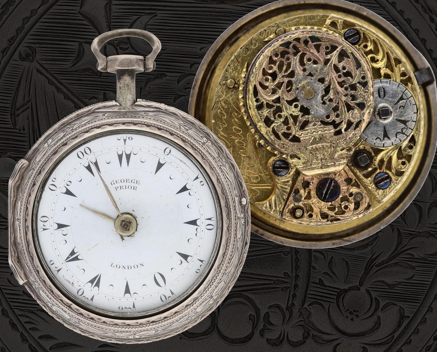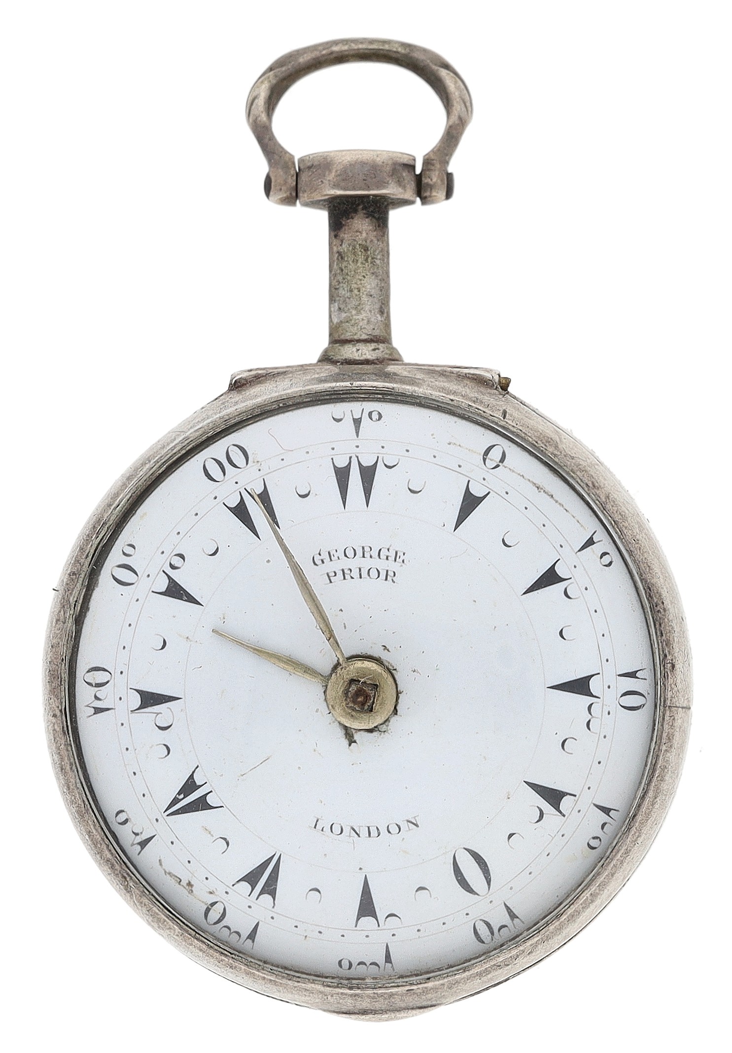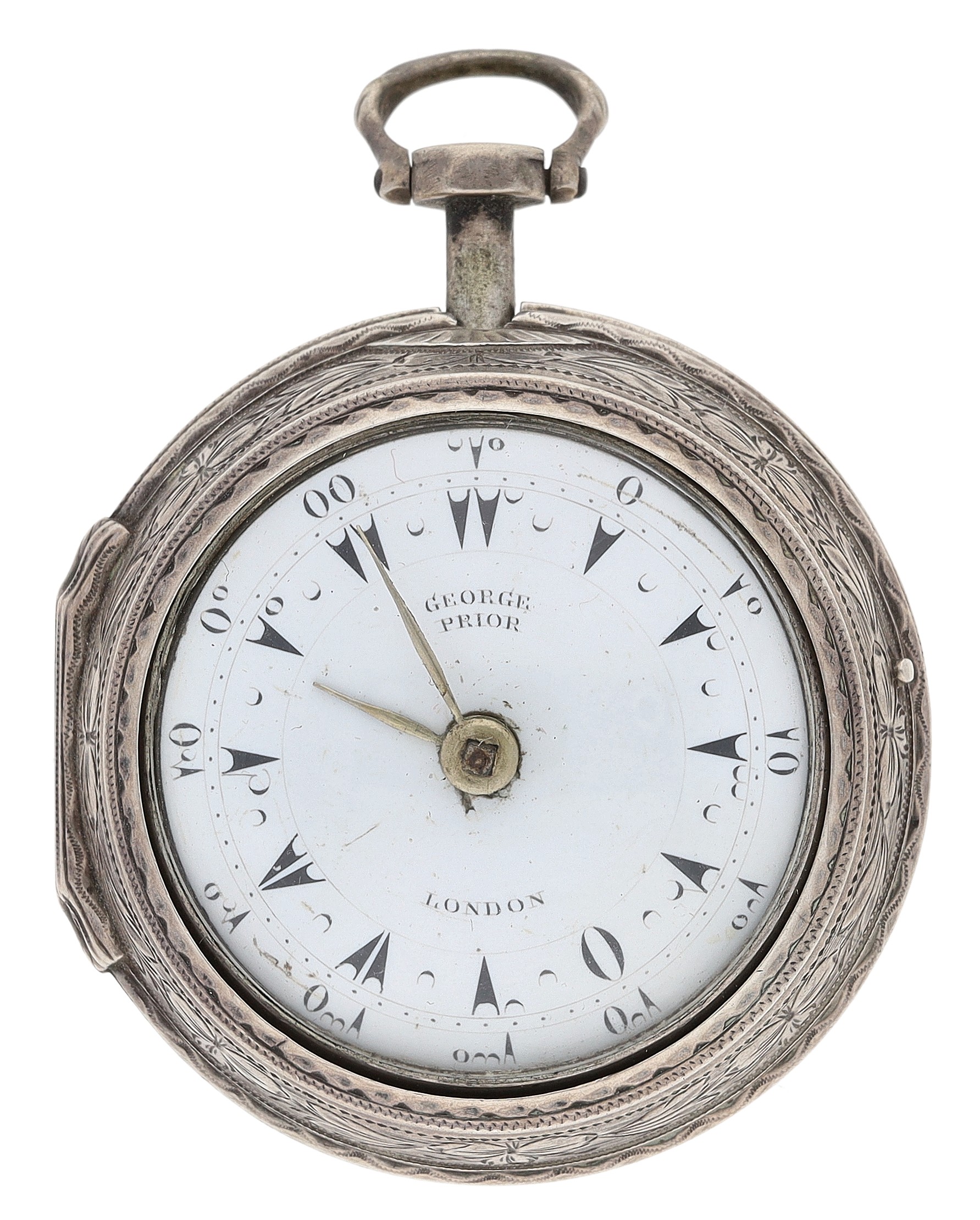 George Prior, London - small silver pair cased verge pocket watch made for the Turkish Market, No. 24369, London 1815, signed fusee movement with ornate pillars, engraved and pierced balance cock, three-arm balance and silver regulating dial, signed enamel dial with Turkish numerals, engraved outer case, inner case maker 'IK', 41mm