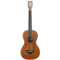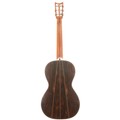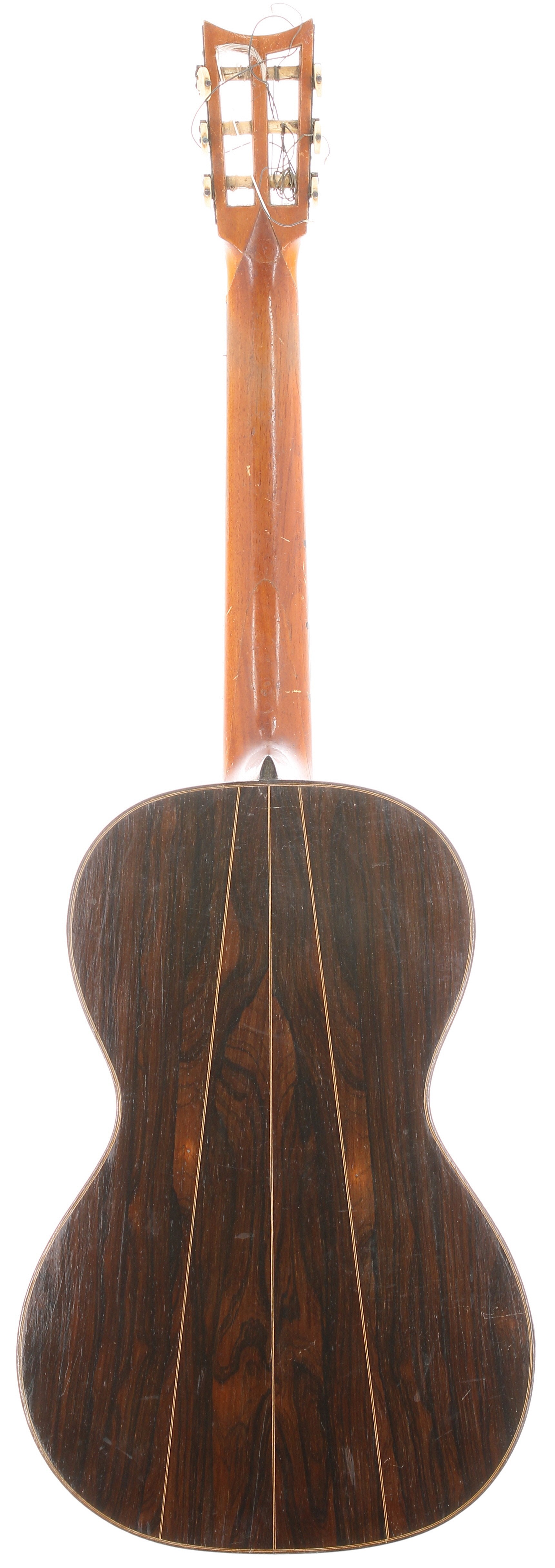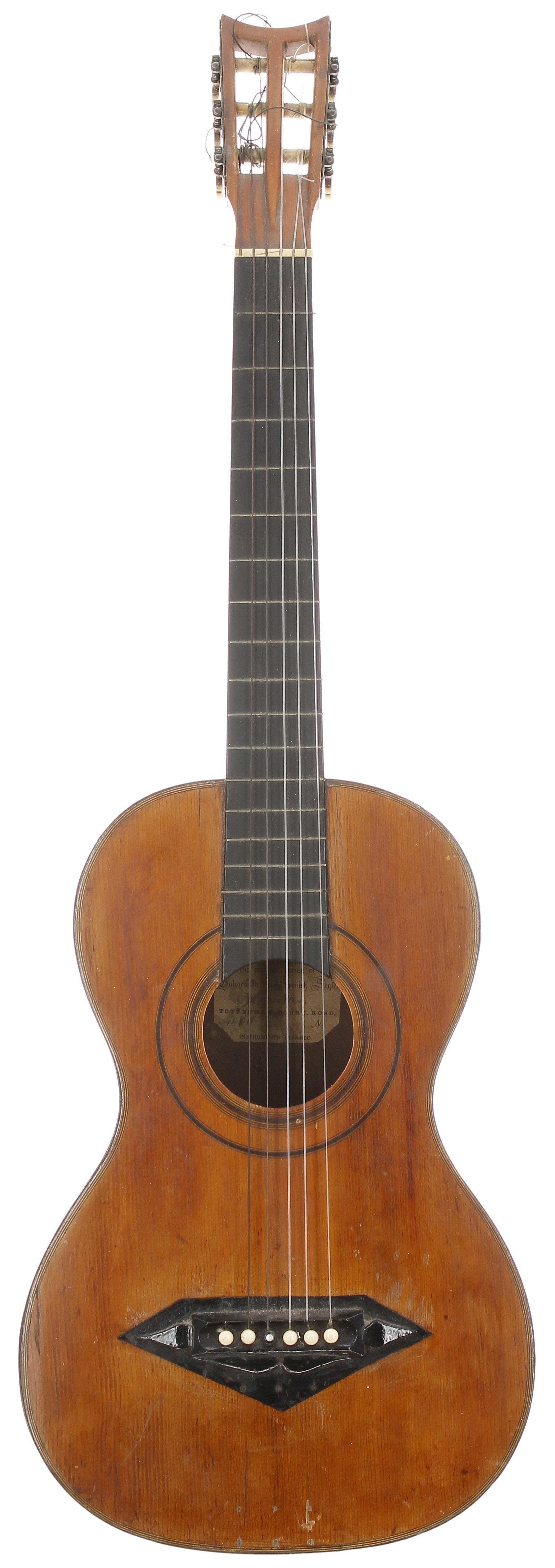 1860 George Louis Panormo guitar, made in England; Back and sides: coromandel four piece back, many repaired cracks to the sides - some of which are opening, revarnished; Top: fine grain spruce, a few minor cracks, revarnishing, bridge restorations; Neck: cedar, age related wear throughout; Frets: worn, tarnished and in need of some attention; Hardware: Baker engraved brass tuners with shaped buttons; Nut width: 48mm; Scale length: 630mm; Overall condition: fair