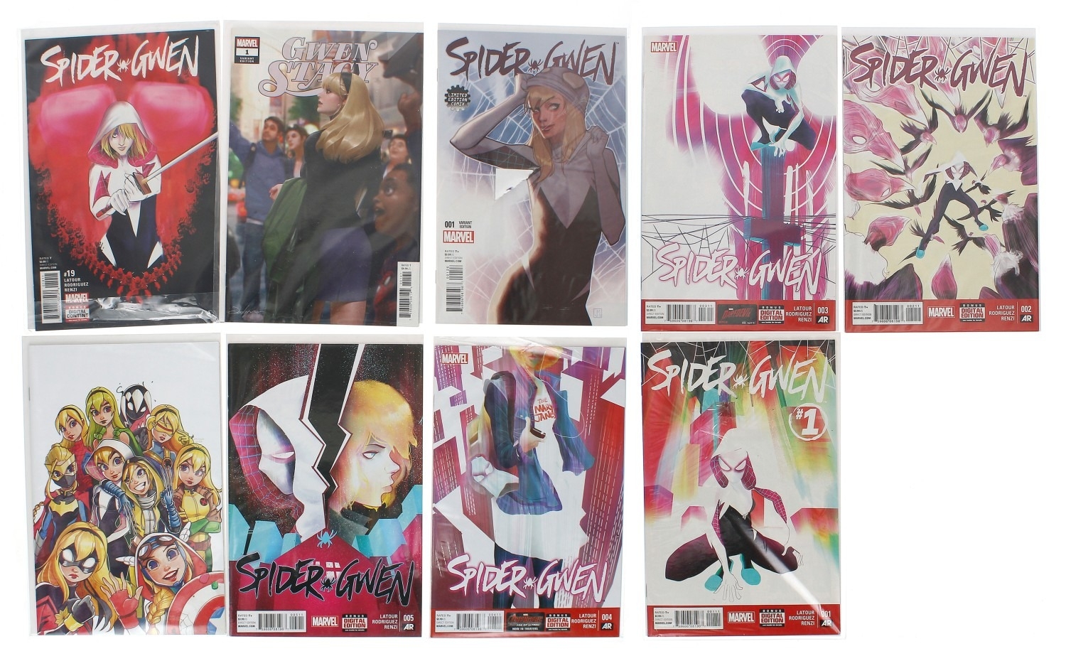 Marvel Comics, Spider-Gwen issue 001, circa 2015, key issue first issue of titled series by Jason Latour, together with a further four issues from Latour's run to include #2, #3, #4, #5 (complete set), together with four other Spider-Gwen related comics to feature #19 , #1 (Gwen Stacy Jeehyung Lee Variant), #1 (Limited Edition Comix Edition) & #1 (Chrissie Zullo MEGACON 2022 Virgin Variant), (9)