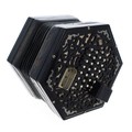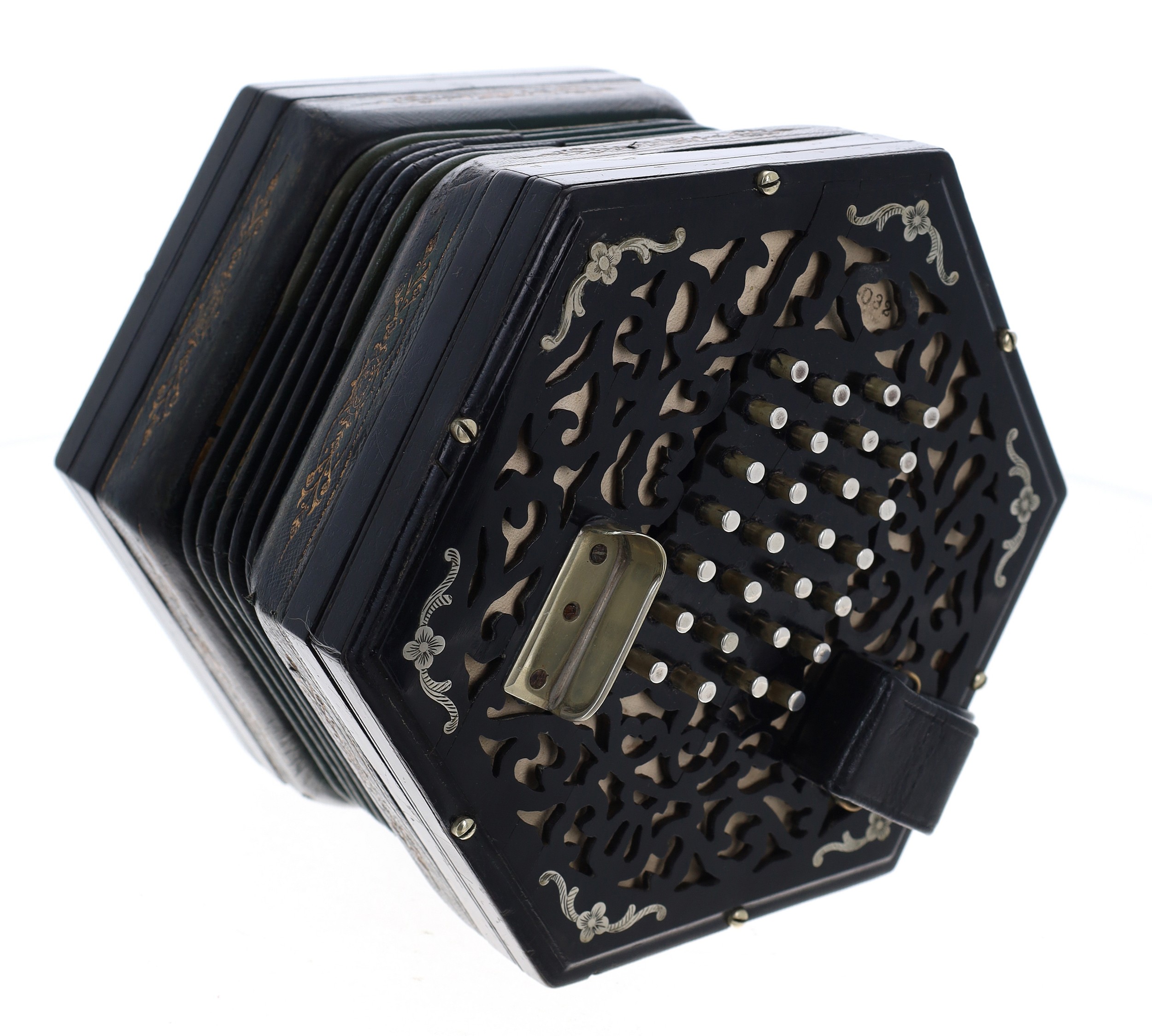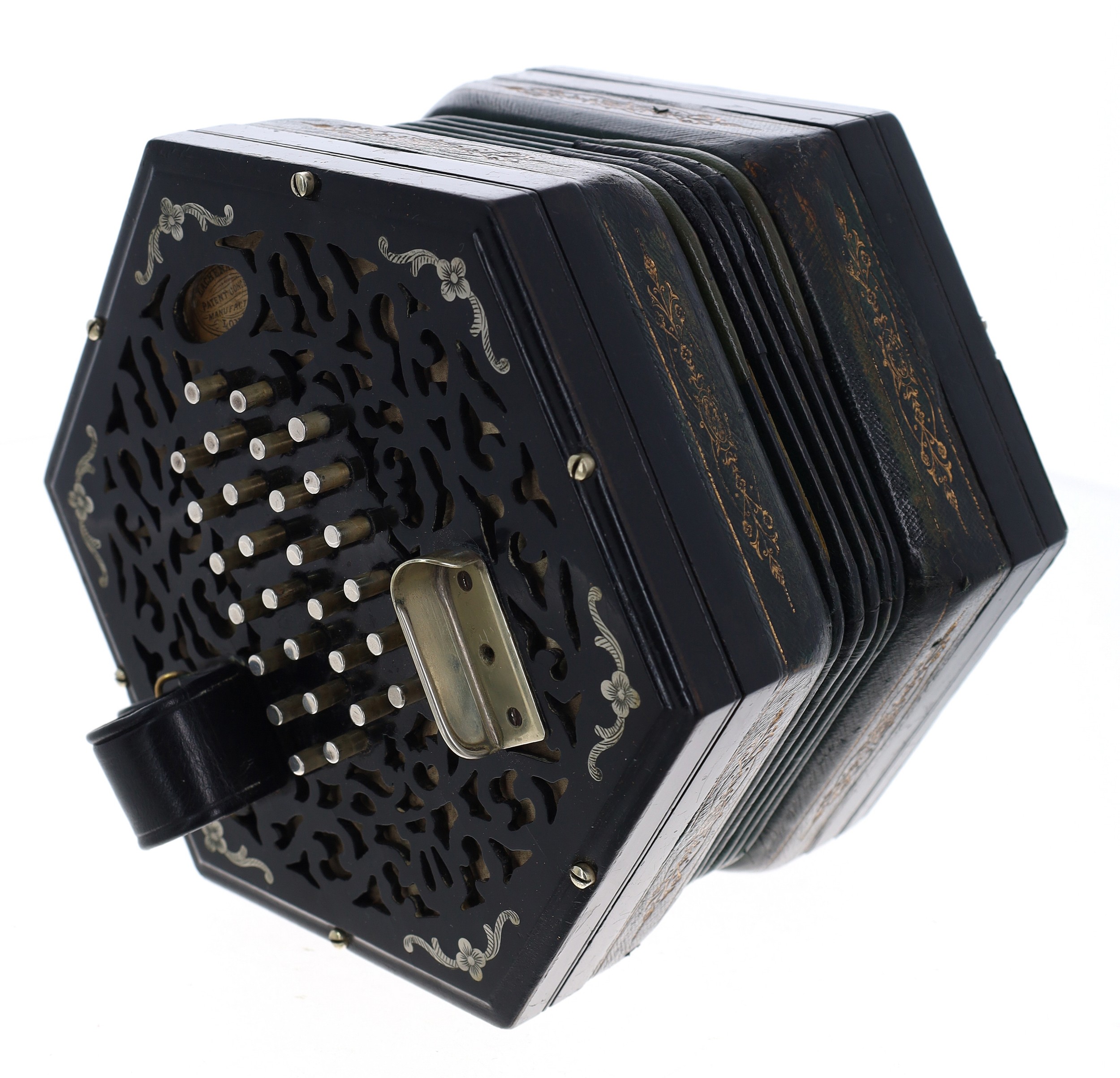 Good Lachenal & Co concertina, with fifty-six metal buttons on foliate pierced wooden ends, fitted with two nickel thumb plates and five-fold bellows, ser. no. 24032, rosewood case