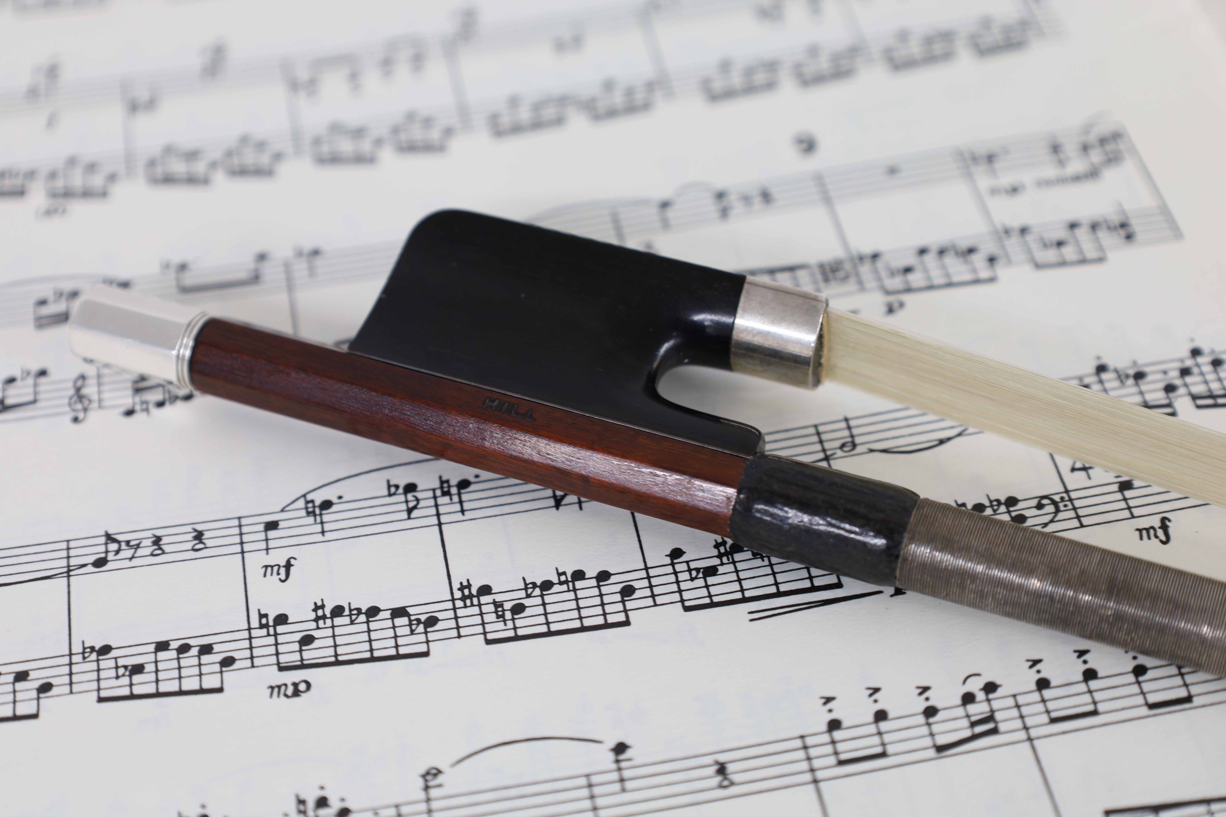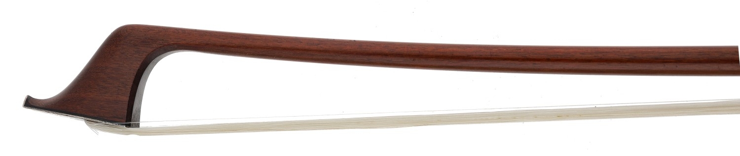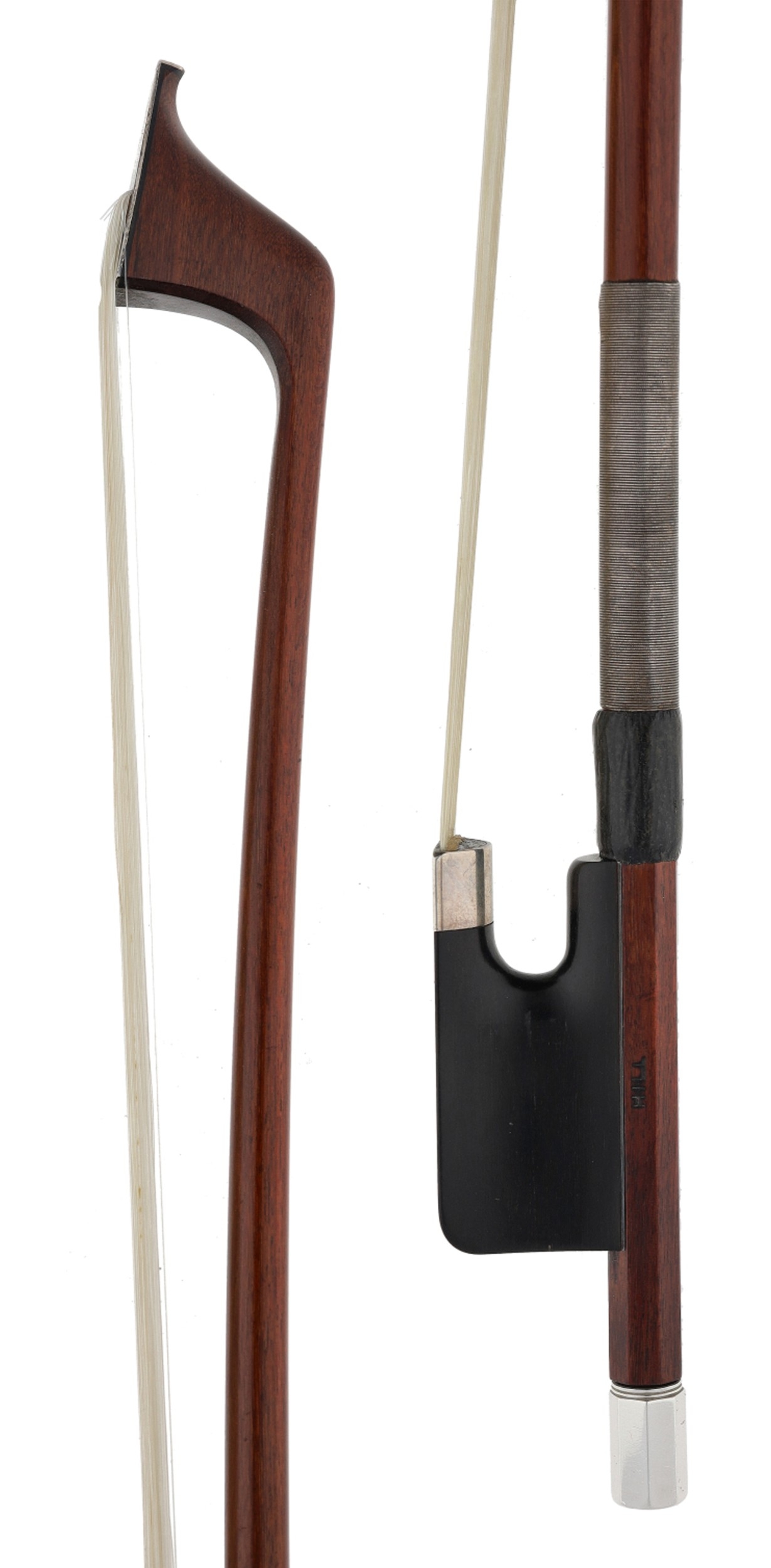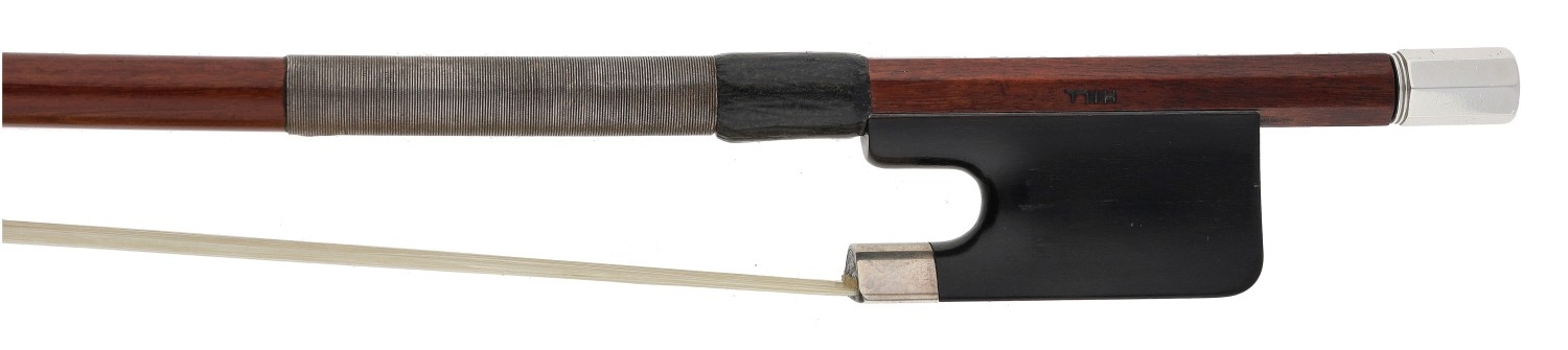 PRIVATE COLLECTION - English silver mounted violoncello bow by W.E. Hill & Sons stamped Hill (Edgar Bishop), the stick round, the ebony frog plain and with a silver overlaid ebony adjuster, 71gm