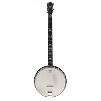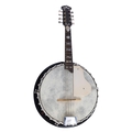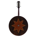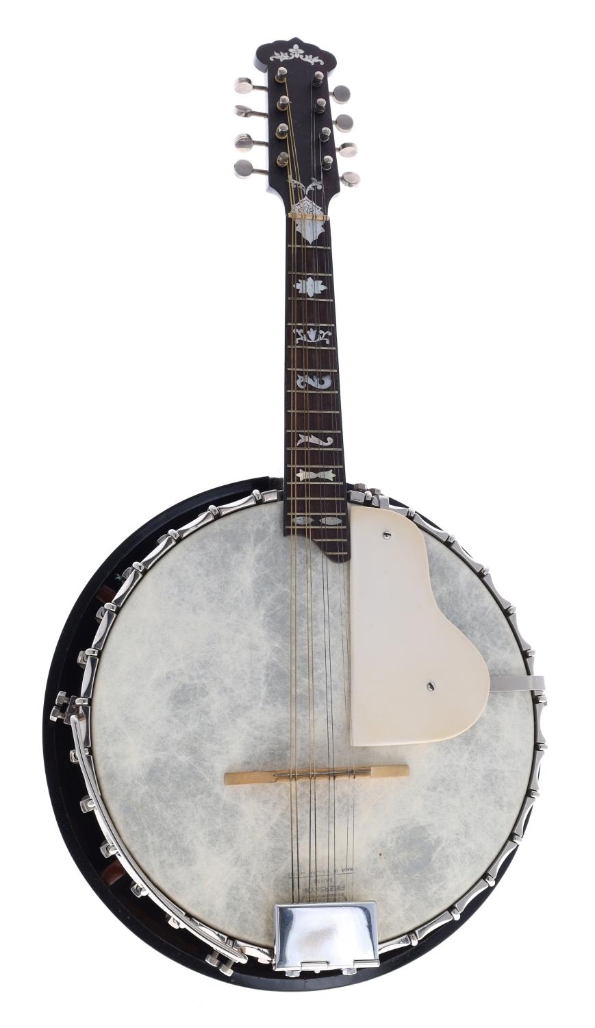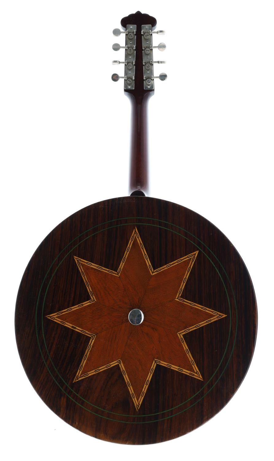 Good banjo mandolin, unnamed, the rosewood resonator inlaid with a large star within chevron and green line banding, with 11" skin, geometric mother of pearl inlay to the fretboard and head, case