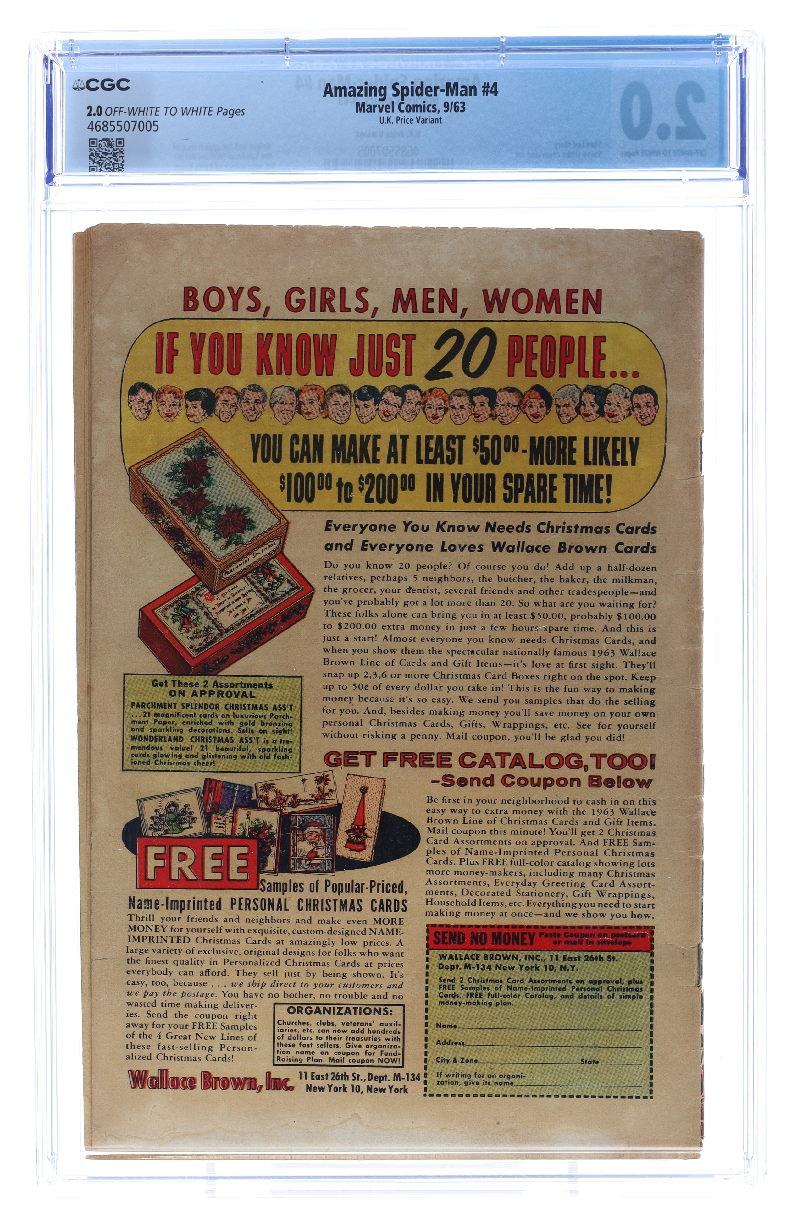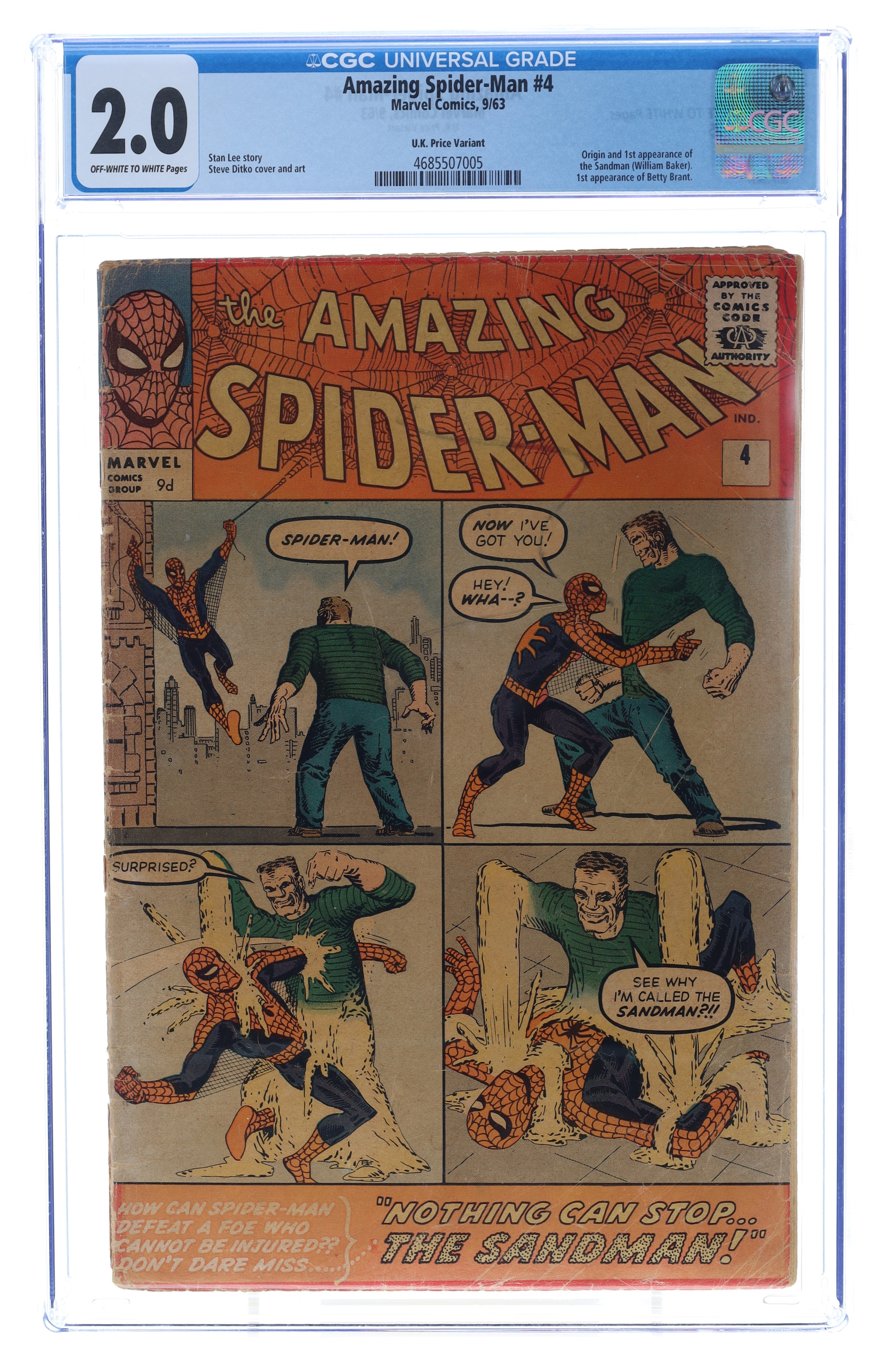 The Amazing Spider-Man issue #4 'Nothing can stop the Sandman', circa 1963, CGC grade 2.0, key issue, off-white to white pages, UK pence edition, first appearance of The Sandman & Betty Brant, artist by Steve Dikto, story by Stan Lee