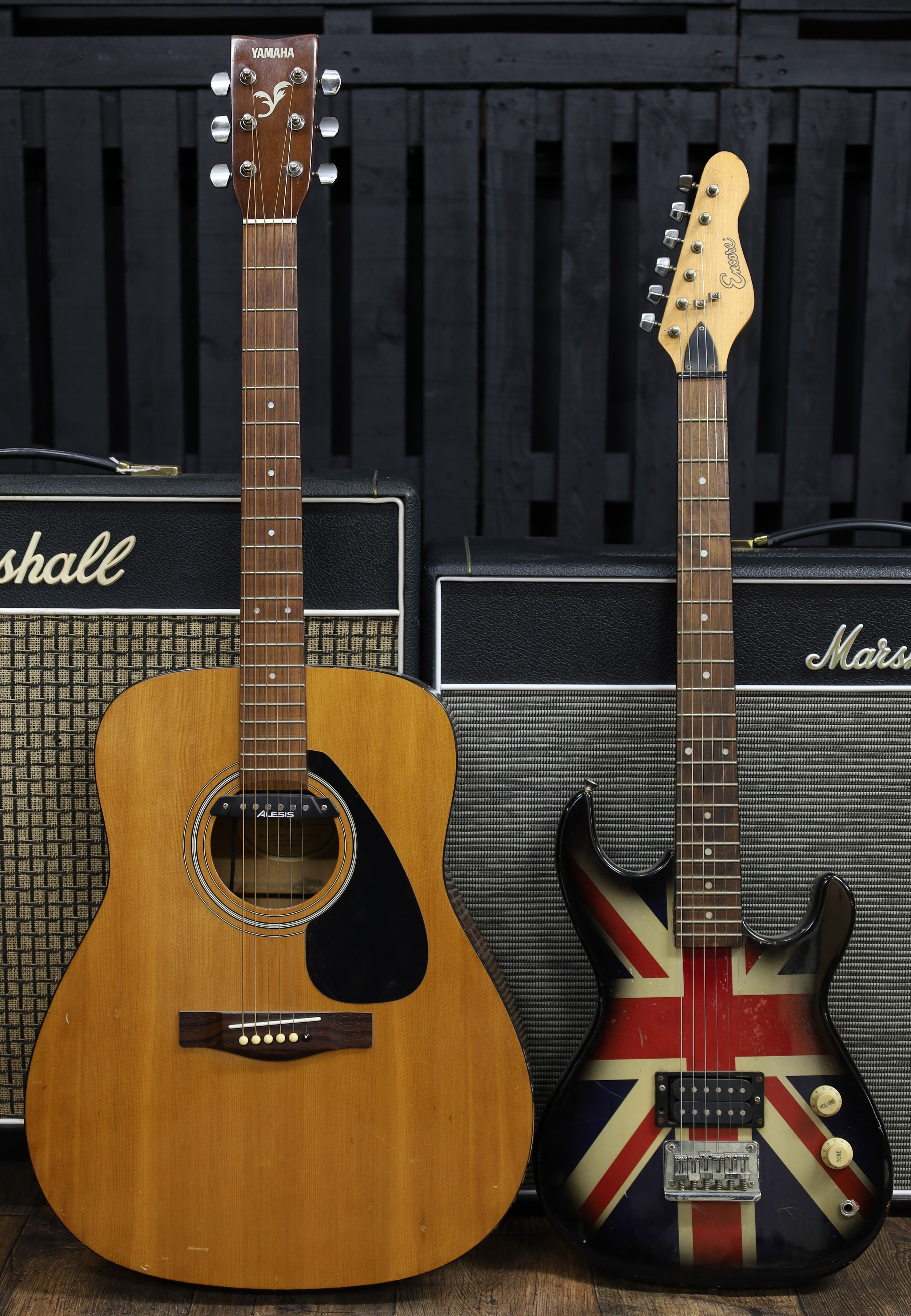 Yamaha F-310 acoustic guitar fitted with Alesis sound hole pickup (various imperfections); together with an Encore short scale electric guitar with Union Jack finish (imperfections) (2)