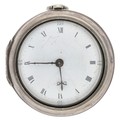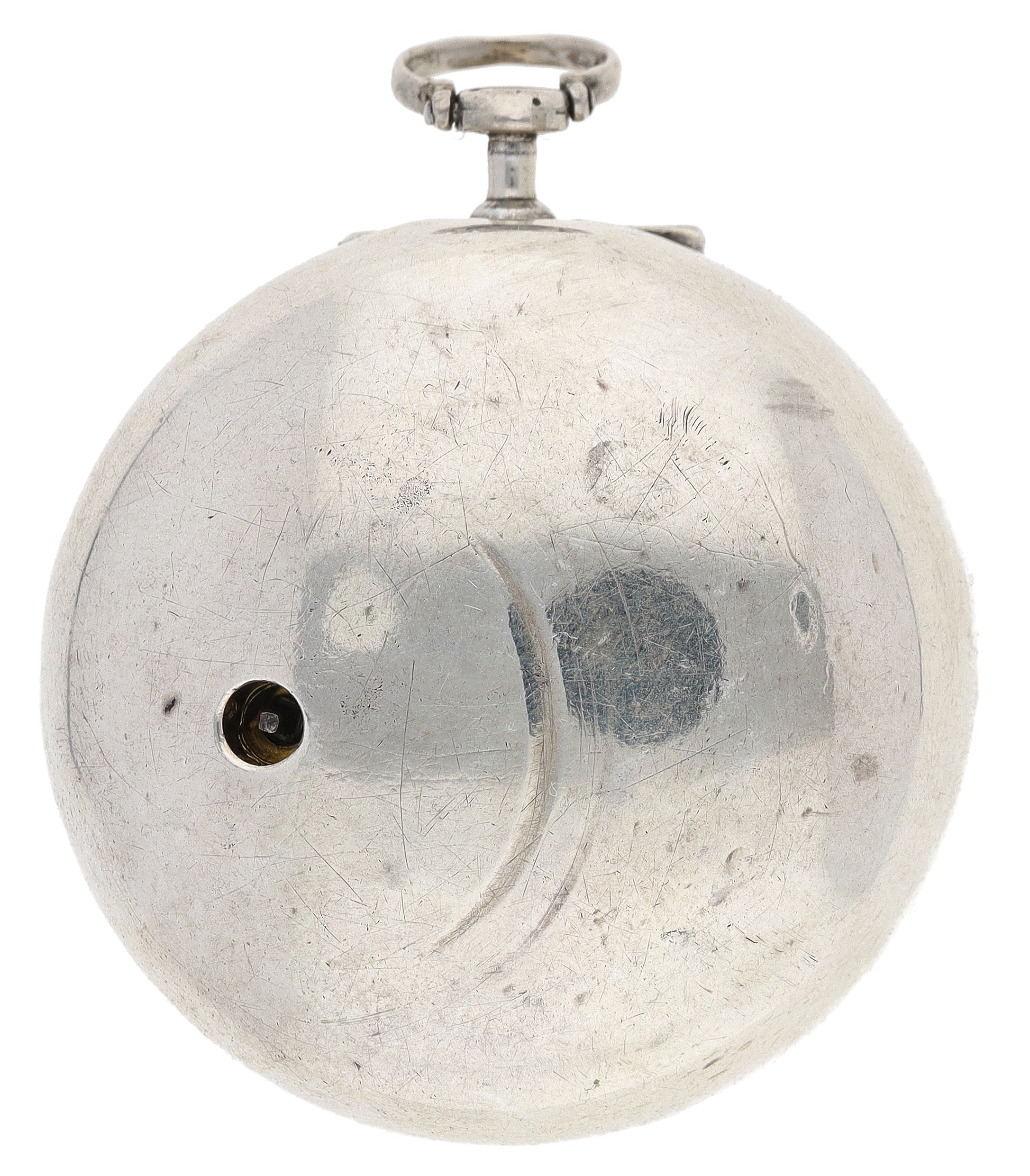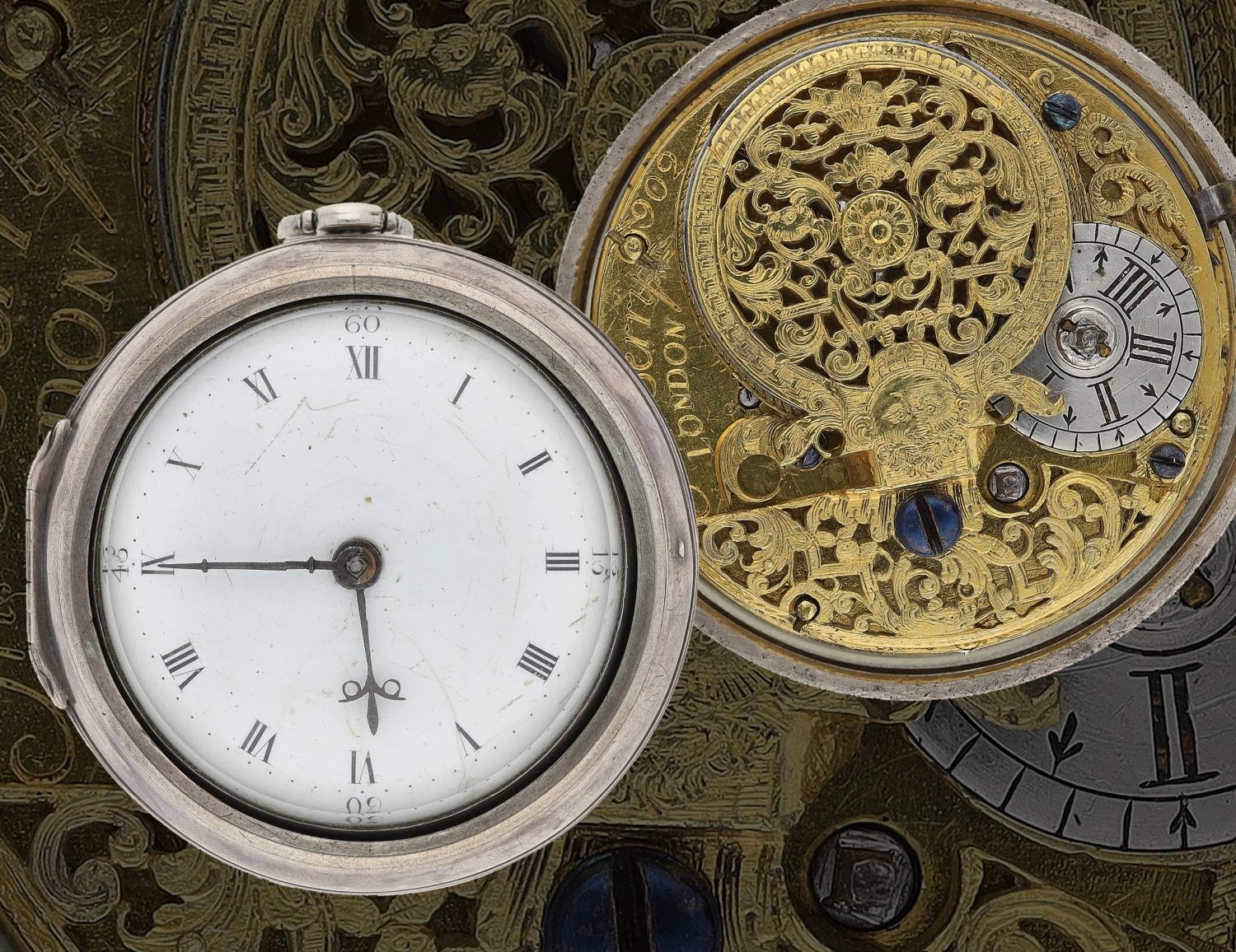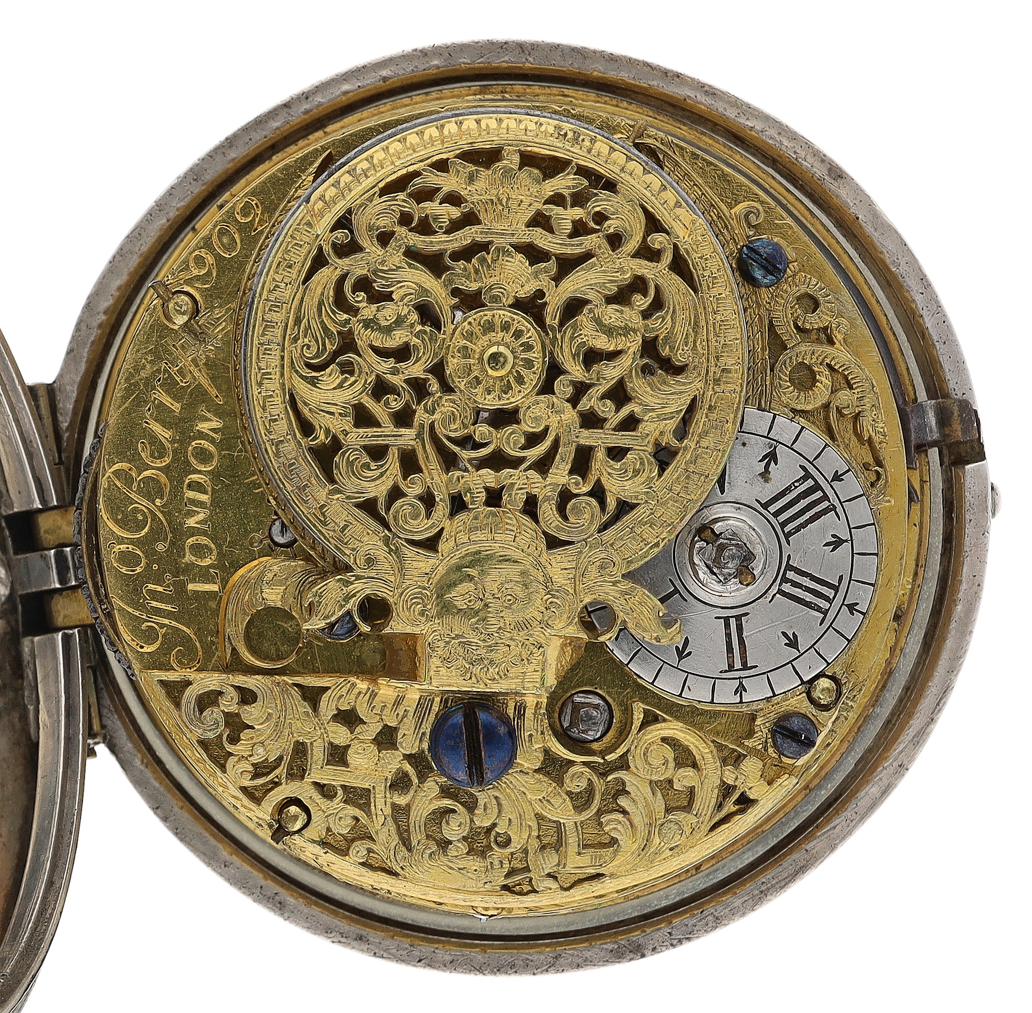 John Berry, London - George I silver pair cased verge pocket watch, No. 909, London 1716, signed fusee movement with ornate Egyptian pillars, engraved and pierced winged balance cock, with foliage engraving and mask to the centre, flat steel balance and silvered regulating dial, white enamel dial with Roman numerals and outer Arabic minute markers, beetle and poker hands, bullseye glass, original numbered matching cases, case maker 'WI', 56.5mm