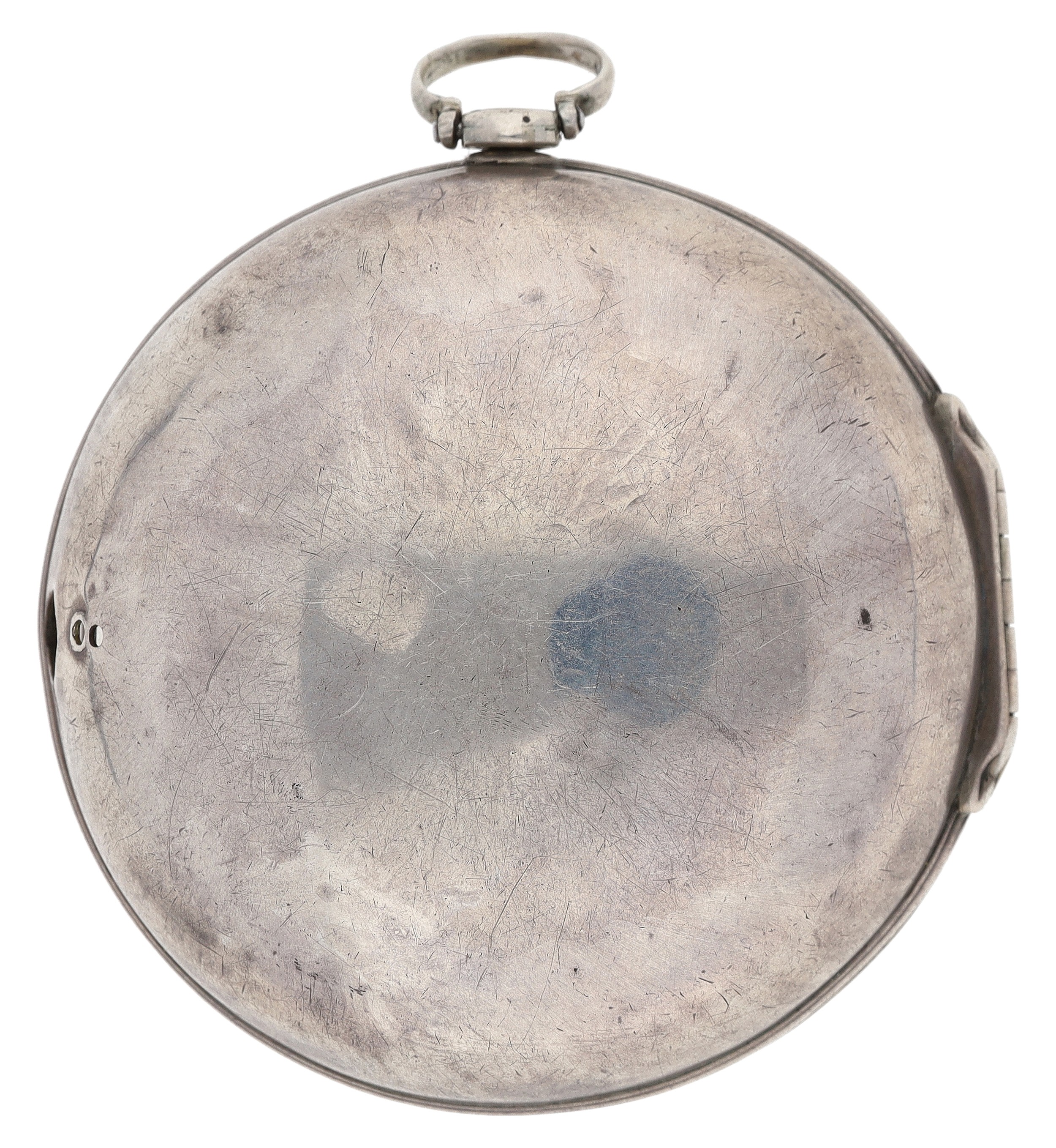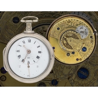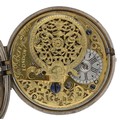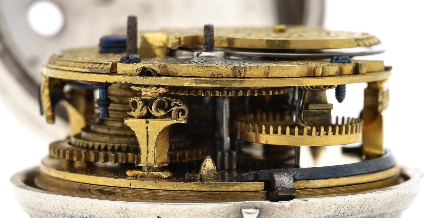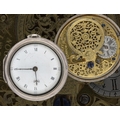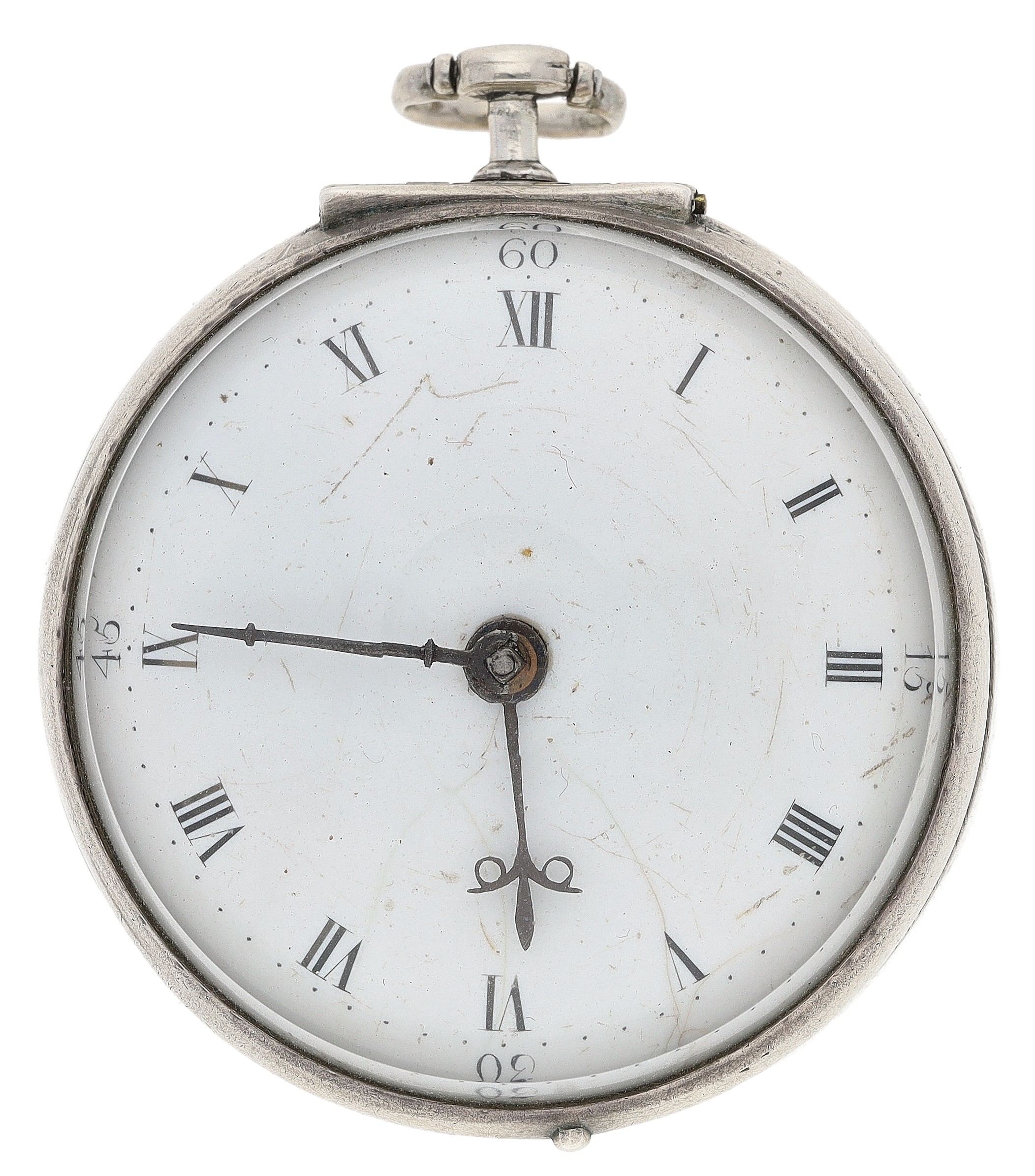 John Berry, London - George I silver pair cased verge pocket watch, No. 909, London 1716, signed fusee movement with ornate Egyptian pillars, engraved and pierced winged balance cock, with foliage engraving and mask to the centre, flat steel balance and silvered regulating dial, white enamel dial with Roman numerals and outer Arabic minute markers, beetle and poker hands, bullseye glass, original numbered matching cases, case maker 'WI', 56.5mm